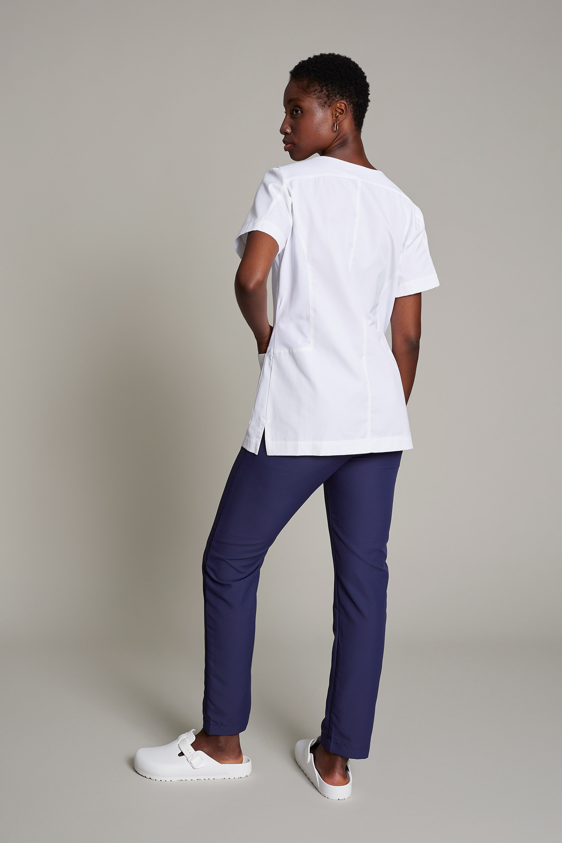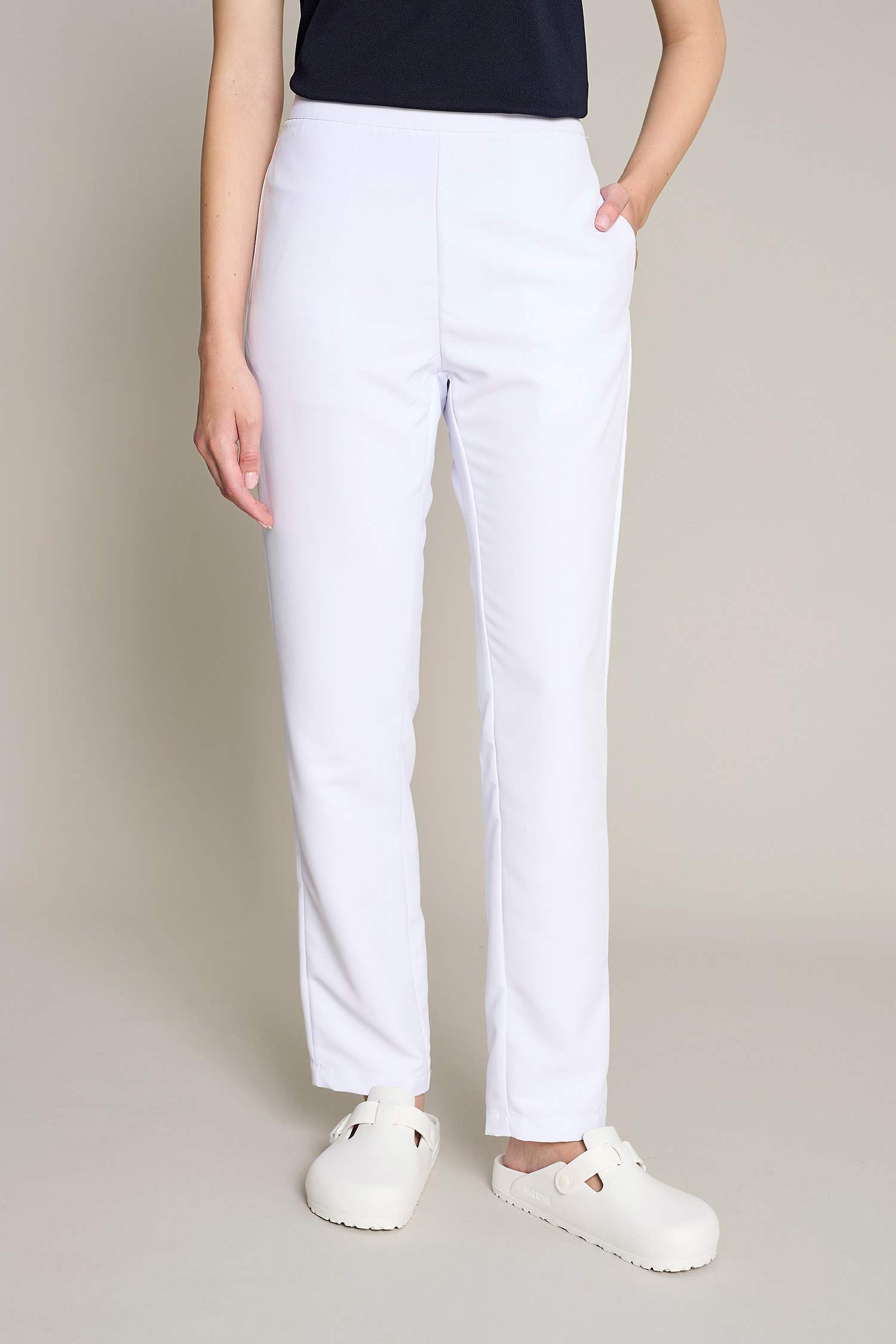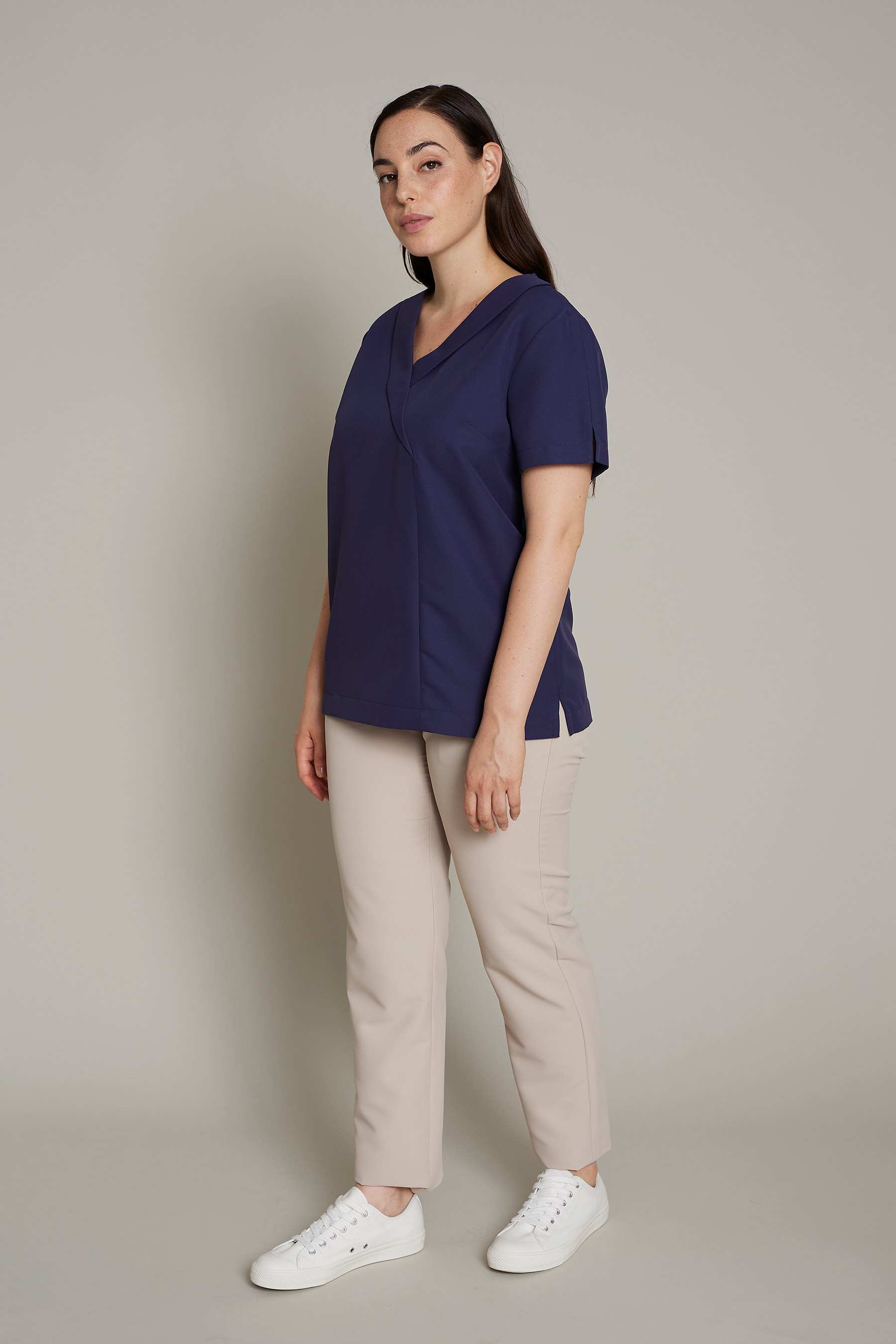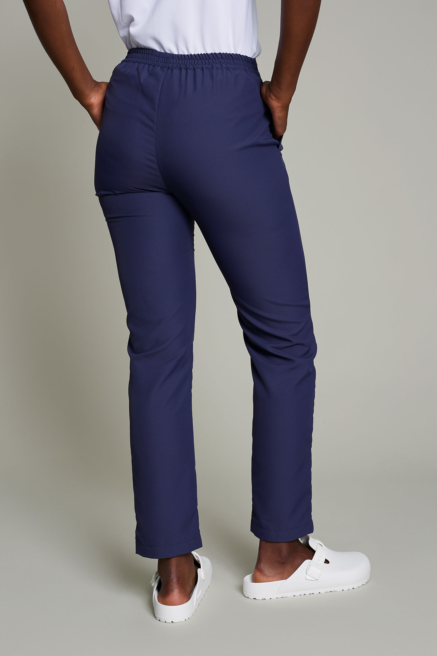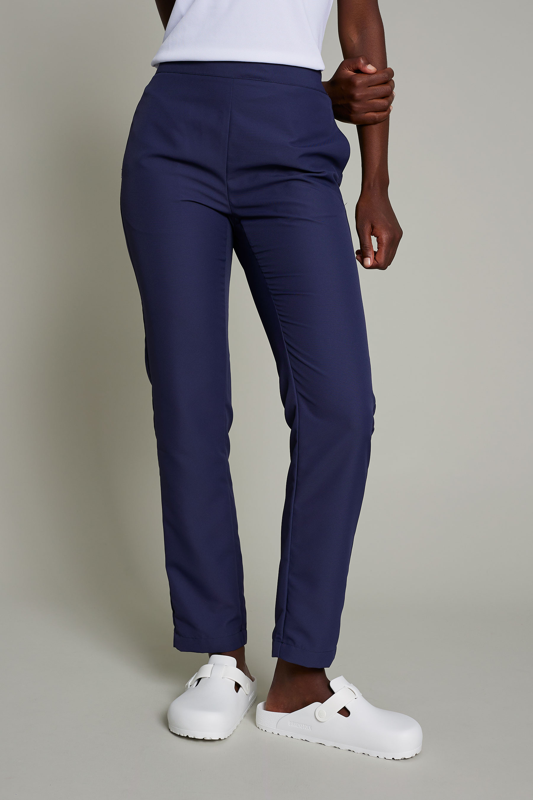 Pantalón Vilna de mujer en color azul con tejido de microfibra, que ofrece un máximo confort y estilo para el trabajo diario. No requiere plancha