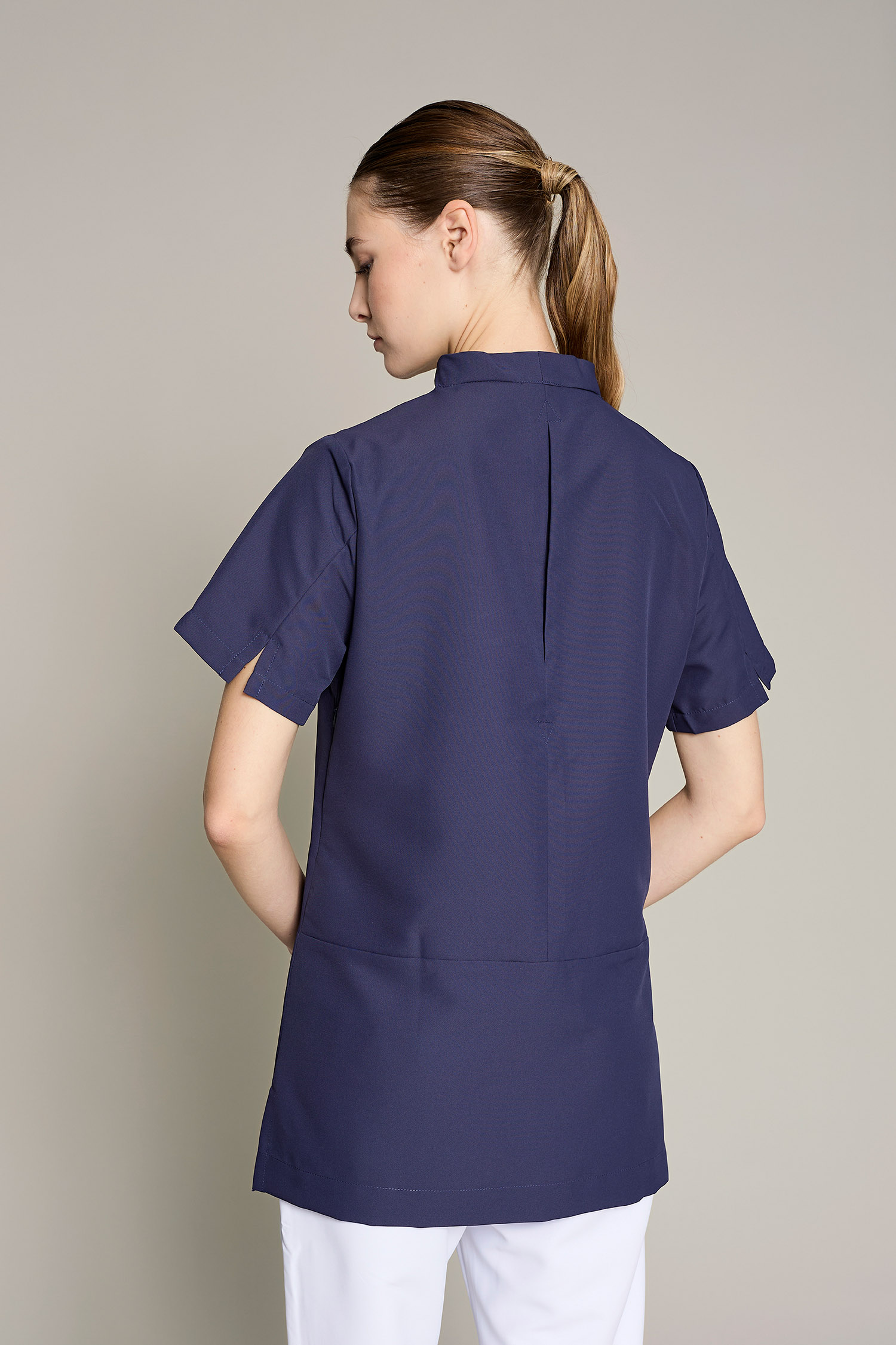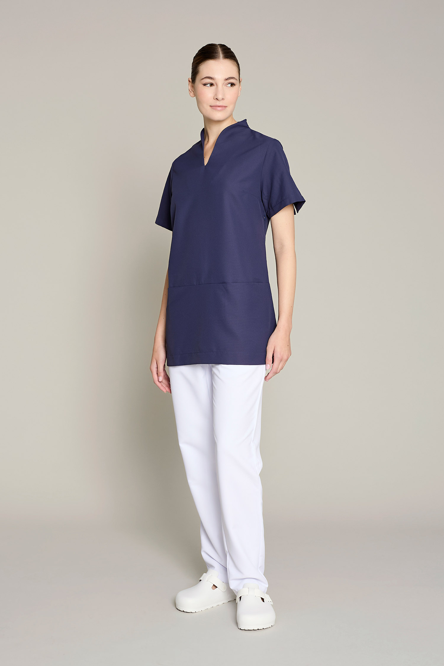 La túnica Ferrara de mujer en color blanco ha sido diseñada para profesionales del sector de limpieza, camareras/os de pisos u otras funciones que requieren máxima movilidad y confort. Fabricada en 100% poliéster, este modelo combina un diseño funcional con una estética cuidada que se aleja del típico uniforme convencional. Gracias a su gramaje de 150 g/m², proporciona la ligereza necesaria para moverse con libertad sin comprometer la durabilidad de la prenda. Tiene la certificación OEKO-TEX Standard 100 y su tejido técnico facilita la evacuación de la humedad, manteniendo la piel seca y libre de olores incluso en turnos prolongados. El acabado sin arrugas y de secado rápido elimina la necesidad de plancha, haciendo de esta prenda una opción ideal para el uso diario intensivo. Una propuesta pensada para profesionales que buscan uniformes que sena cómodoa, funcionales y con estilo