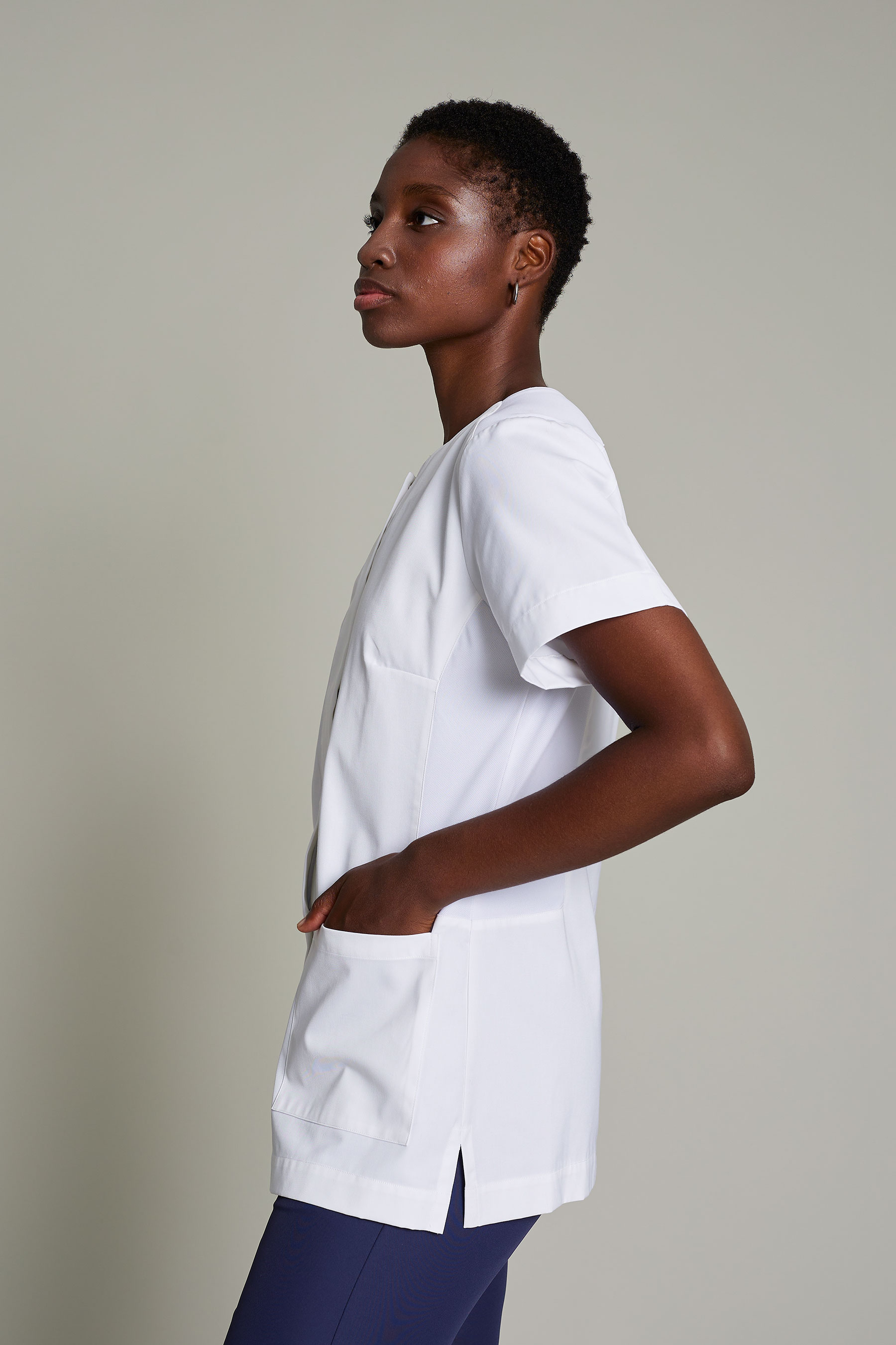 La túnica Irene de mujer en color azul ha sido diseñada para profesionales del sector de limpieza, camareras/os de pisos u otras funciones que requieren máxima movilidad y confort. Fabricada en 50% algodón orgánico 50% poliéster reciclado y coolmax 100% poliéster reciclado, este modelo combina un diseño funcional con una estética cuidada que se aleja del típico uniforme convencional. Gracias a su gramaje de 180 g/m², proporciona la ligereza necesaria para moverse con libertad sin comprometer la durabilidad de la prenda. El uso de poliéster reciclado refuerza el compromiso con la sostenibilidad sin sacrificar rendimiento. La certificación OEKO-TEX Standard 100, GOTS y GRS asegura una prenda segura, libre de sustancias nocivas y propiedades antibacterianas. Su tejido técnico facilita la evacuación de la humedad, manteniendo la piel seca y libre de olores incluso en turnos prolongados. Una propuesta pensada para profesionales que buscan uniformes que sean cómodos, funcionales y con estilo