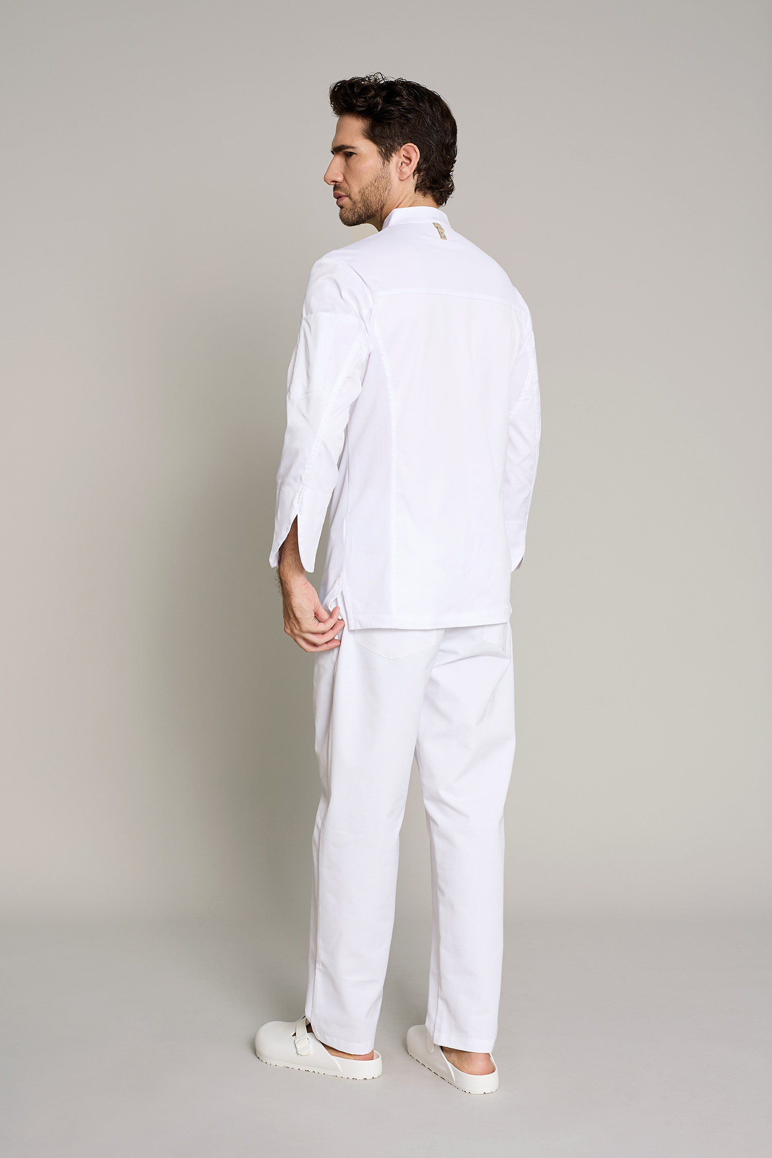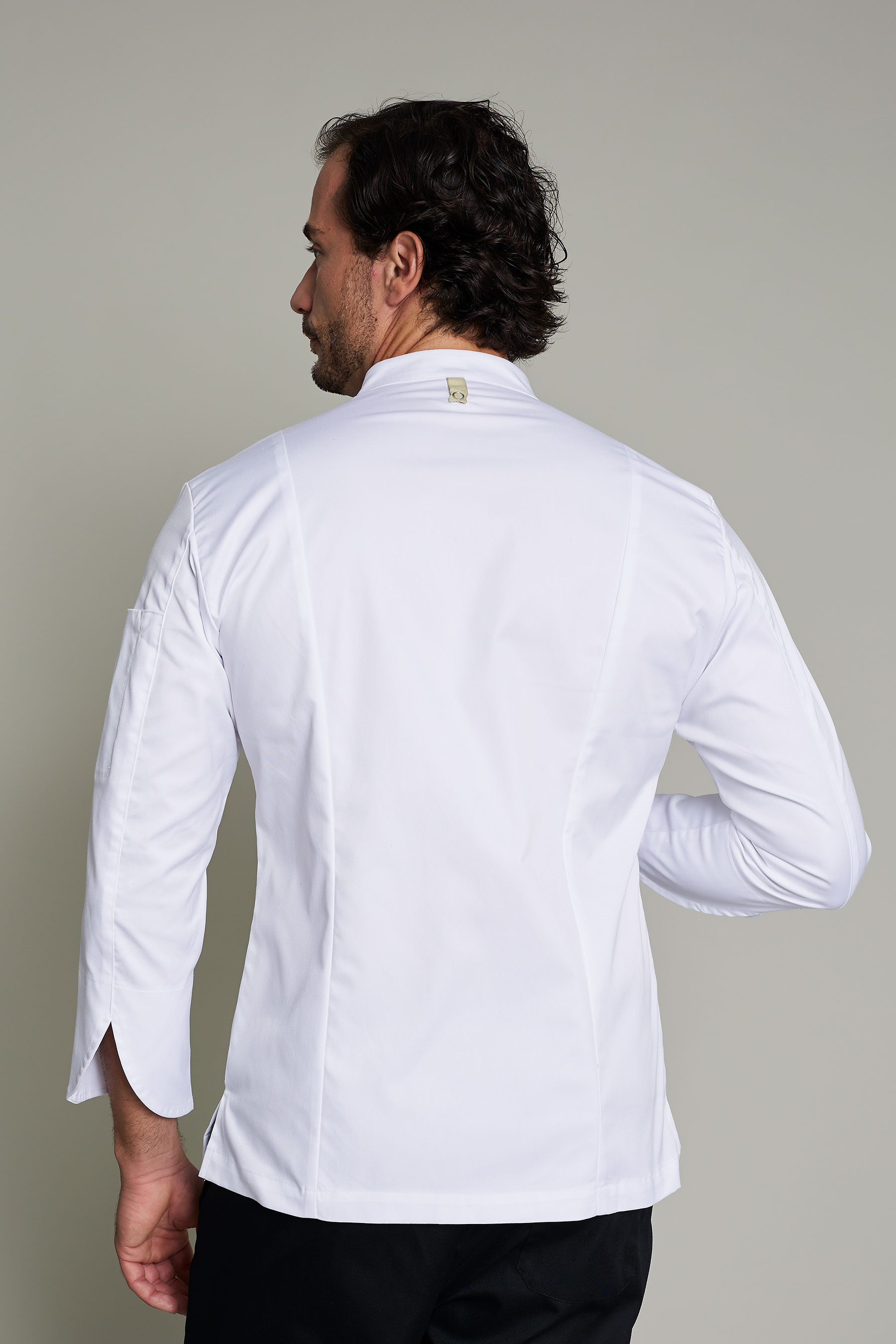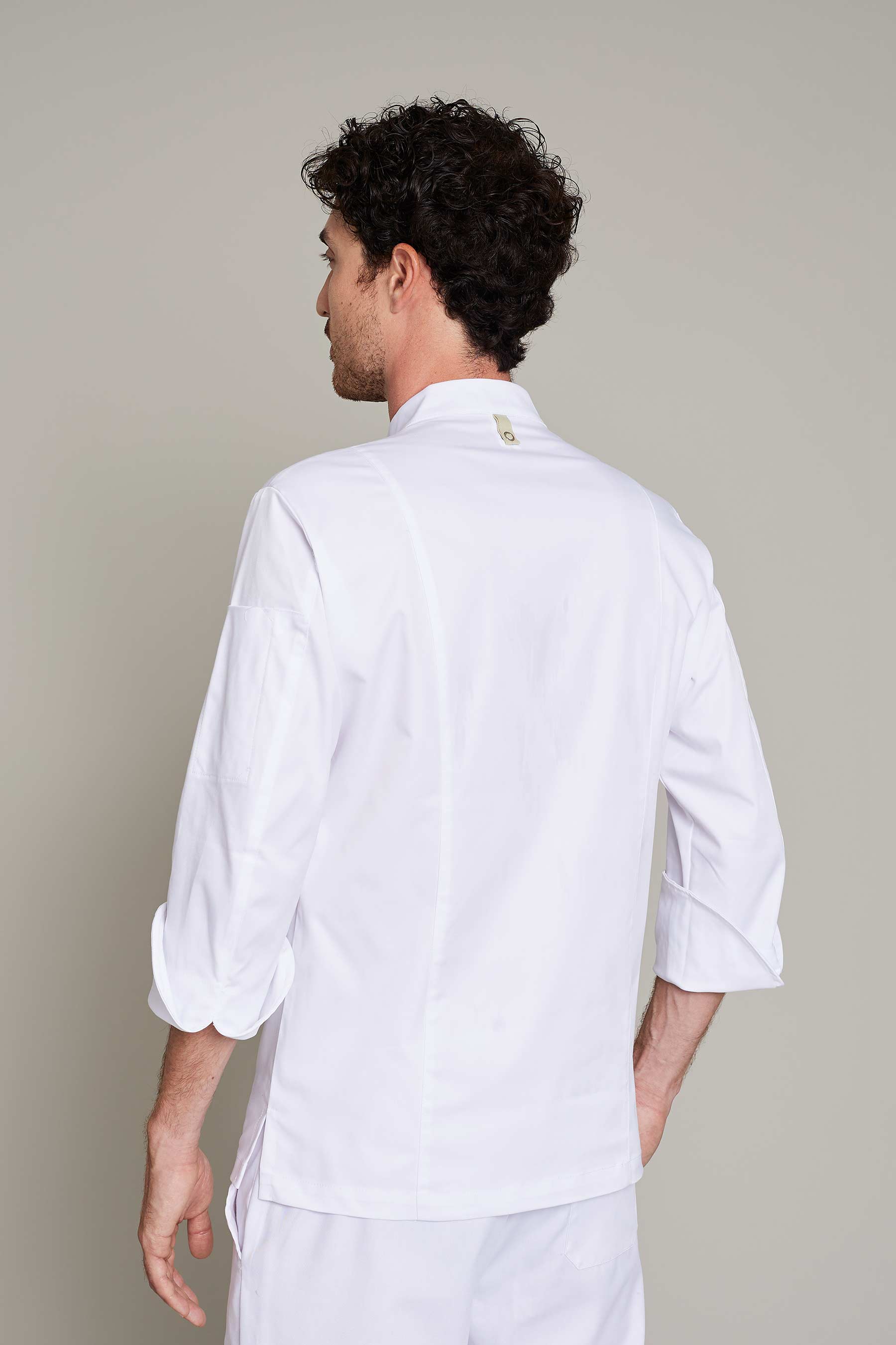 Casaca de cocina de hombre en color blanco con tejido reciclado que ofrece un máximo confort y libertad de movimiento