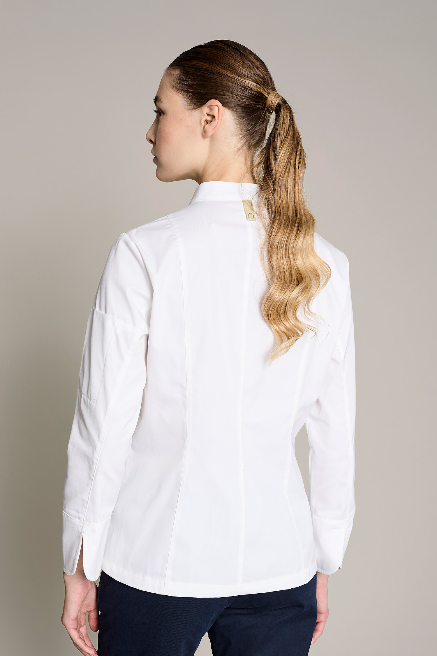 Casaca de cocina de mujer en color blanco con tejido reciclado que ofrece un máximo confort y libertad de movimiento