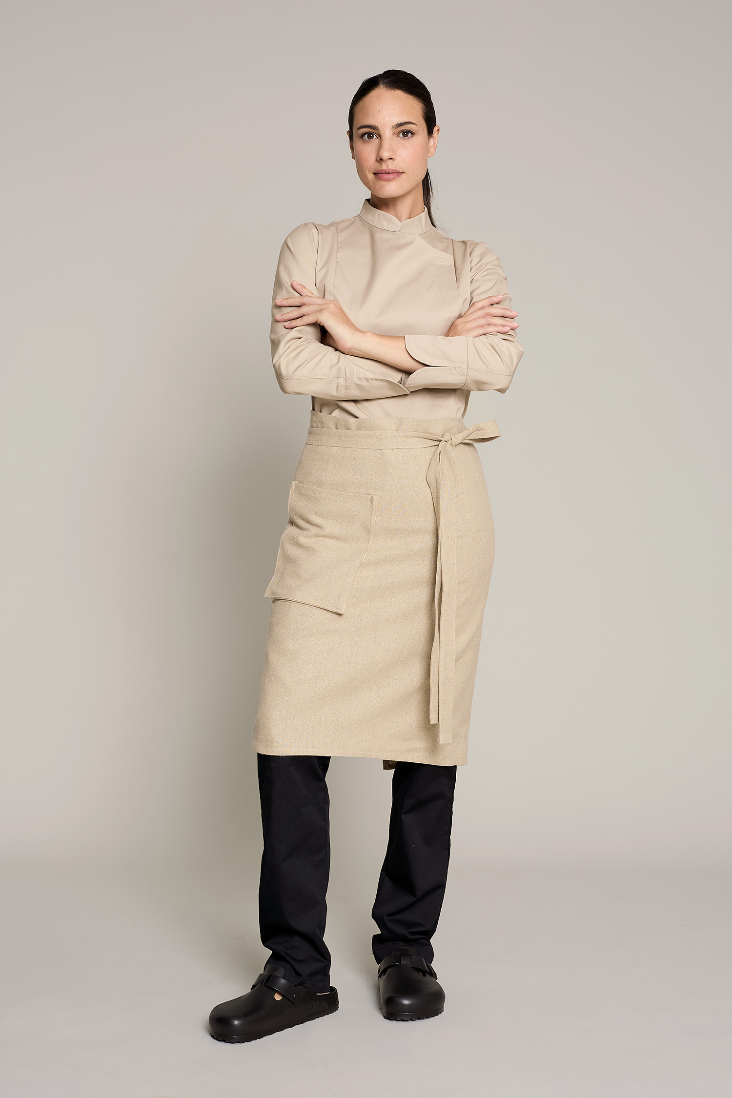 Casaca de cocina de mujer en color blanco con tejido orgánico y reciclado, que ofrece un máximo confort y sostenibilidad. No requiere plancha