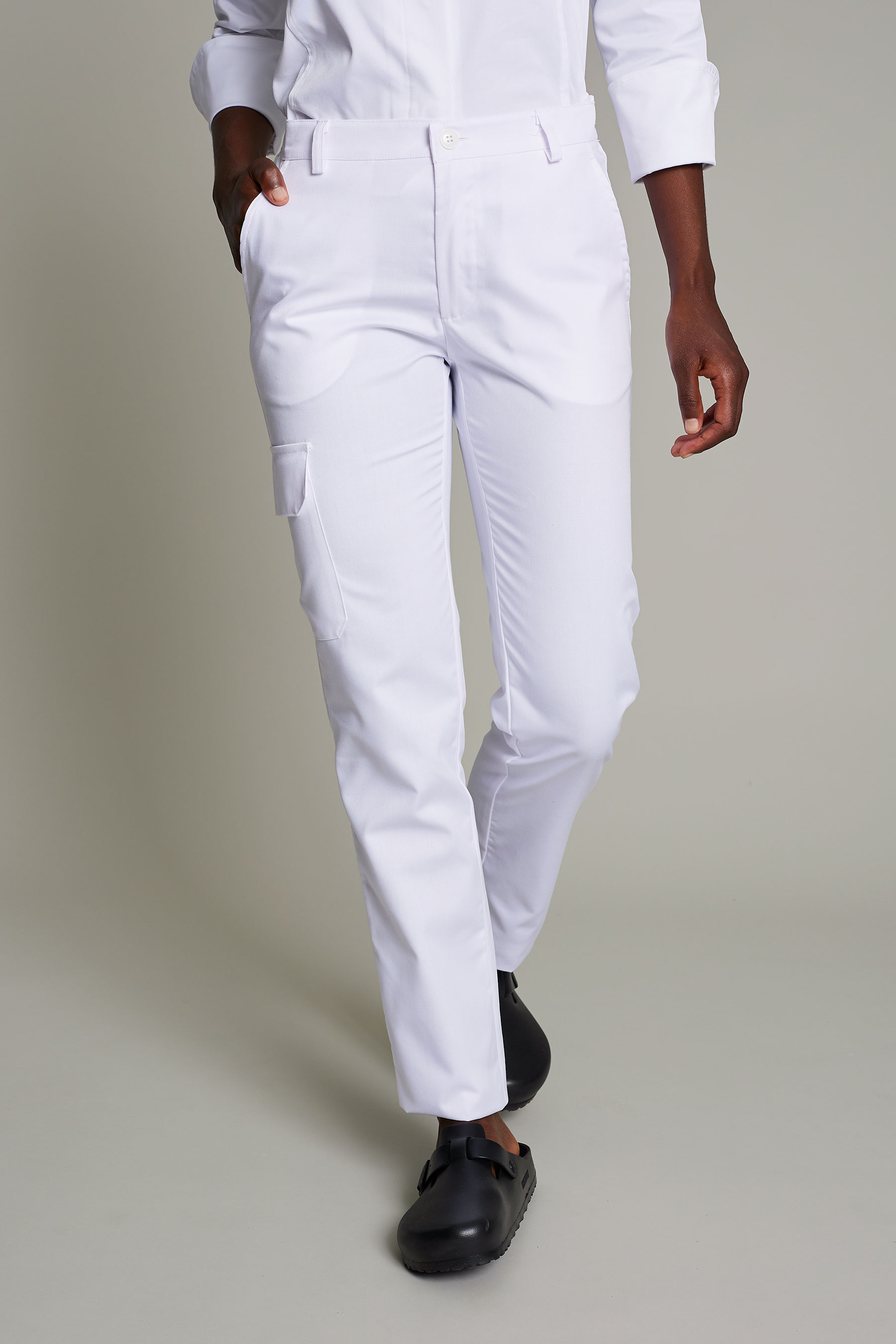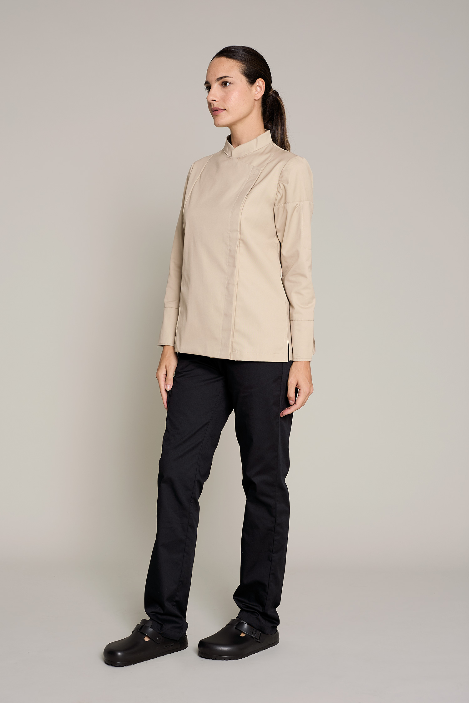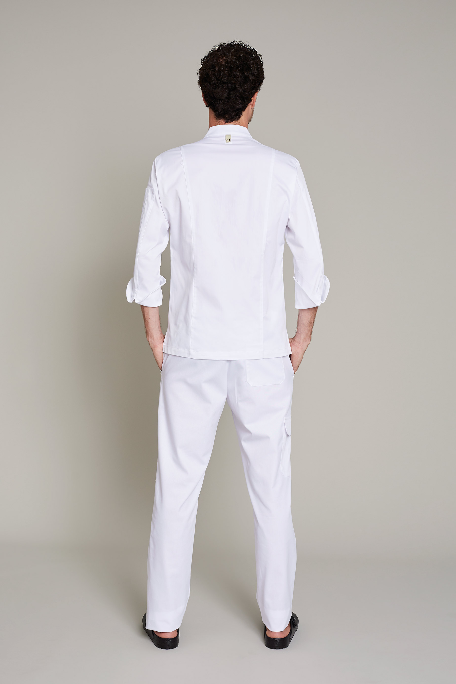 Casaca de cocina de mujer en color blanco con tejido reciclado que ofrece un máximo confort y libertad de movimiento