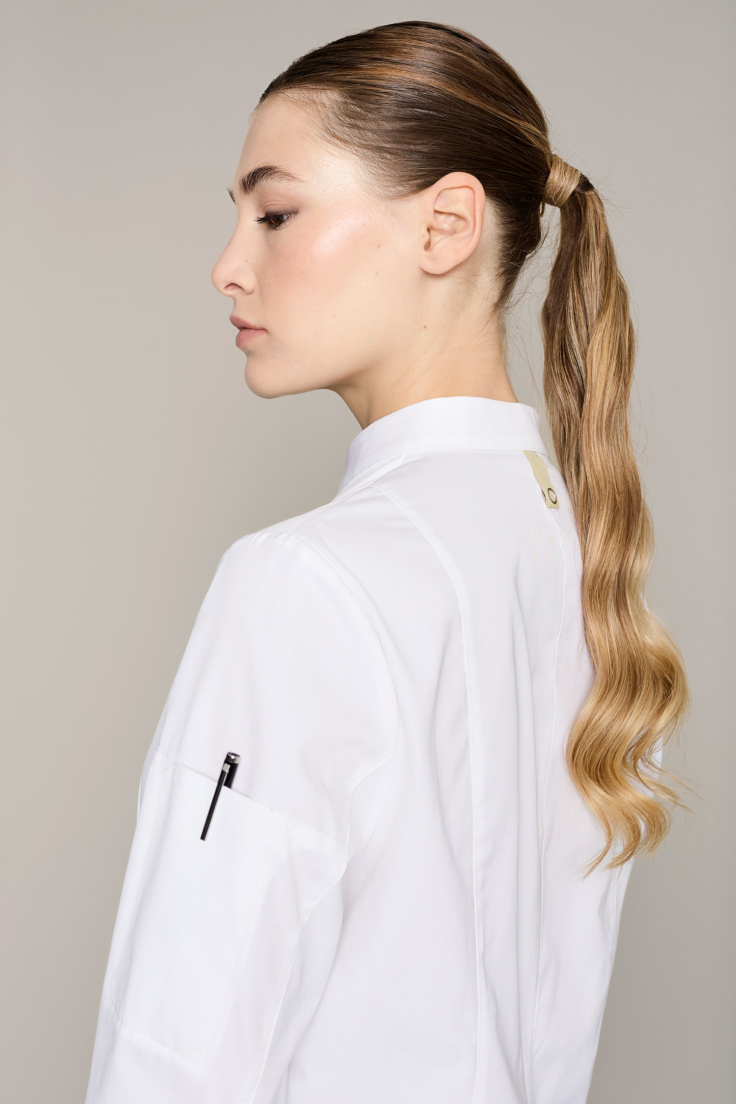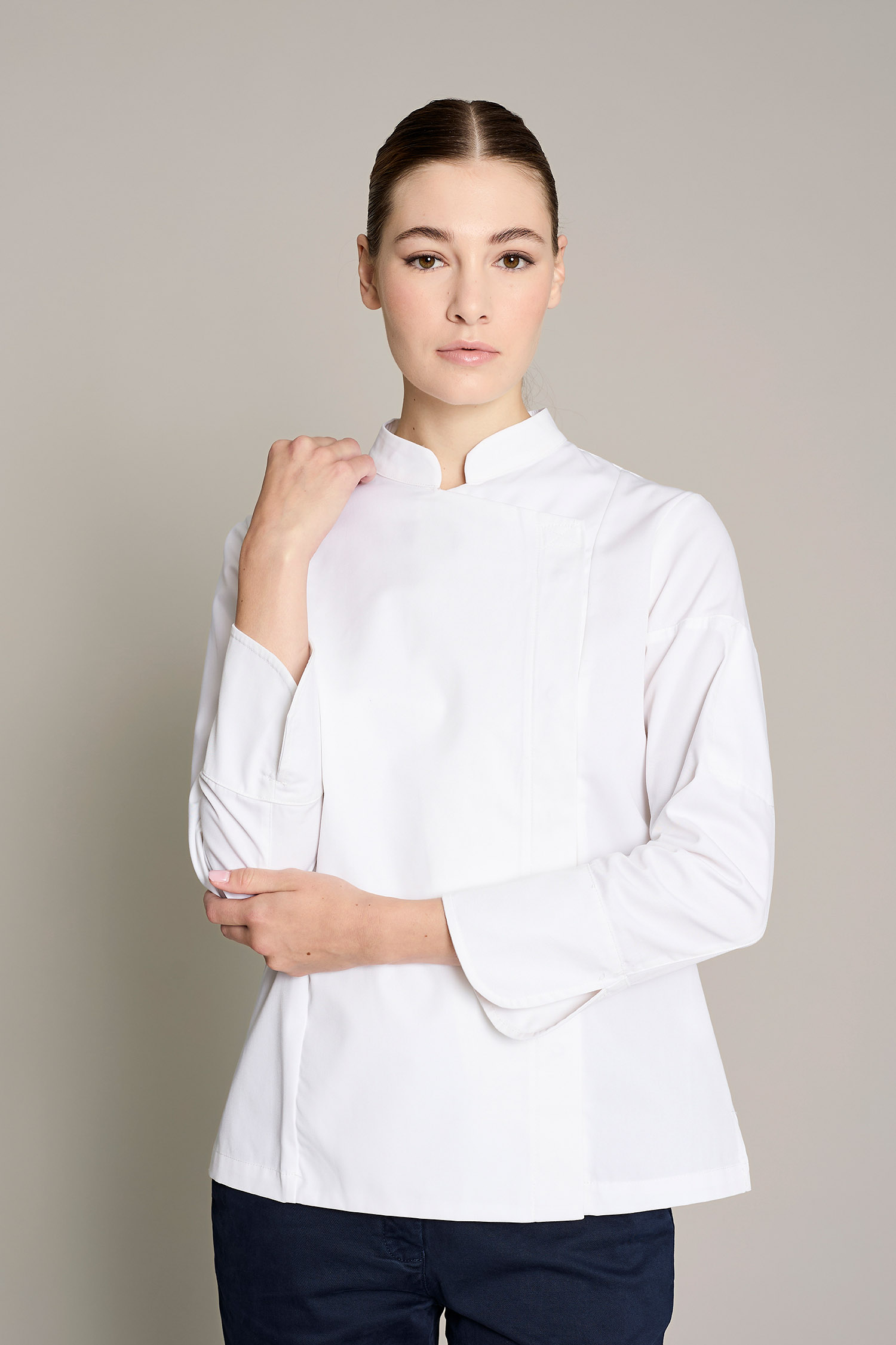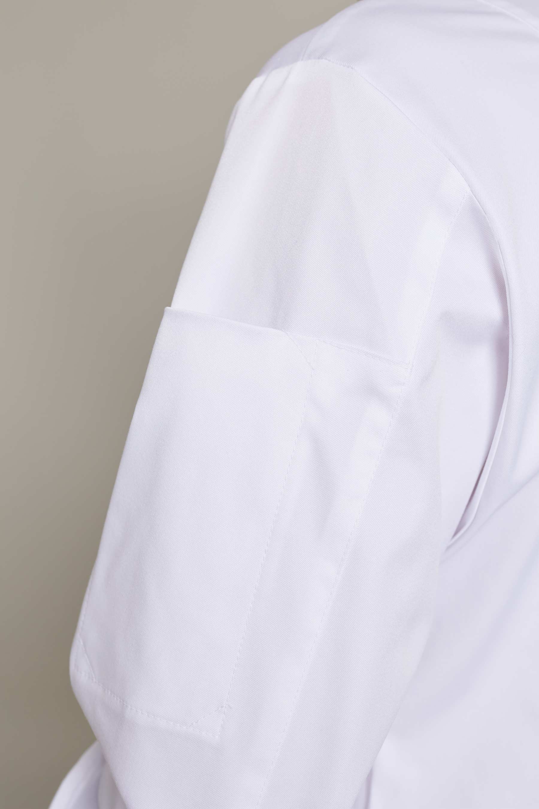 Casaca de cocina de mujer en color blanco con tejido reciclado que ofrece un máximo confort y libertad de movimiento
