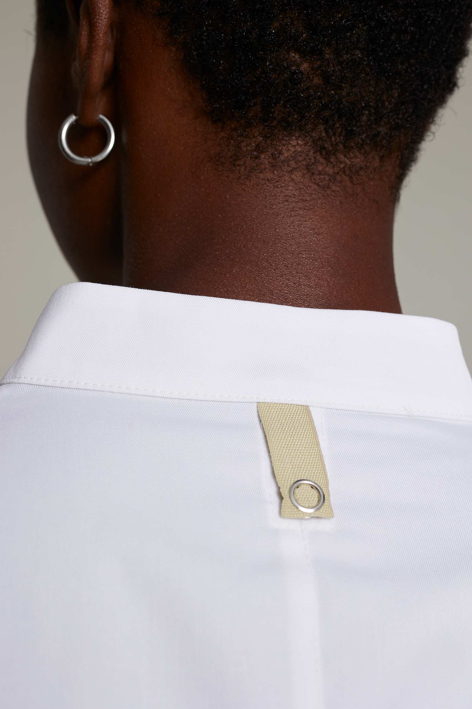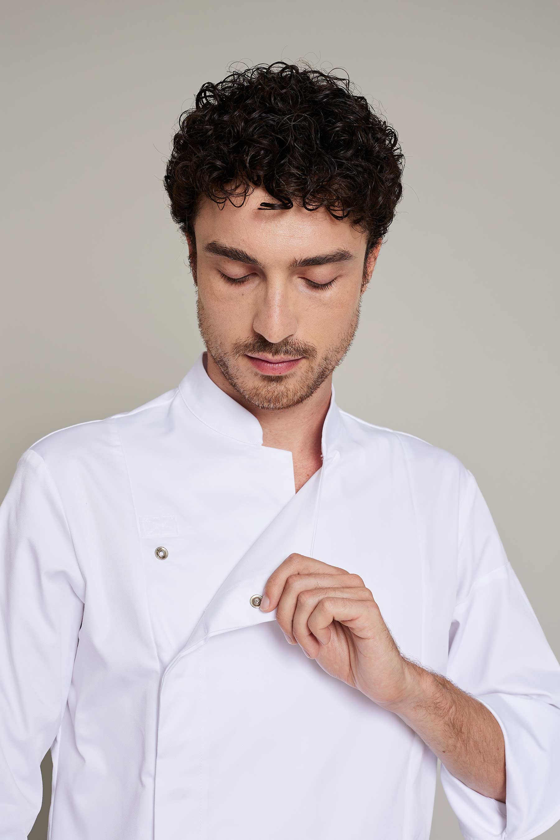 Casaca de cocina de hombre en color blanco con tejido reciclado que ofrece un máximo confort y libertad de movimiento