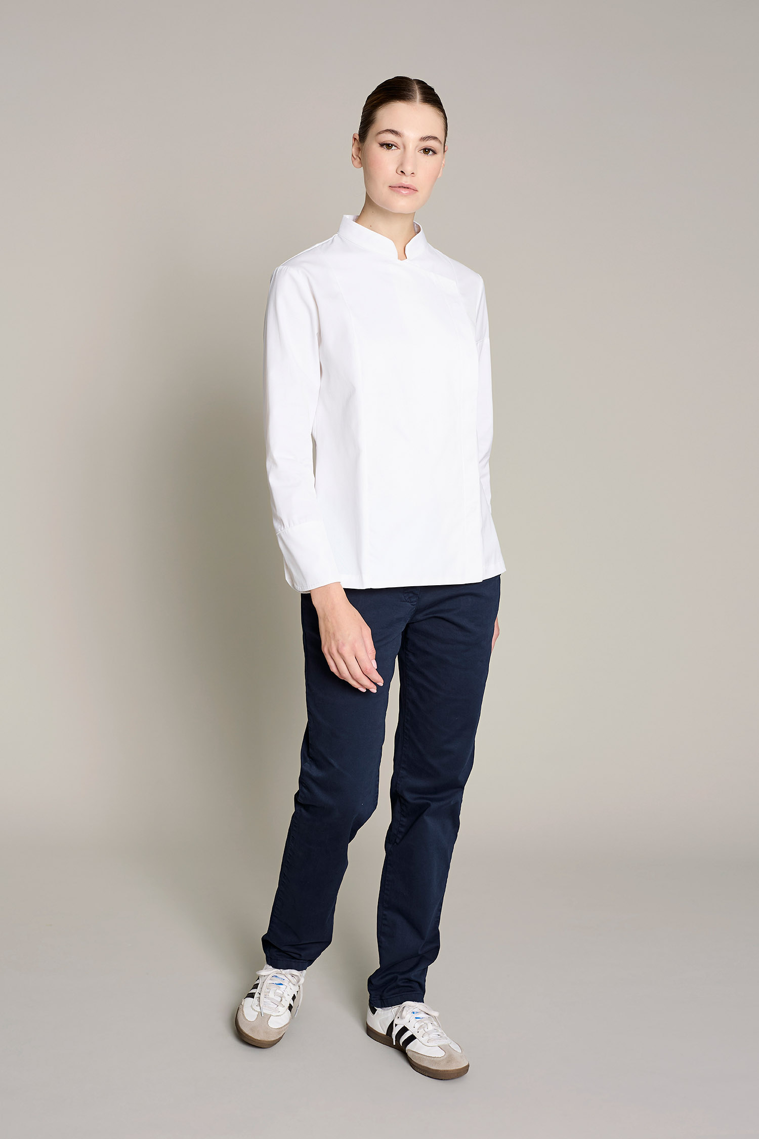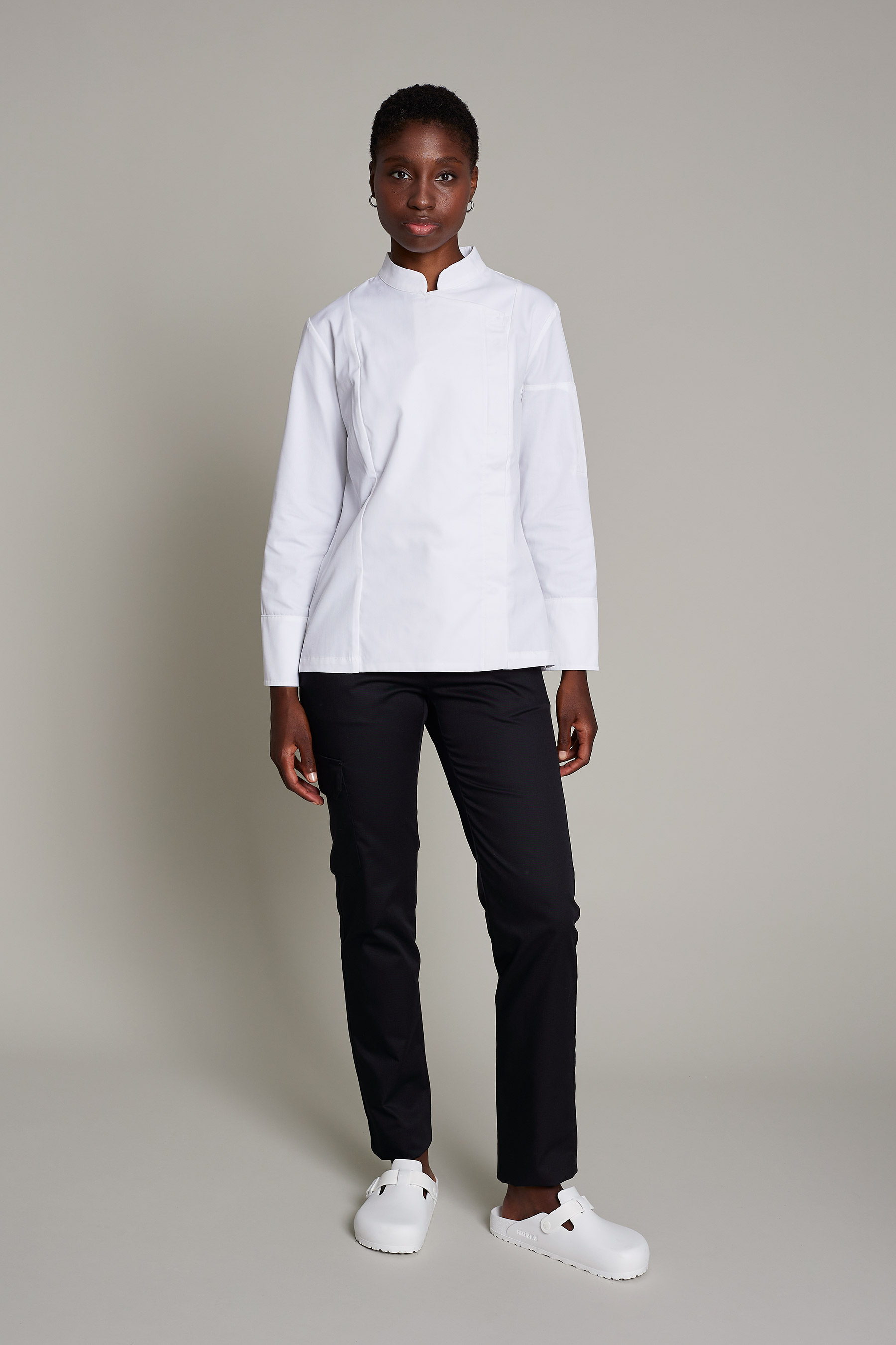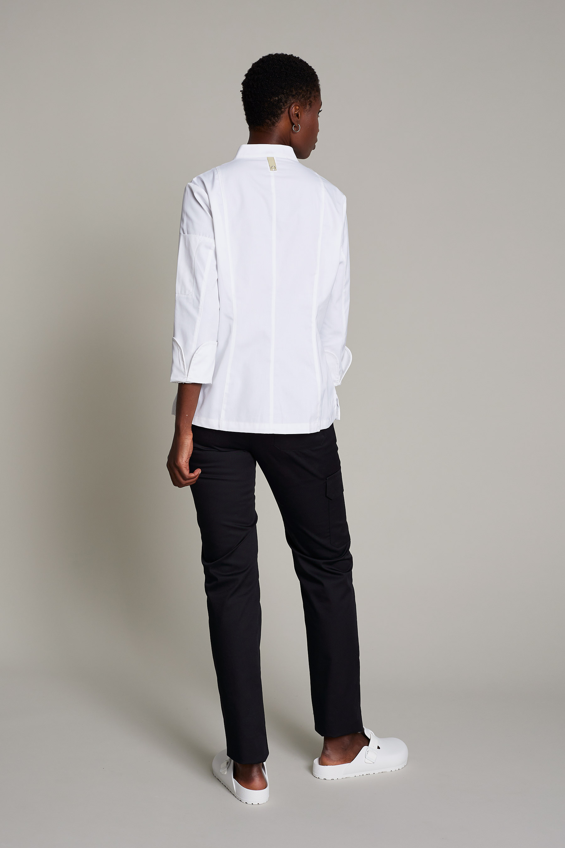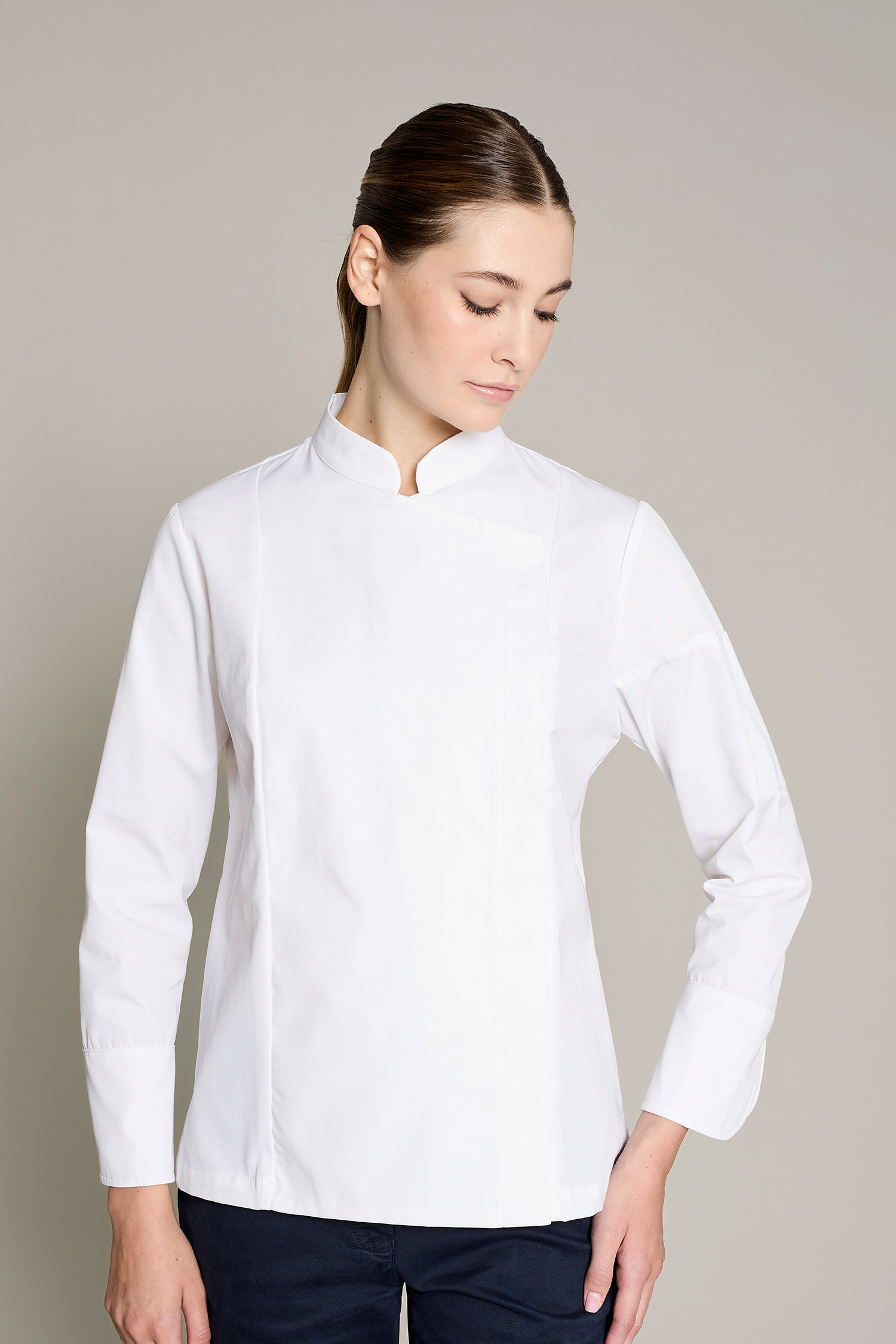 La casaca gotland premium para mujer en color blanco, combina funcionalidad y sostenibilidad. Diseñada para chefs que buscan alto rendimiento con conciencia ecológica. Confeccionada con 50% algodón orgánico 50% poliéster reciclado post-consumo, su gramaje de 180 g/m² ofrece suavidad, frescura y resistencia. Cuenta con cuello mao moderno, cierre cruzado y diseño ergonómico para máxima movilidad. Certificaciones GRS y OEKO-TEX Standard 100, que garantizan seguridad, sostenibilidad y calidad