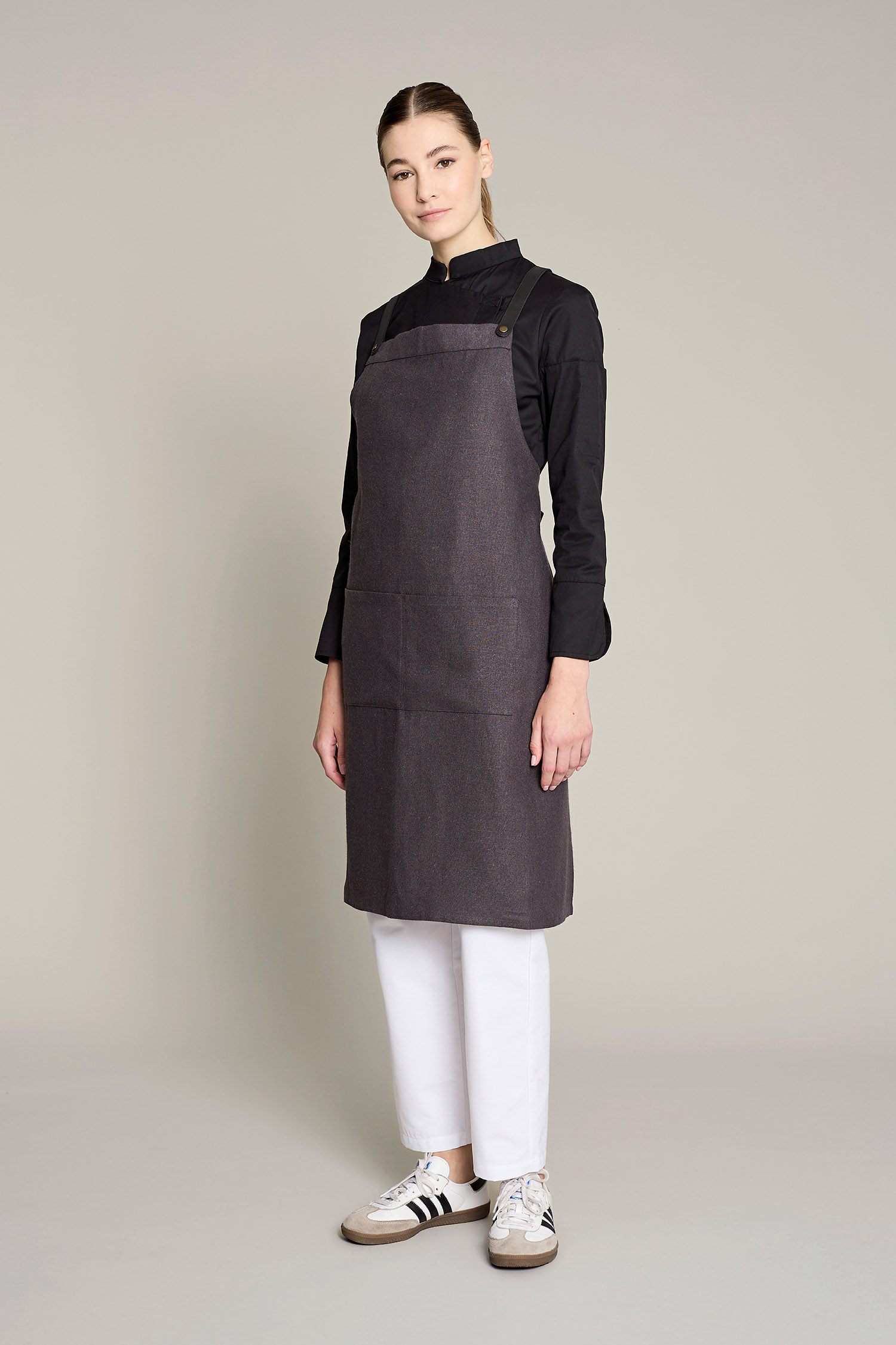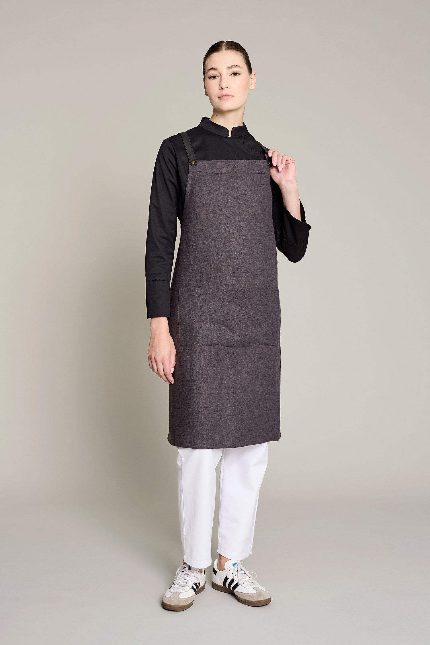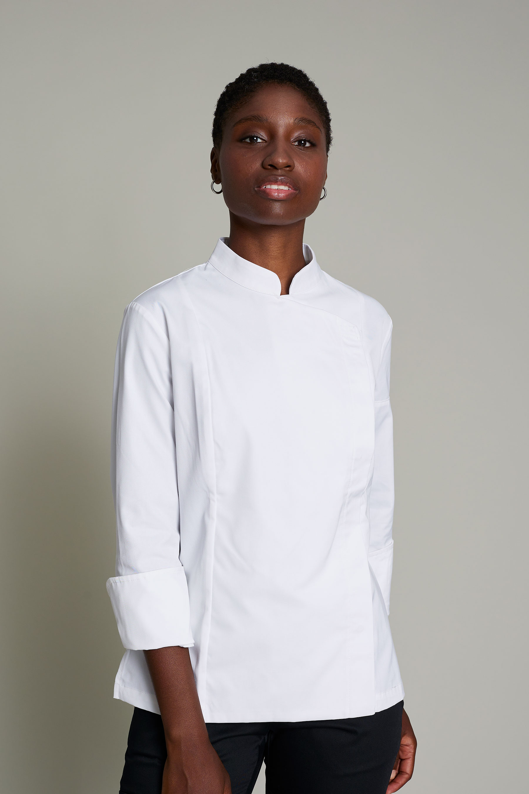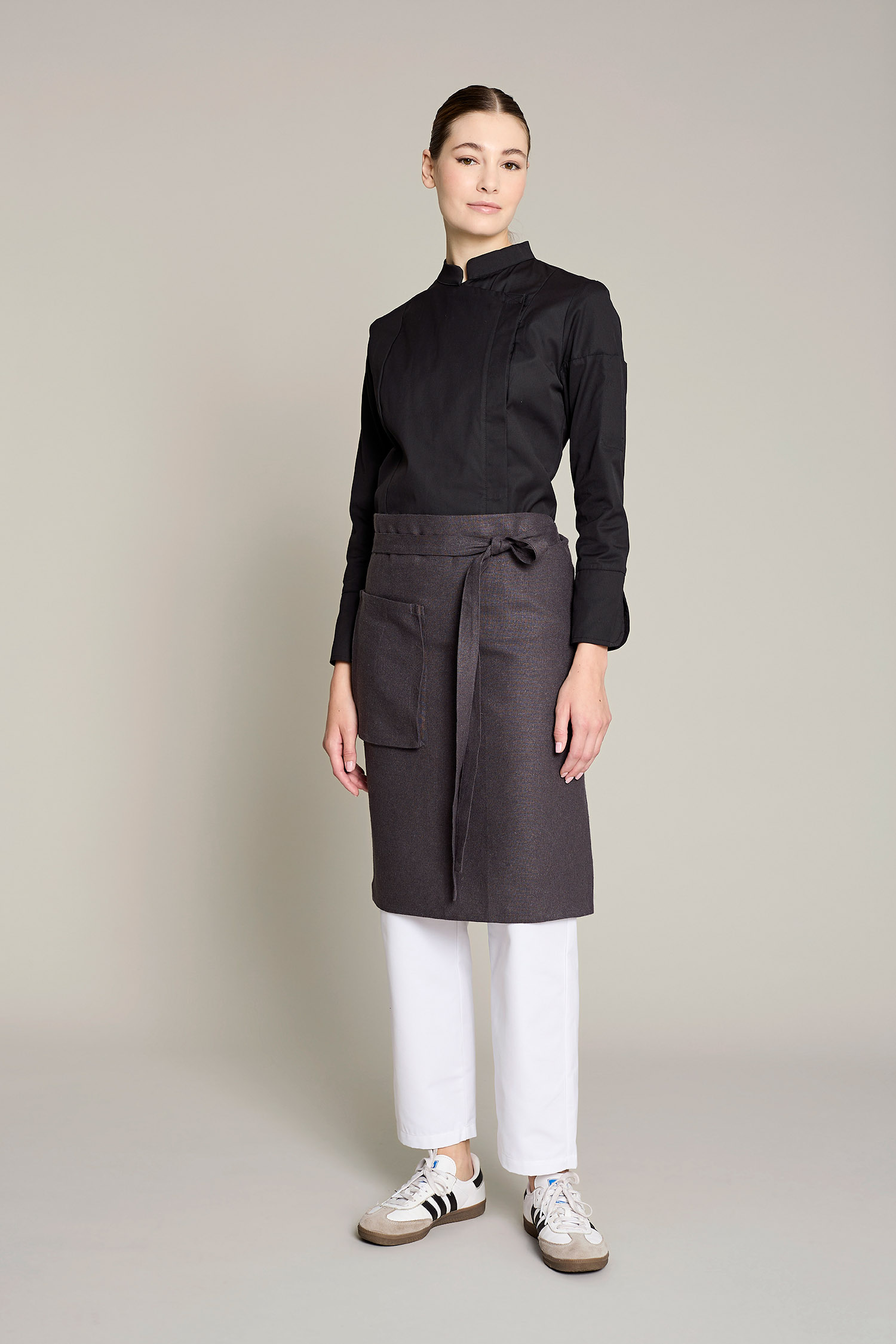Casaca de cocina de mujer en color gris con tejido orgánico y reciclado, que ofrece un máximo confort y sostenibilidad. No requiere plancha