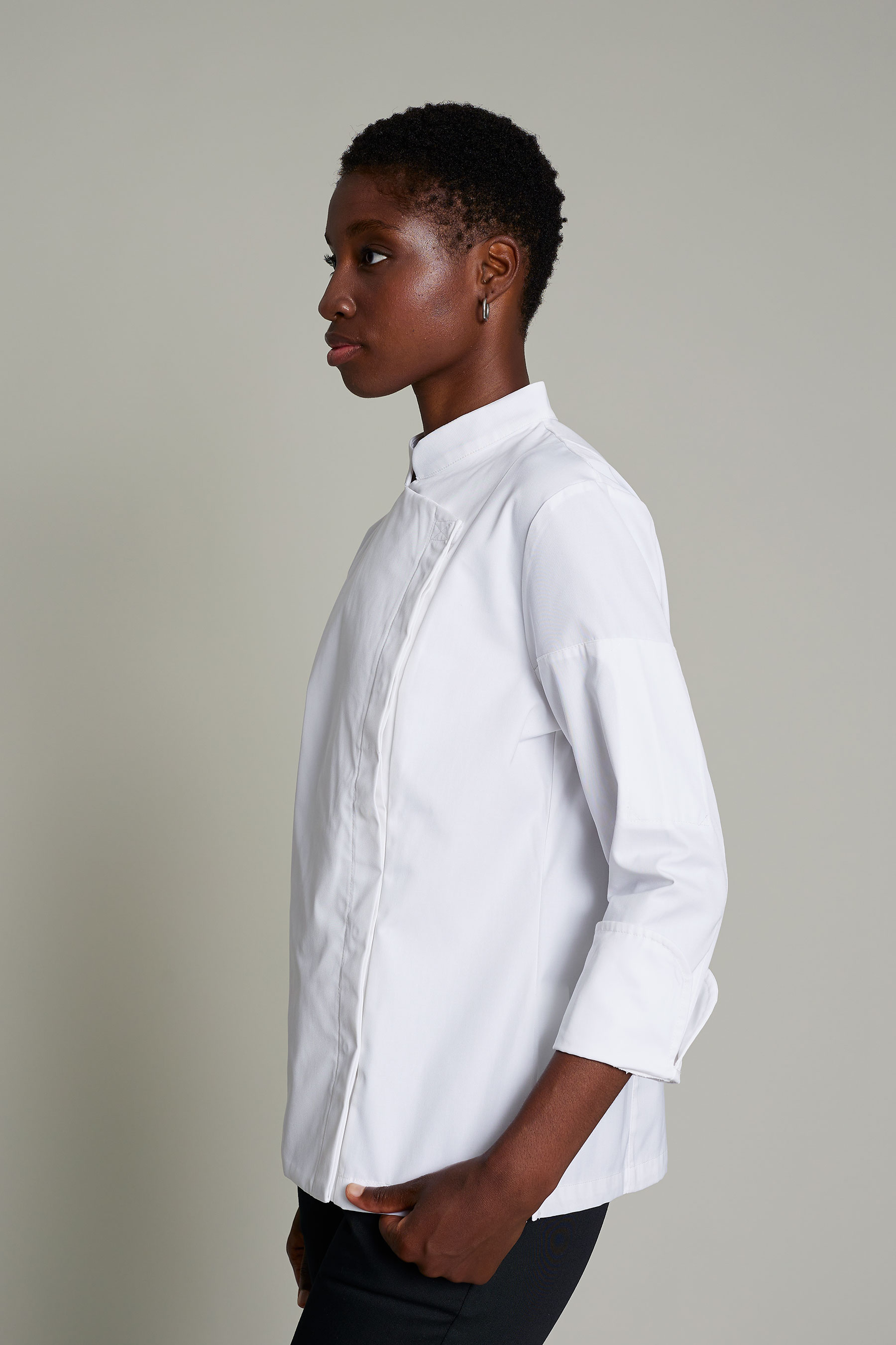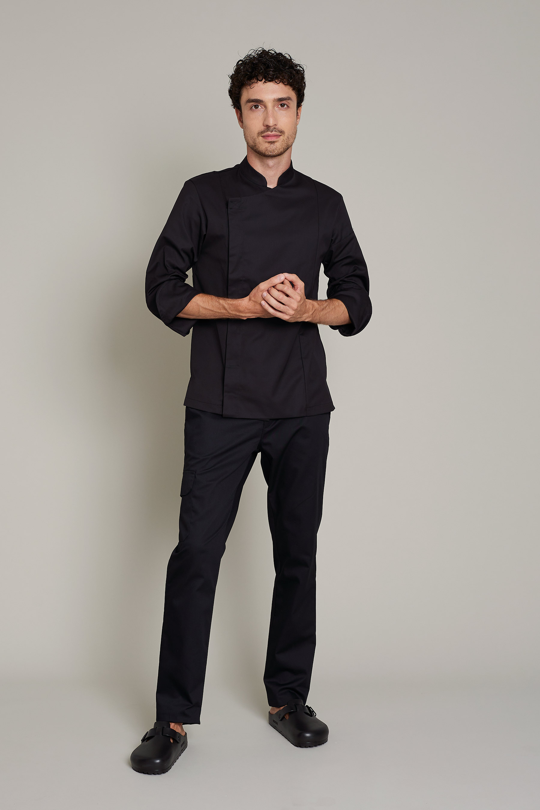 La casaca de cocina de mujer en color negro, ha sido diseñada para profesionales del sector de cocinas que requieren máxima movilidad y confort. Fabricada en 50% algodón orgánico 50% poliéster reciclado, este modelo combina un diseño funcional y sostenible. Gracias a su gramaje de 180 g/m², proporciona la ligereza necesaria para moverse con libertad sin comprometer la durabilidad de la prenda. El uso de poliéster reciclado refuerza el compromiso con la sostenibilidad sin sacrificar rendimiento. La certificación OEKO-TEX Standard 100 asegura una prenda libre de sustancias nocivas. Su tejido técnico facilita la evacuación de la humedad, manteniendo la piel seca y libre de olores incluso en turnos prolongados. Una propuesta pensada para profesionales que buscan uniformes que sean cómodos, funcionales y con estilo