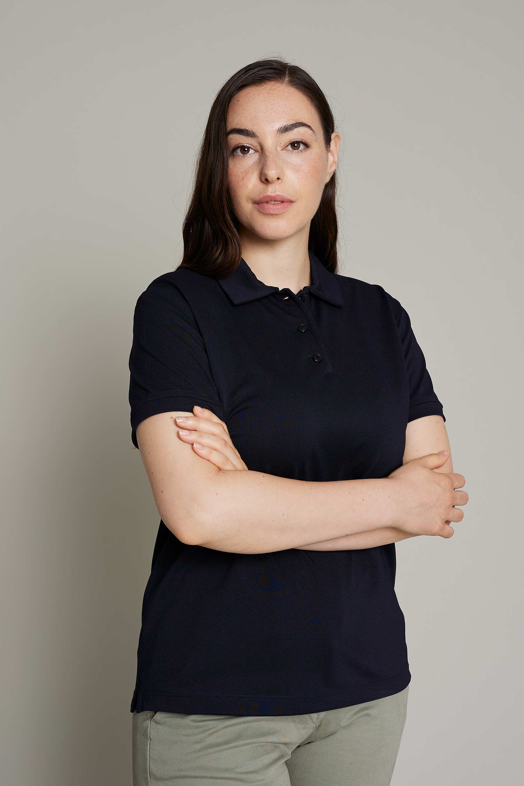 Polo de mujer en blanco con tejido Coolmax reciclado, que ofrece transpirabilidad, protección UV y propiedades antibacterianas. No requiere plancha.