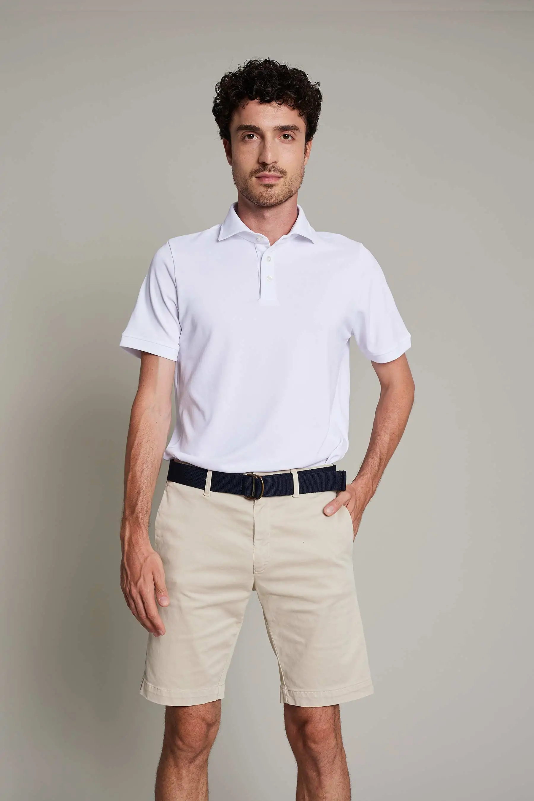 El Polo Italiano para hombre en blanco combina elegancia y sostenibilidad. El cuello italiano con tapeta de tres botones añade un toque de sofisticación, mientras que la ligereza del tejido (180 g/m²) garantiza libertad de movimiento. Acabado premium, fácil mantenimiento y sin arrugas (no necesita plancha).