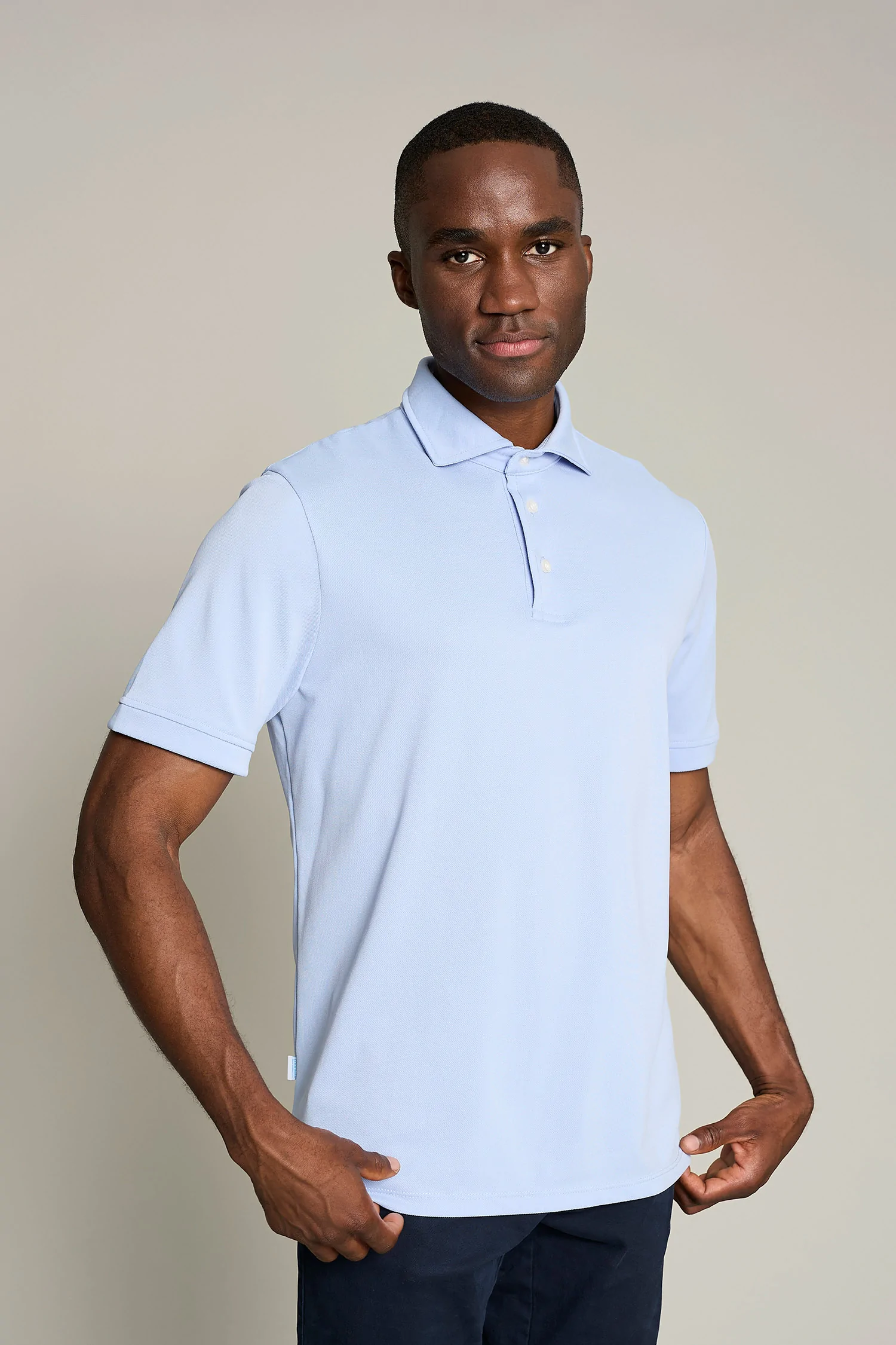 La camisa Milano en azul está diseñada con tejido técnico Coolmax reciclado, ideal para quienes buscan transpirabilidad y confort. No requiere plancha.