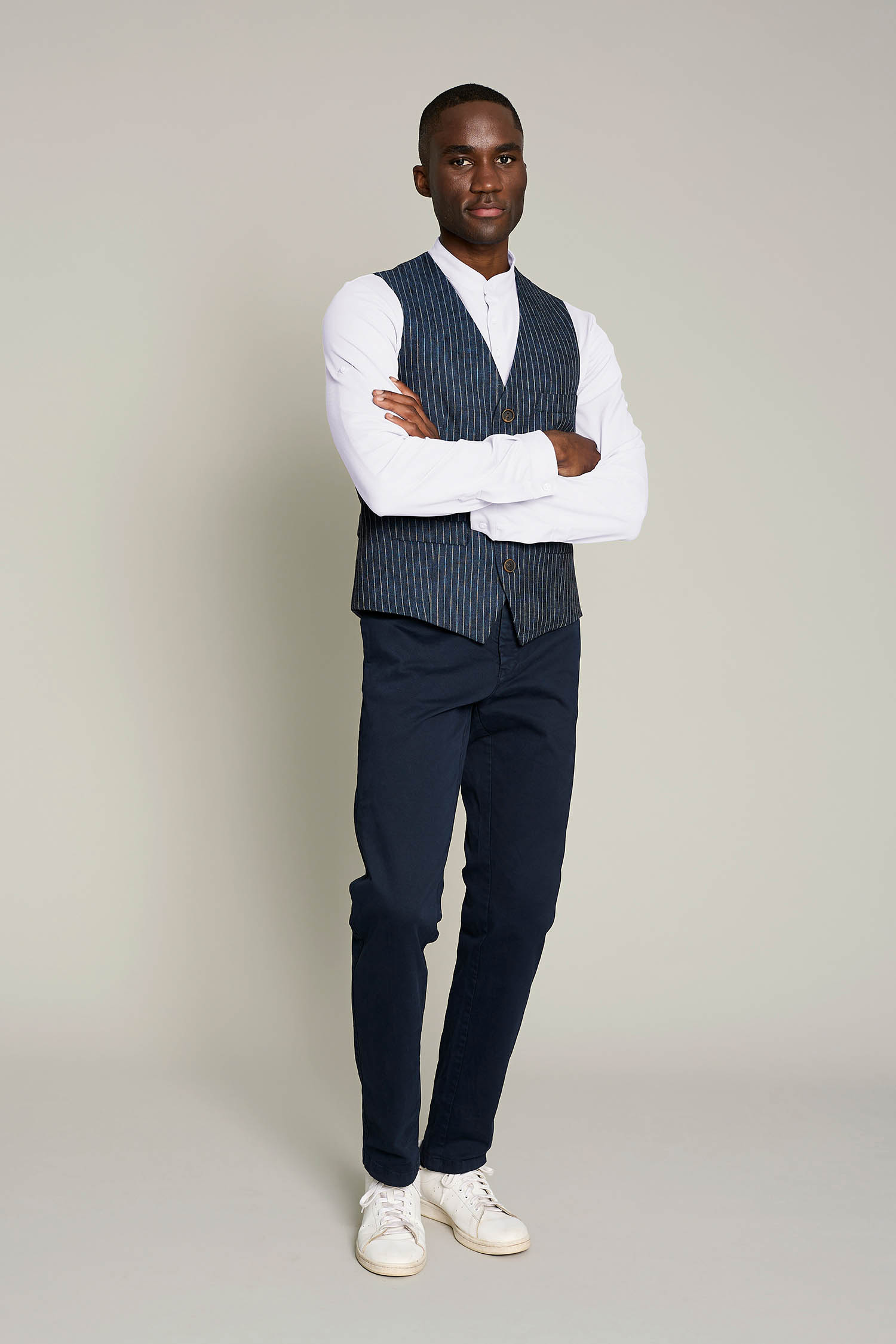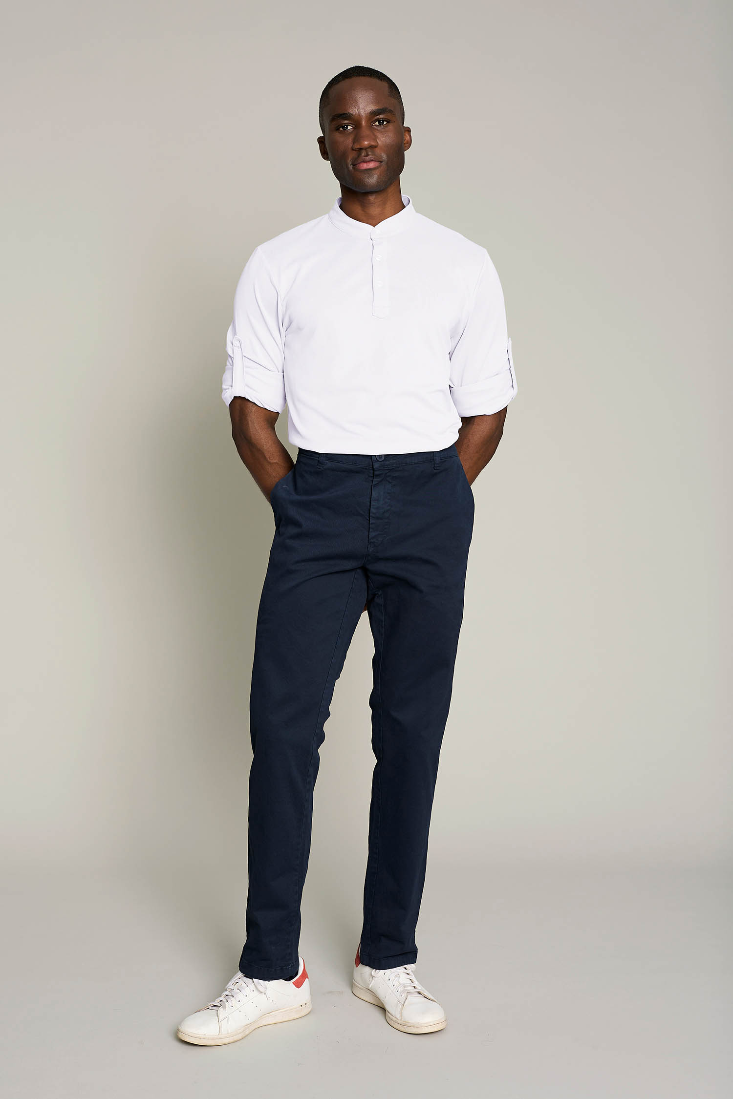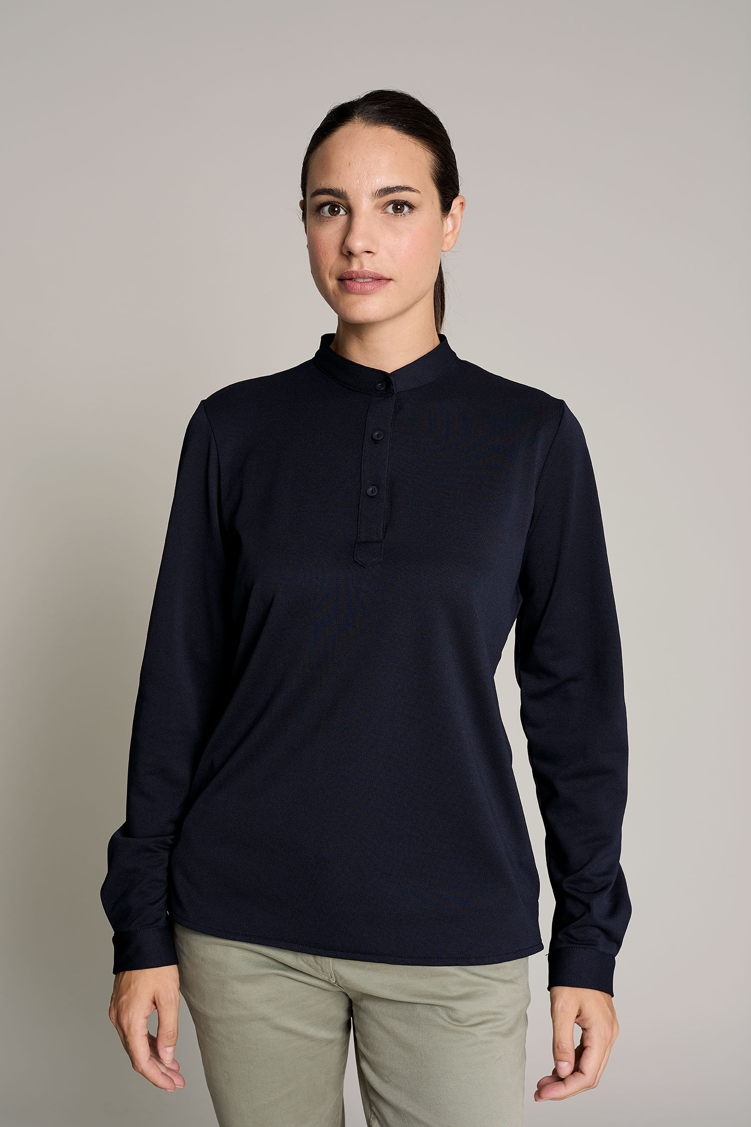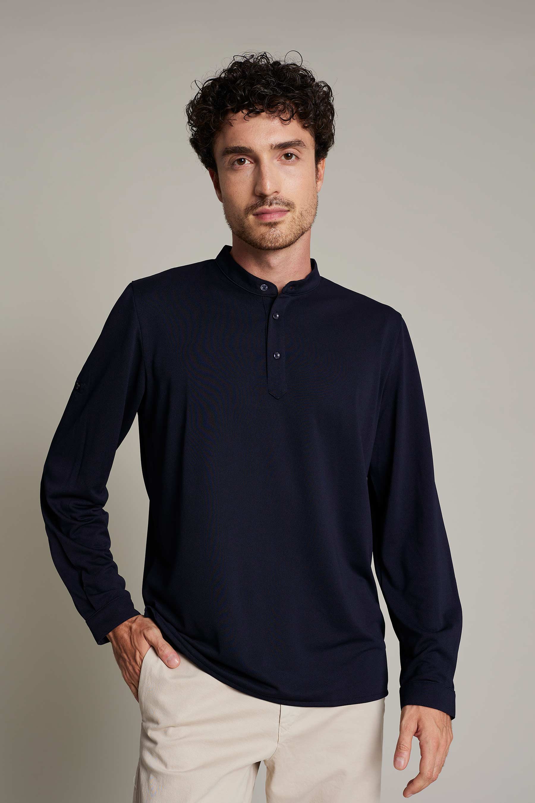 Su diseño incluye cuello mao y tres botones, y tejido ligero (180 g/m²) que garantiza libertad de movimientos, convirtiendo la prenda en sofisticada y cómoda. Fácil mantenimiento y sin arrugas (no necesita plancha).