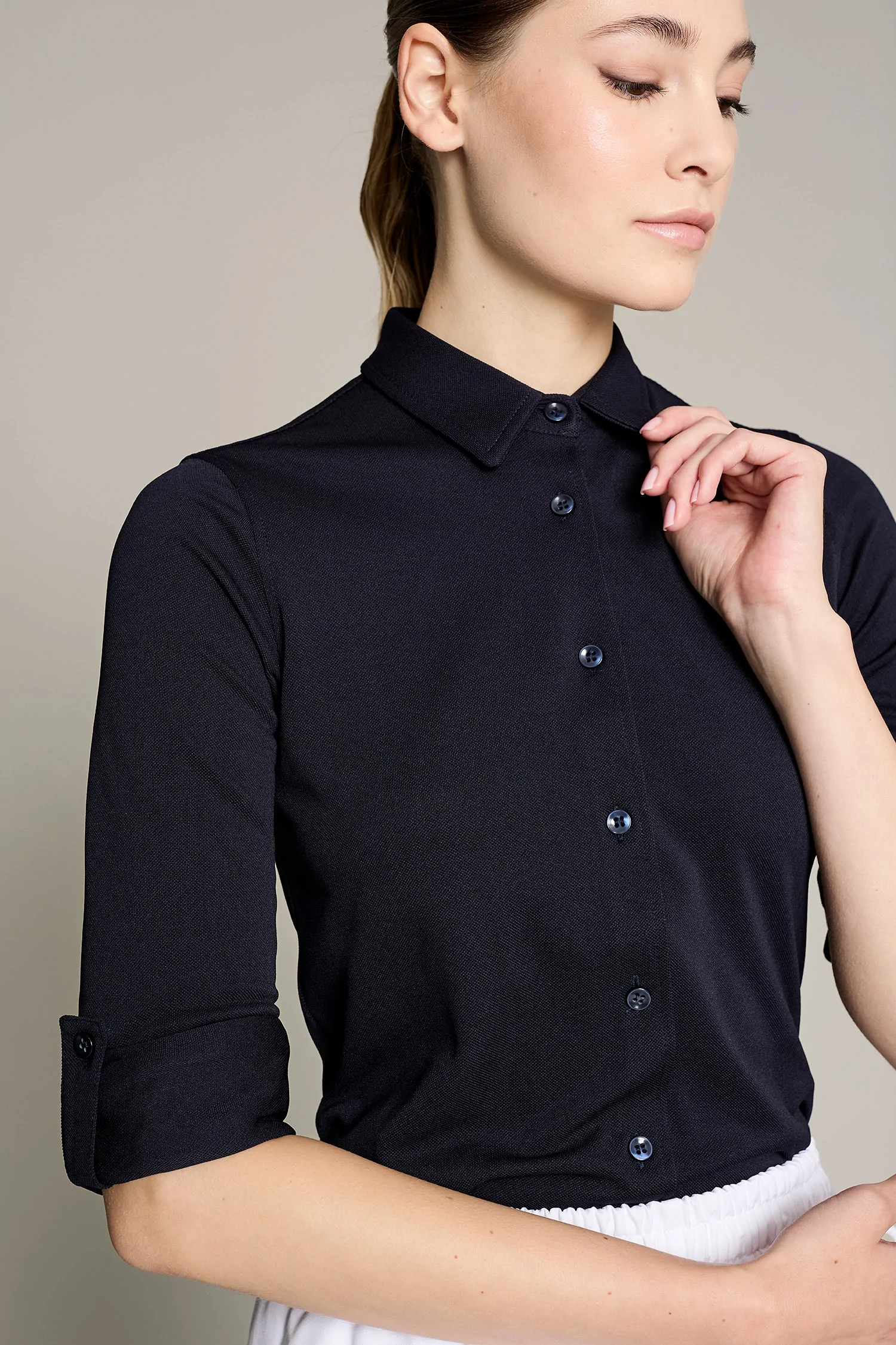 La camisa milano para mujer en azul combina elegancia, comodidad y un fuerte compromiso con la sostenibilidad. Prenda confeccionada con 100% poliéster reciclado que proviene de botellas de plástico post-consumo (97%); el tejido CoolmaxEcomade Fresh cuenta con tecnología de transpiración avanzada, protección UV y propiedades antibacterianas. La tecnología Coolmax permite evaporar rápidamente la humedad, manteniendo la piel seca.