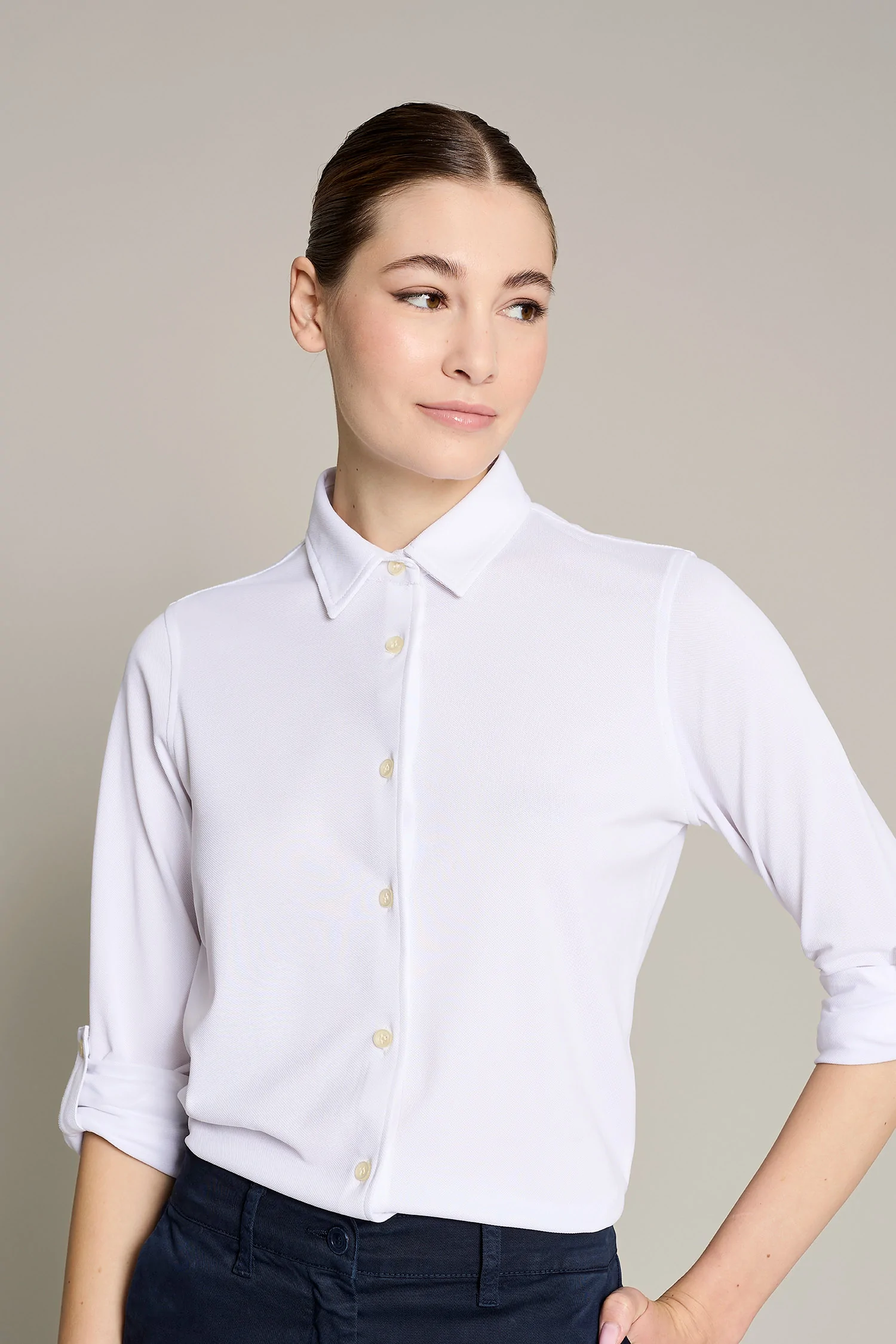 Polo de mujer en blanco con tejido Coolmax reciclado, que ofrece transpirabilidad, protección UV y propiedades antibacterianas. No requiere plancha.