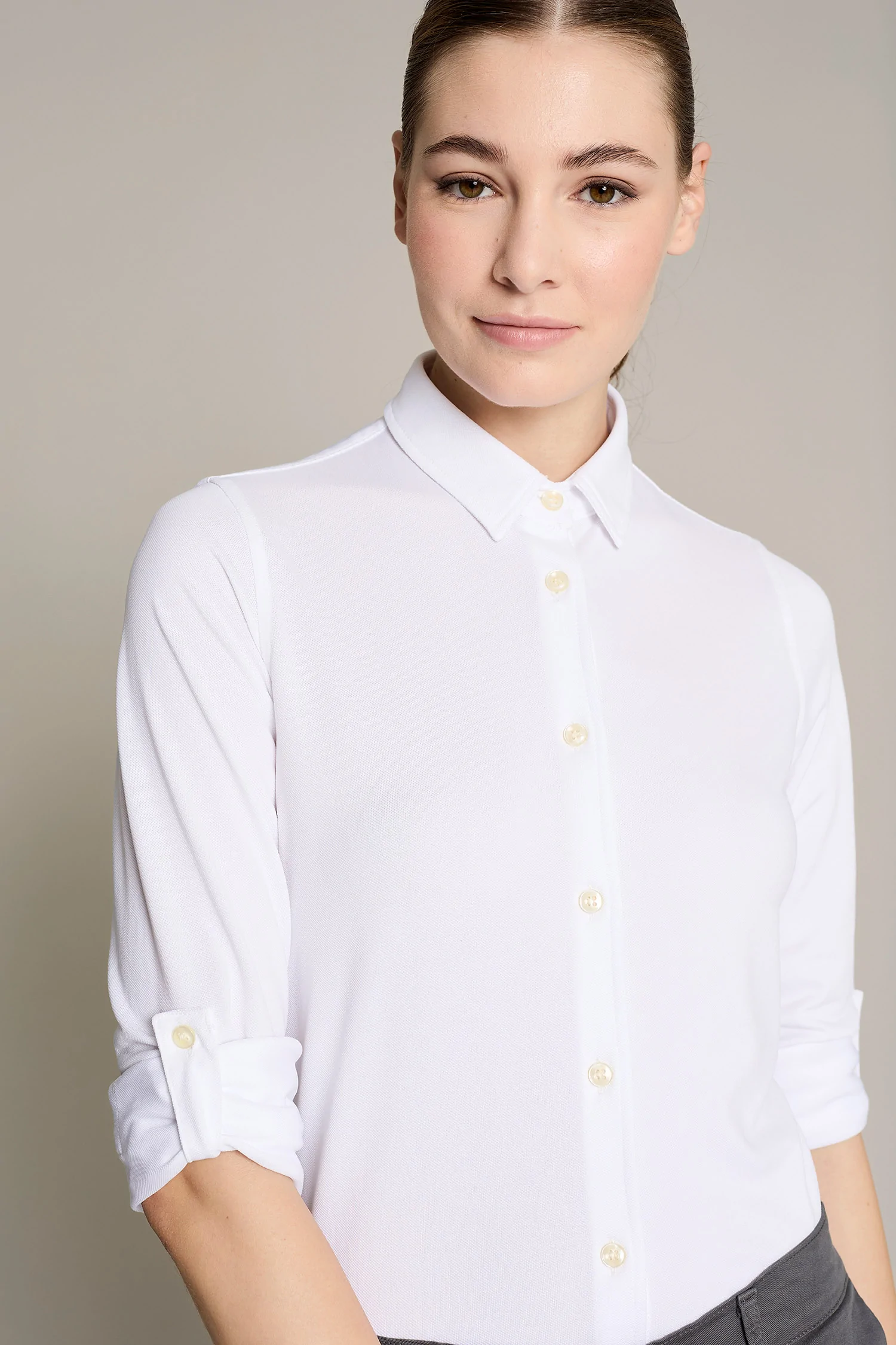 Polo de mujer en blanco con tejido Coolmax reciclado, que ofrece transpirabilidad, protección UV y propiedades antibacterianas. No requiere plancha.
