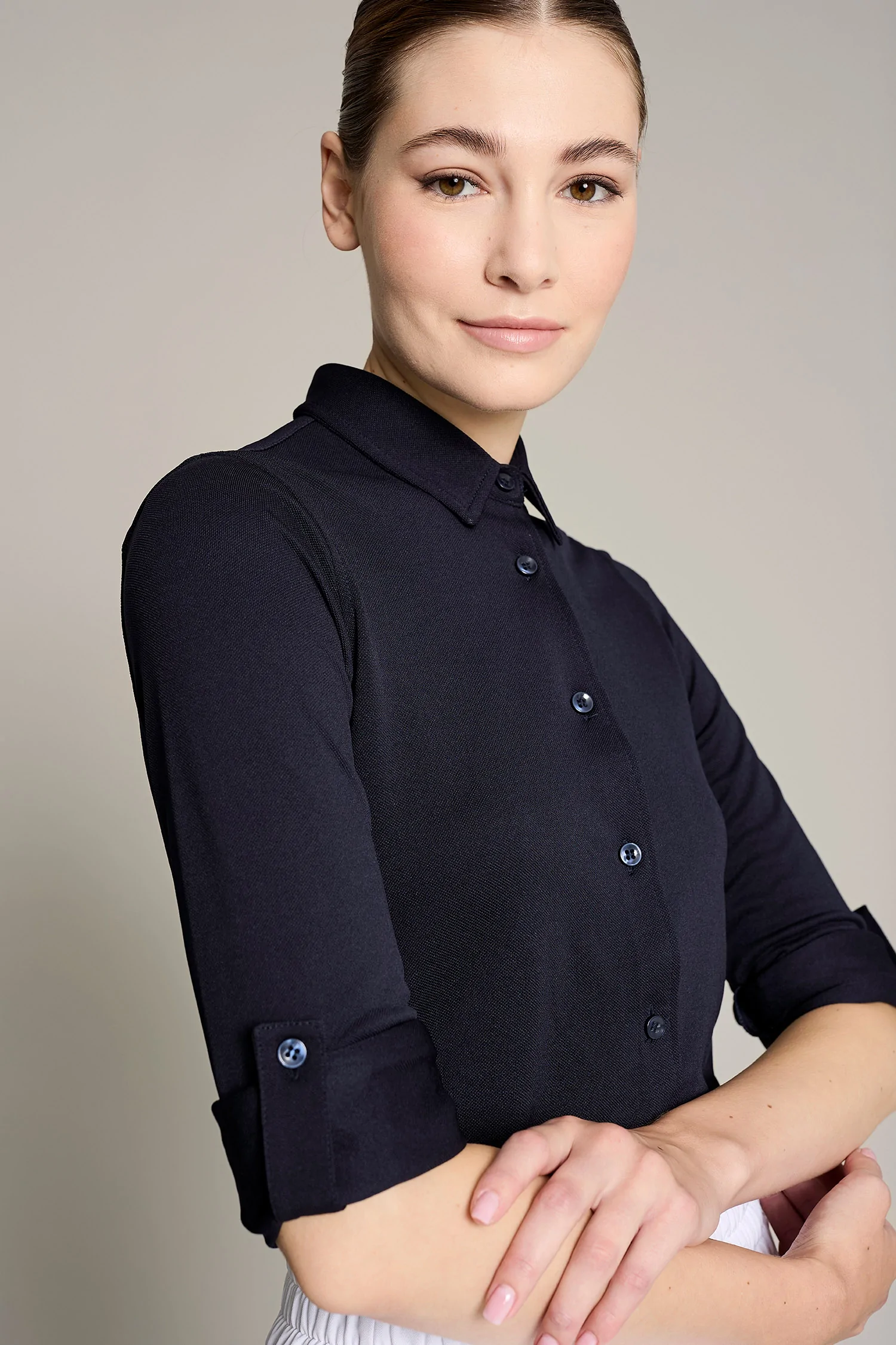 Su diseño incluye cuello camisero y puños con abertura para mayor comodidad. Acabado premium, fácil mantenimiento y sin arrugas (no necesita plancha).