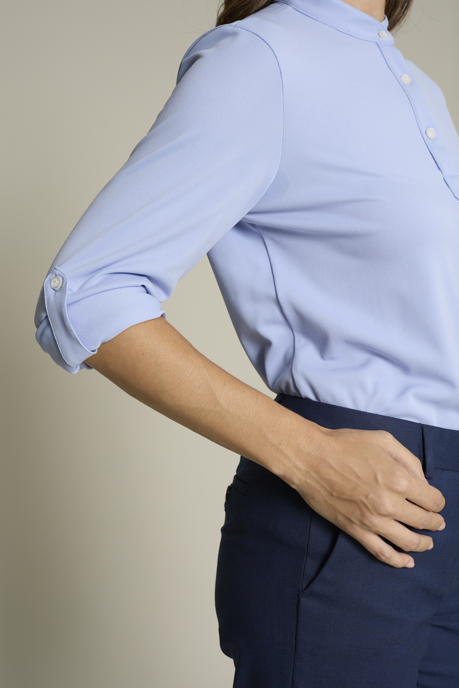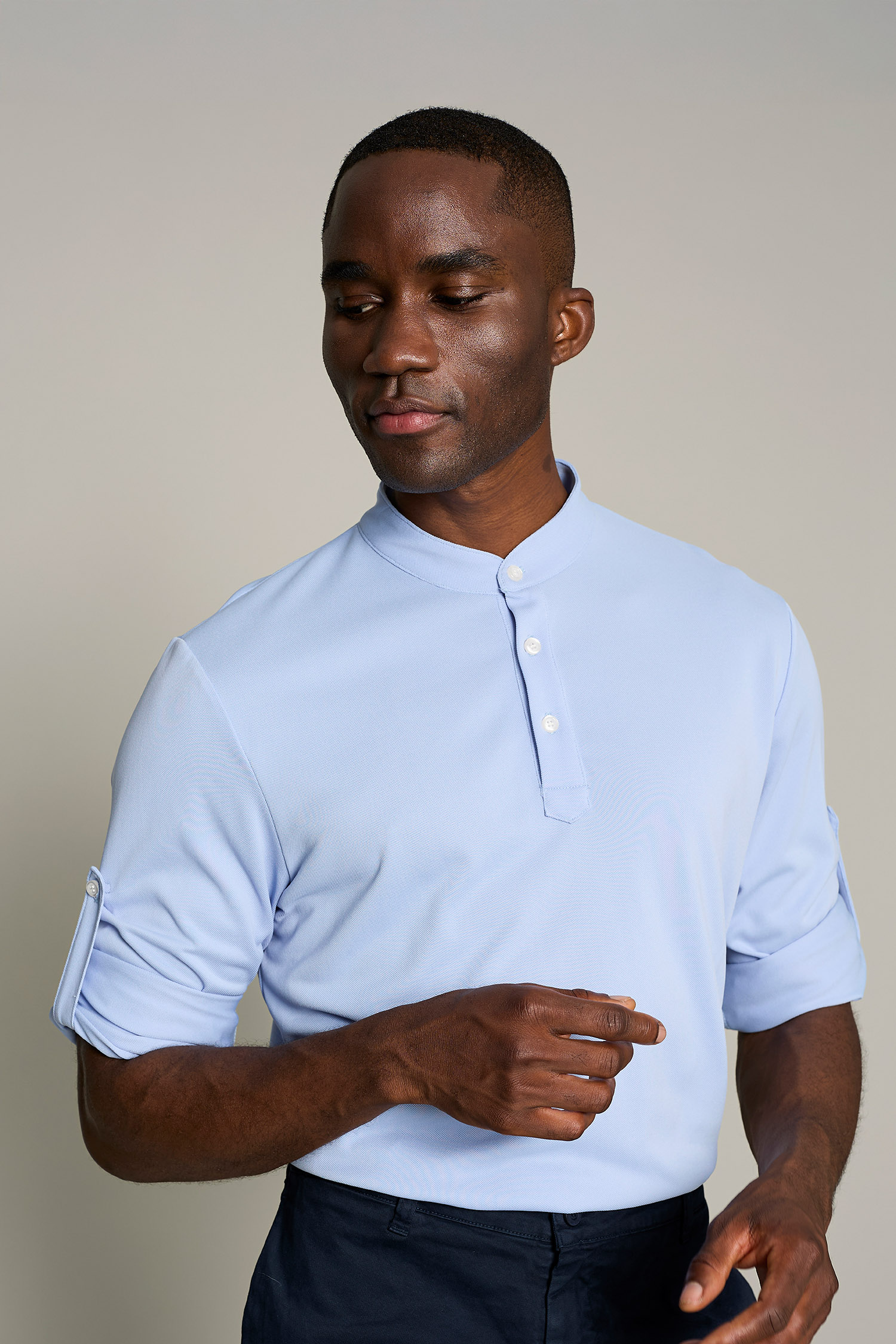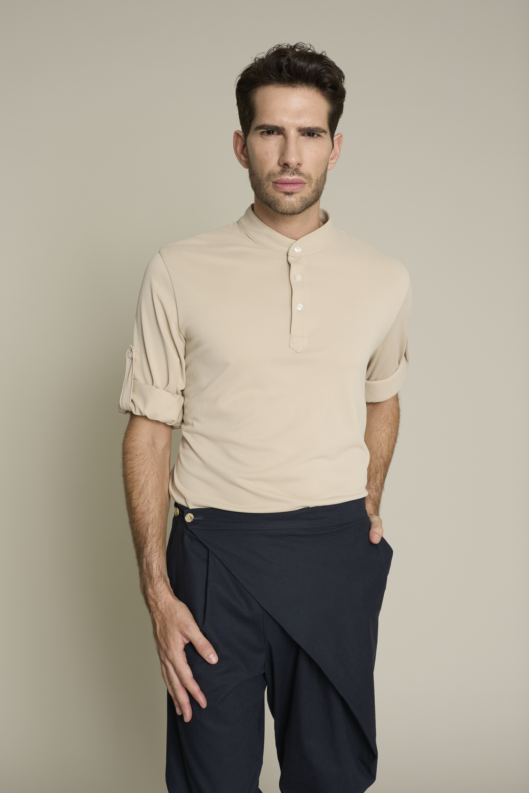 Su diseño incluye cuello mao y tres botones, y tejido ligero (180 g/m²) que garantiza libertad de movimientos, convirtiendo la prenda en sofisticada y cómoda. Fácil mantenimiento y sin arrugas (no necesita plancha).