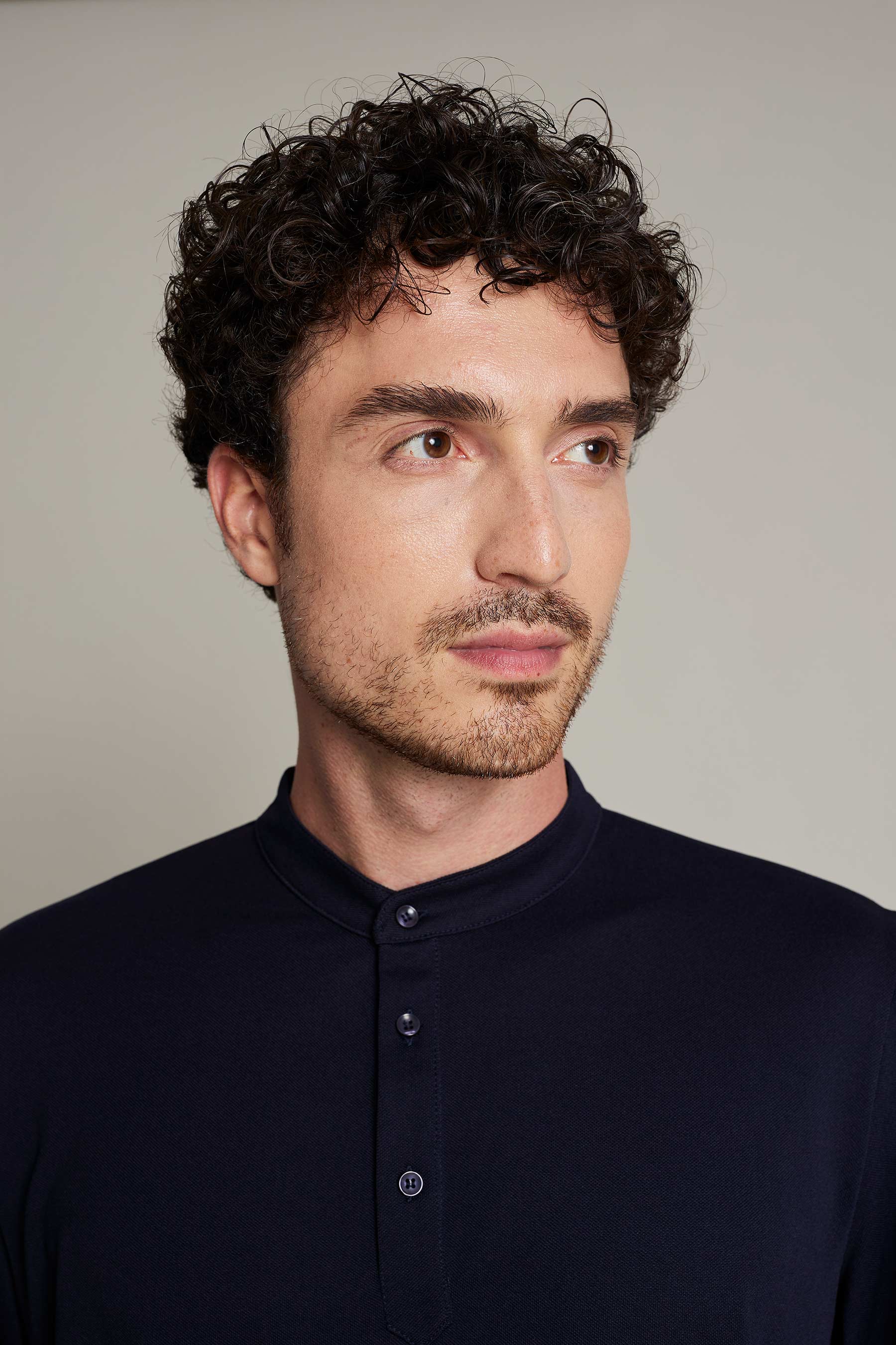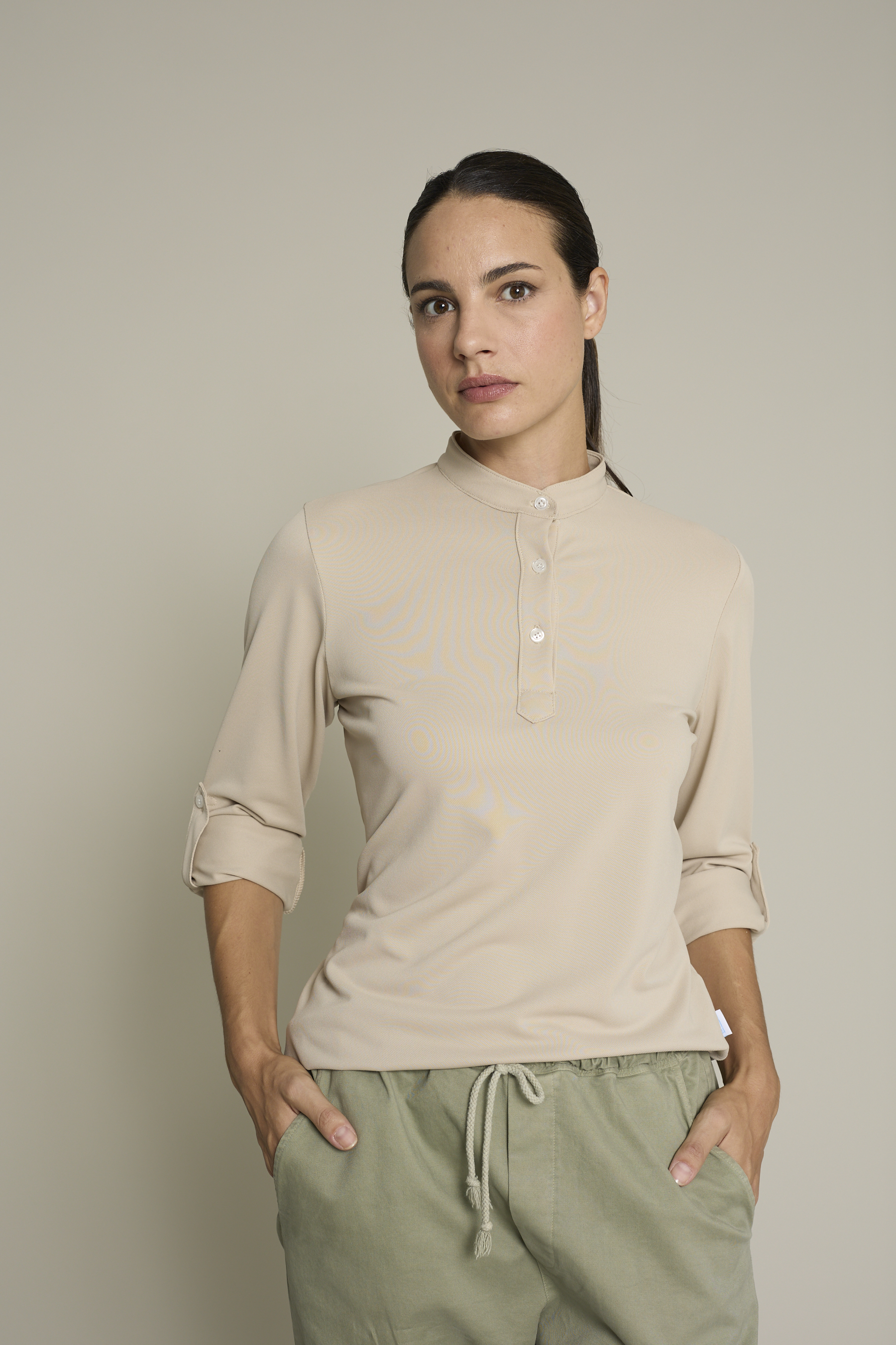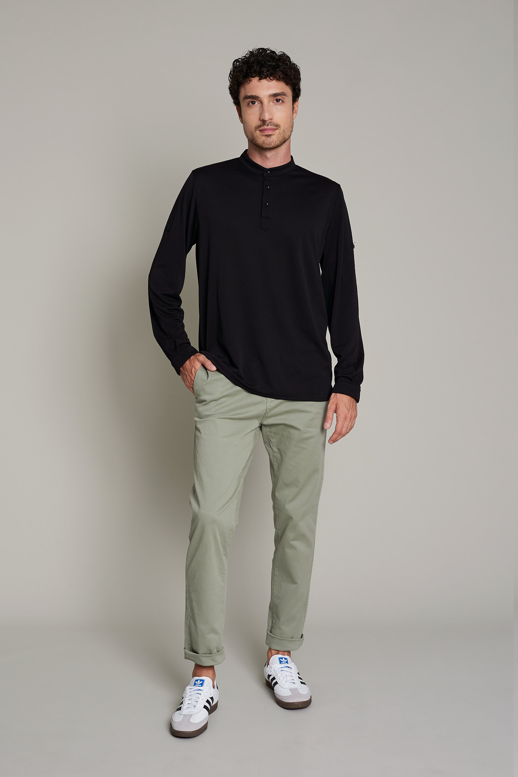 Su diseño incluye cuello mao y tres botones, y tejido ligero (180 g/m²) que garantiza libertad de movimientos, convirtiendo la prenda en sofisticada y cómoda. Fácil mantenimiento y sin arrugas (no necesita plancha).