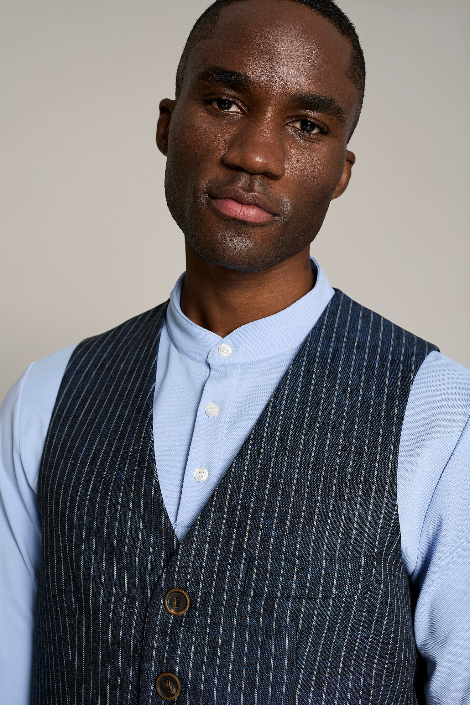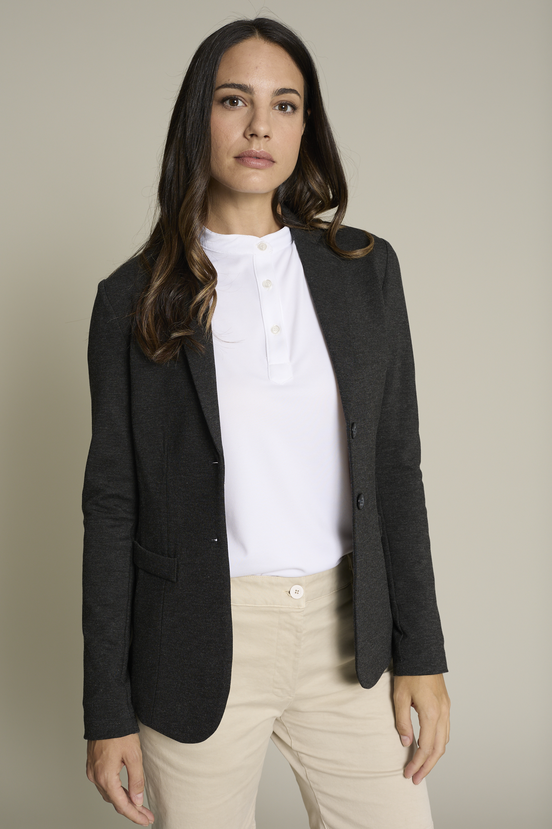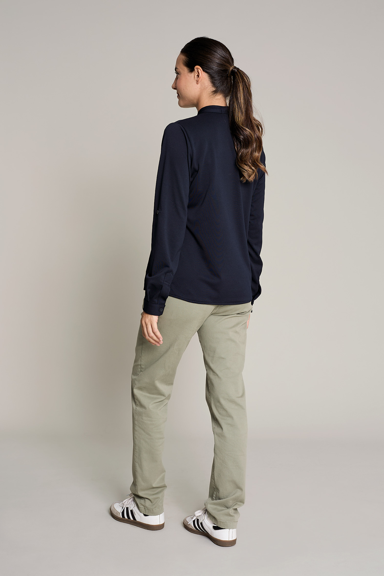 Su diseño incluye cuello mao y tres botones, y tejido ligero (180 g/m²) que garantiza libertad de movimientos, convirtiendo la prenda en sofisticada y cómoda. Fácil mantenimiento y sin arrugas (no necesita plancha).