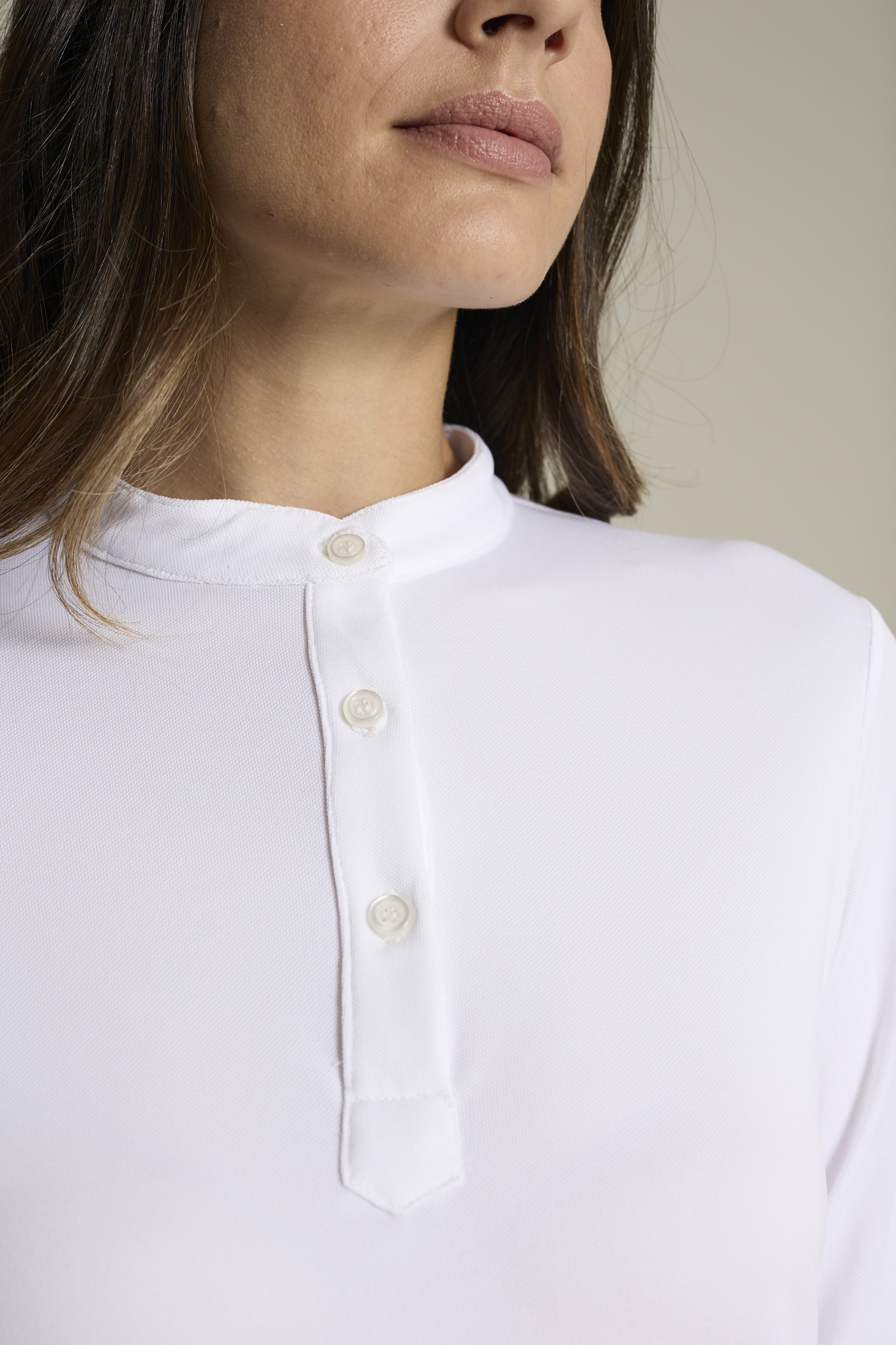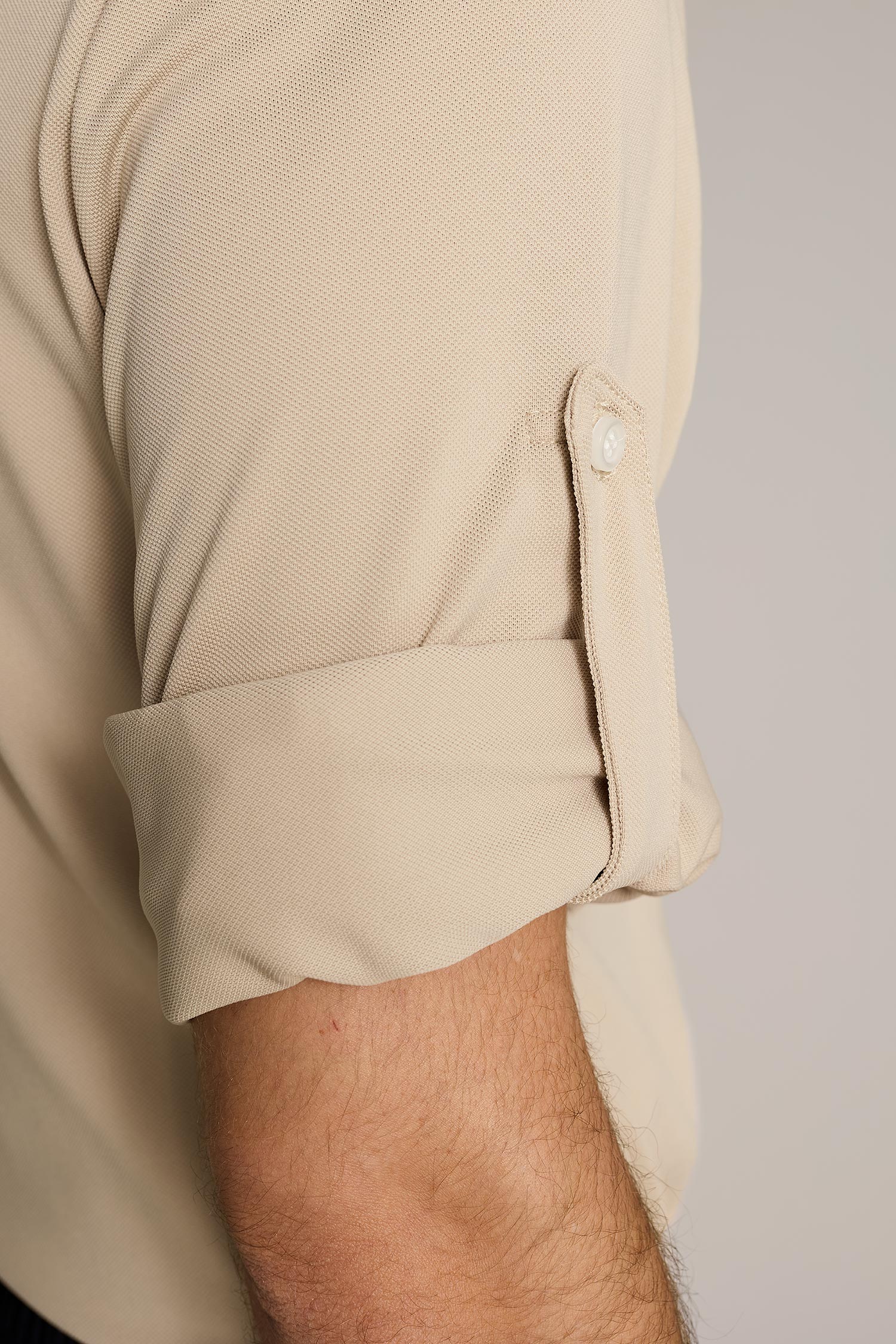 Polo de hombre coolmax manga larga con presillas para recoger y el puño con un botón. El cuello es tipo mao con tapeta tipo polo y cuatro botones acabado en triángulo. No requiere plancha.