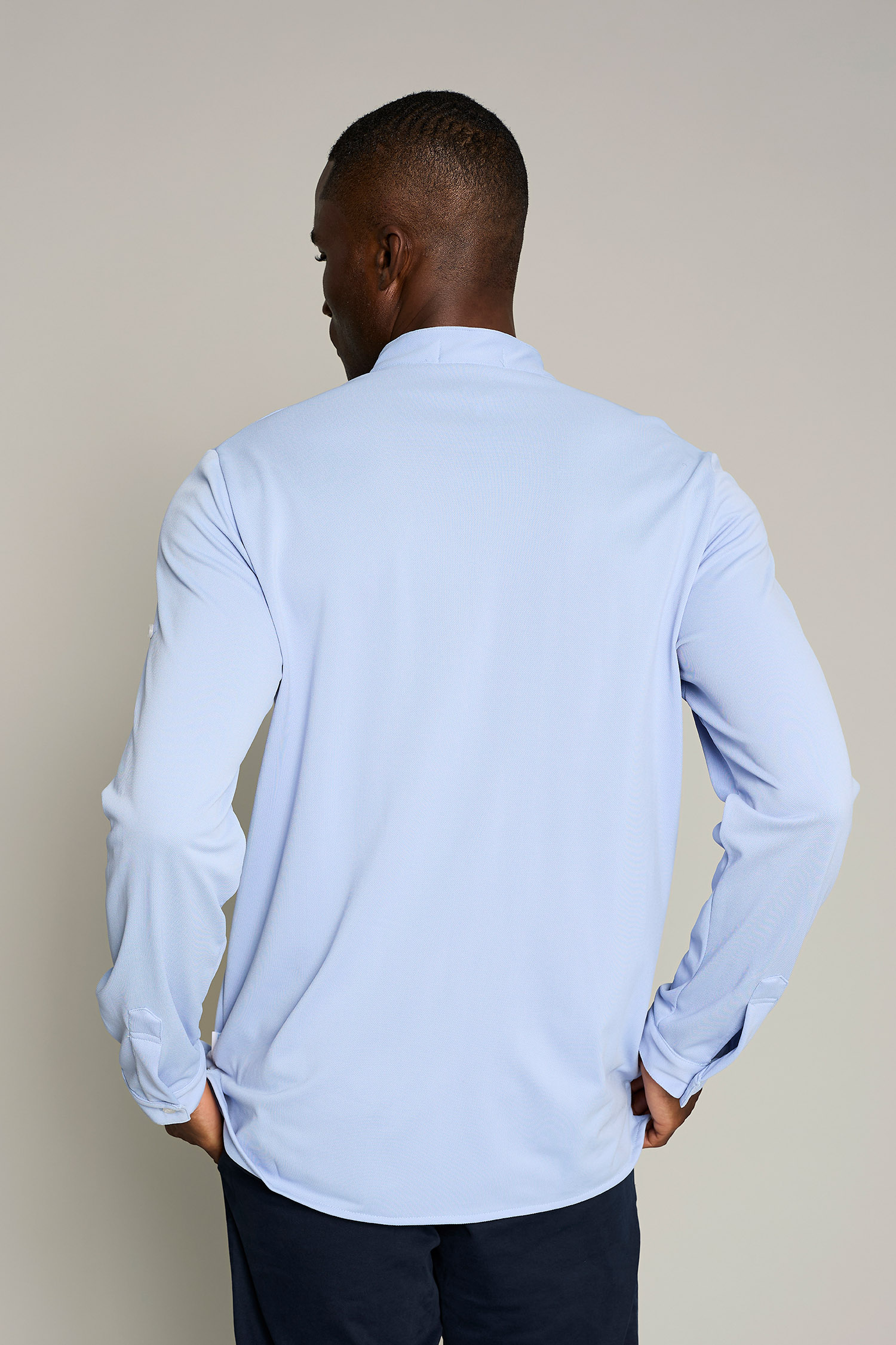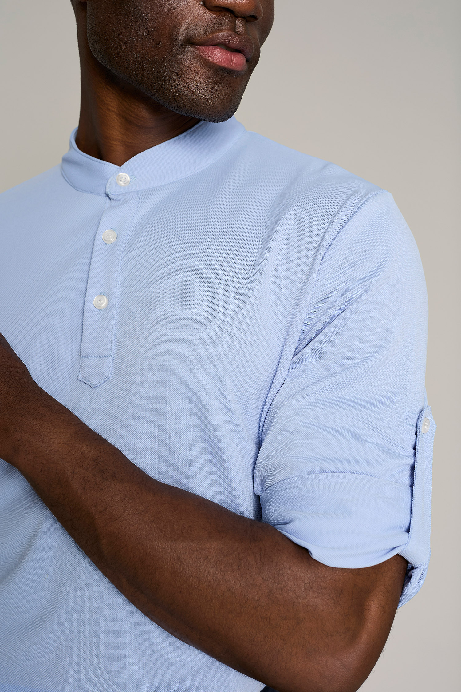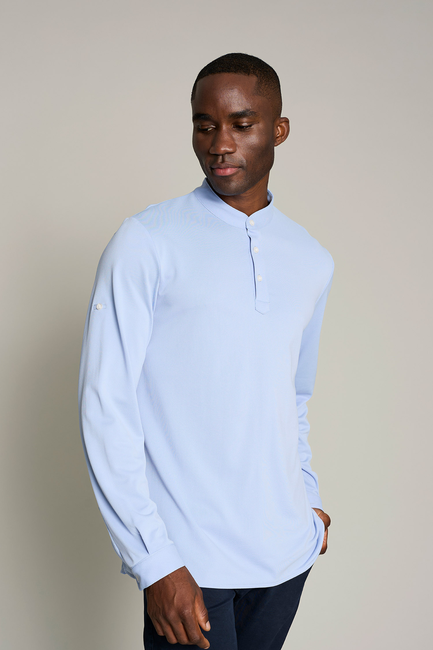 Polo de hombre coolmax manga larga con presillas para recoger y el puño con un botón. El cuello es tipo mao con tapeta tipo polo y cuatro botones acabado en triángulo. No requiere plancha.