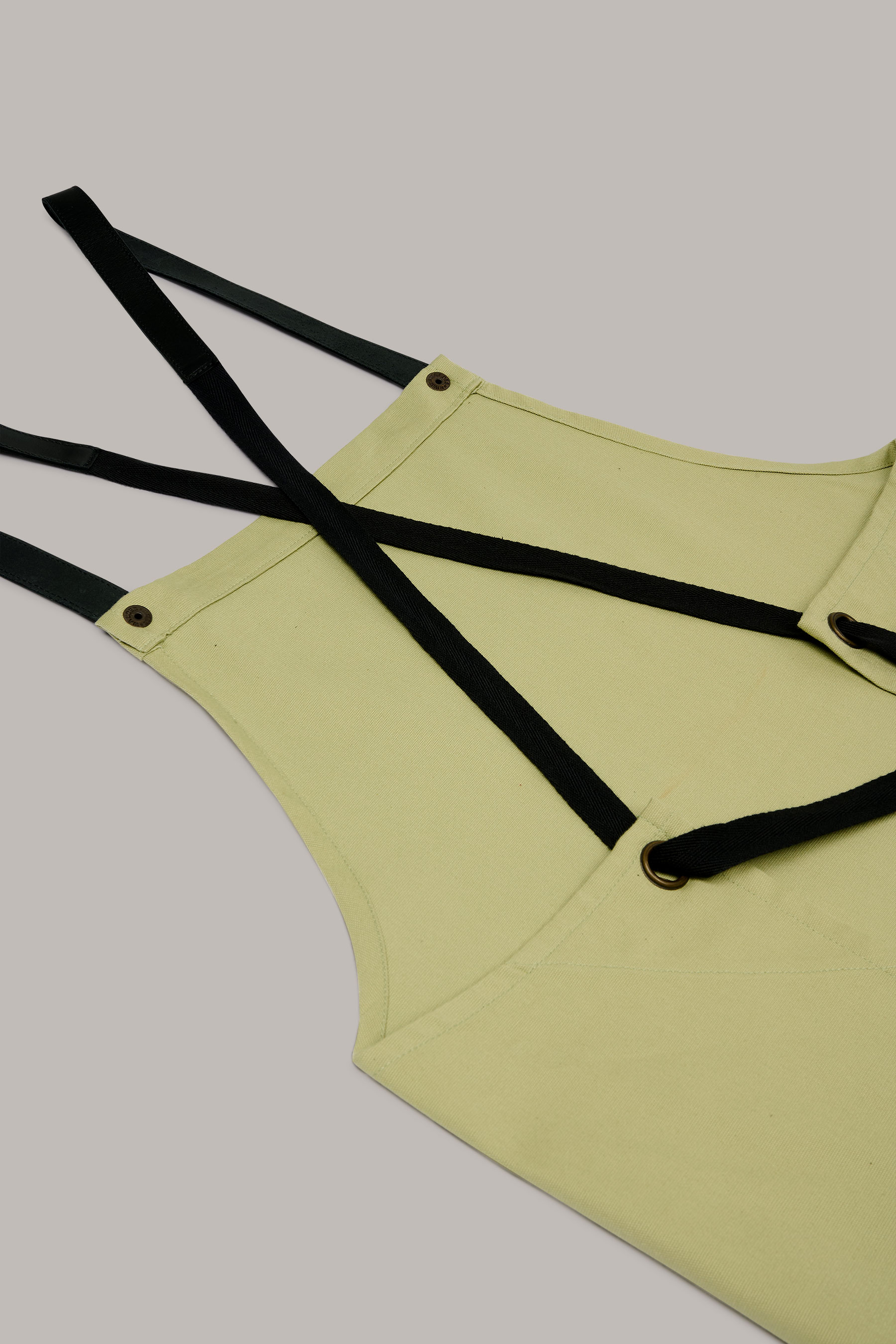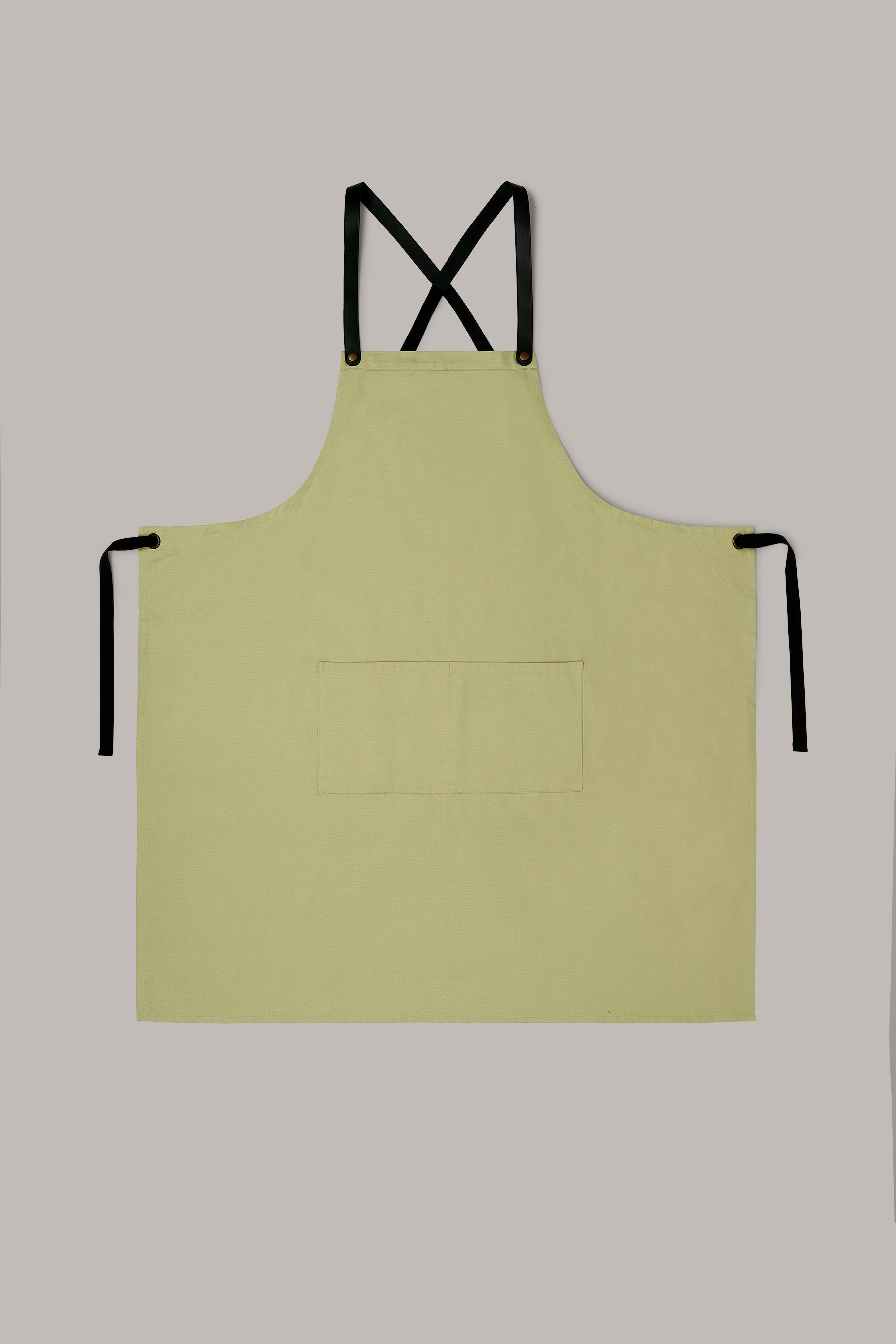 Delantal cruzado verde tea con tiras desmontables de piel negra y doble bolsillo. Tejido sostenible y producido con impacto social positivo