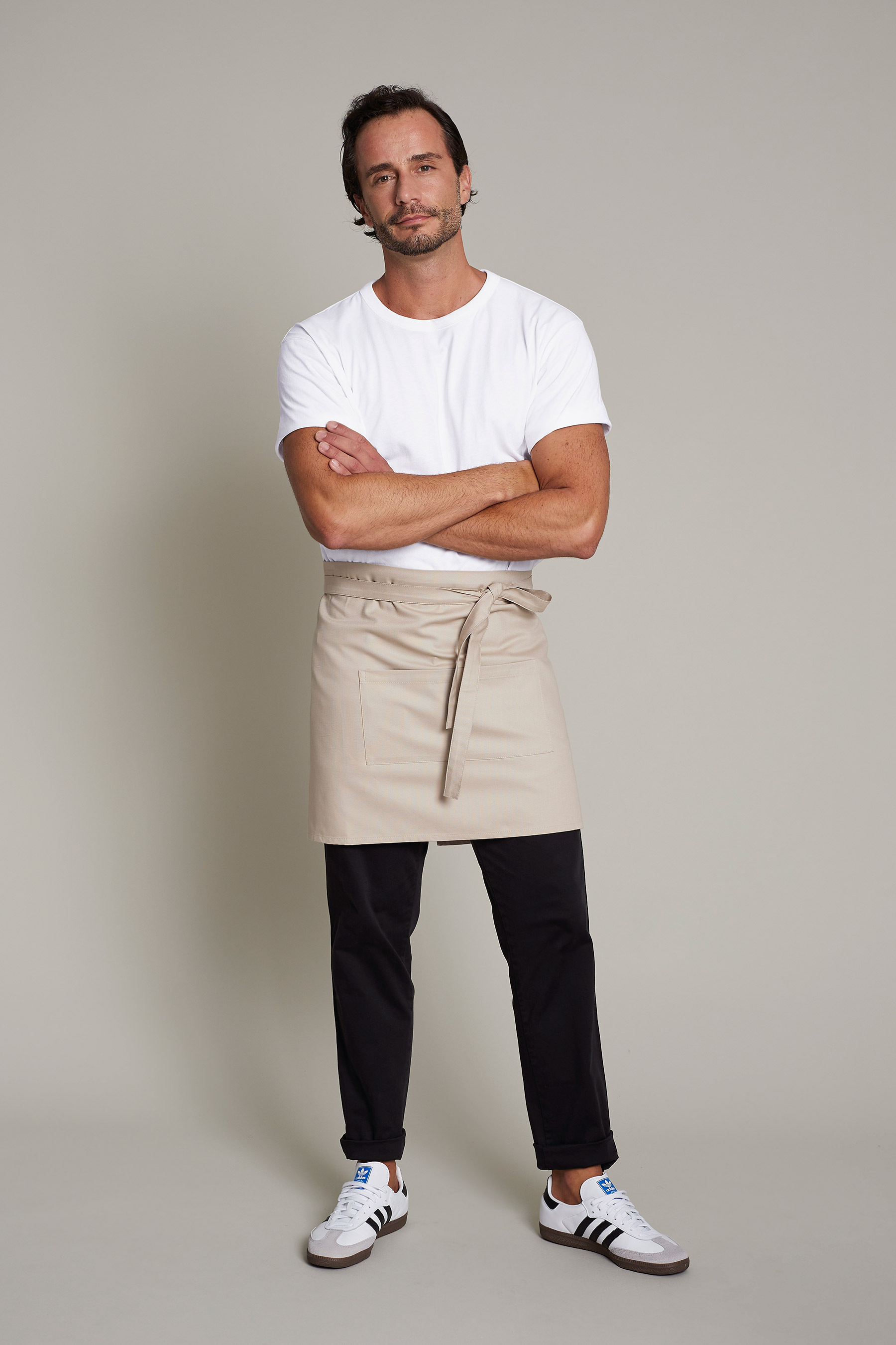 El delantal cruzado en la espalda en color beige está diseñado para ofrecer estilo, funcionalidad y propósito en diferentes entorno profesional. Fabricado con un tejido de que combina algodón y poliéster, este delantal garantiza durabilidad y comodidad incluso durante las jornadas laborales más exigentes. Sus sofisticadas tiras cruzadas de piel negra, combinadas con cinta beta del mismo color, son desmontables para facilitar su mantenimiento y proporcionan un ajuste personalizado que reduce la presión cervical, asegurando comodidad y estilo en cada uso. Su diseño práctico y funcional incorpora un doble bolsillo central tipo plastrón, ideal para tener accesorios siempre al alcance de la mano. Este delantal forma parte de nuestra Colección Delantales con Propósito, confeccionada en talleres sociales Km 0 en colaboración con la Fundación Roure. Cada unidad que adquieres contribuye a la inserción laboral de personas en situación vulnerable, generando un impacto social real y positivo. Es la elección perfecta para profesionales que desean destacar por su estilo, responsabilidad y atención al detalle.”