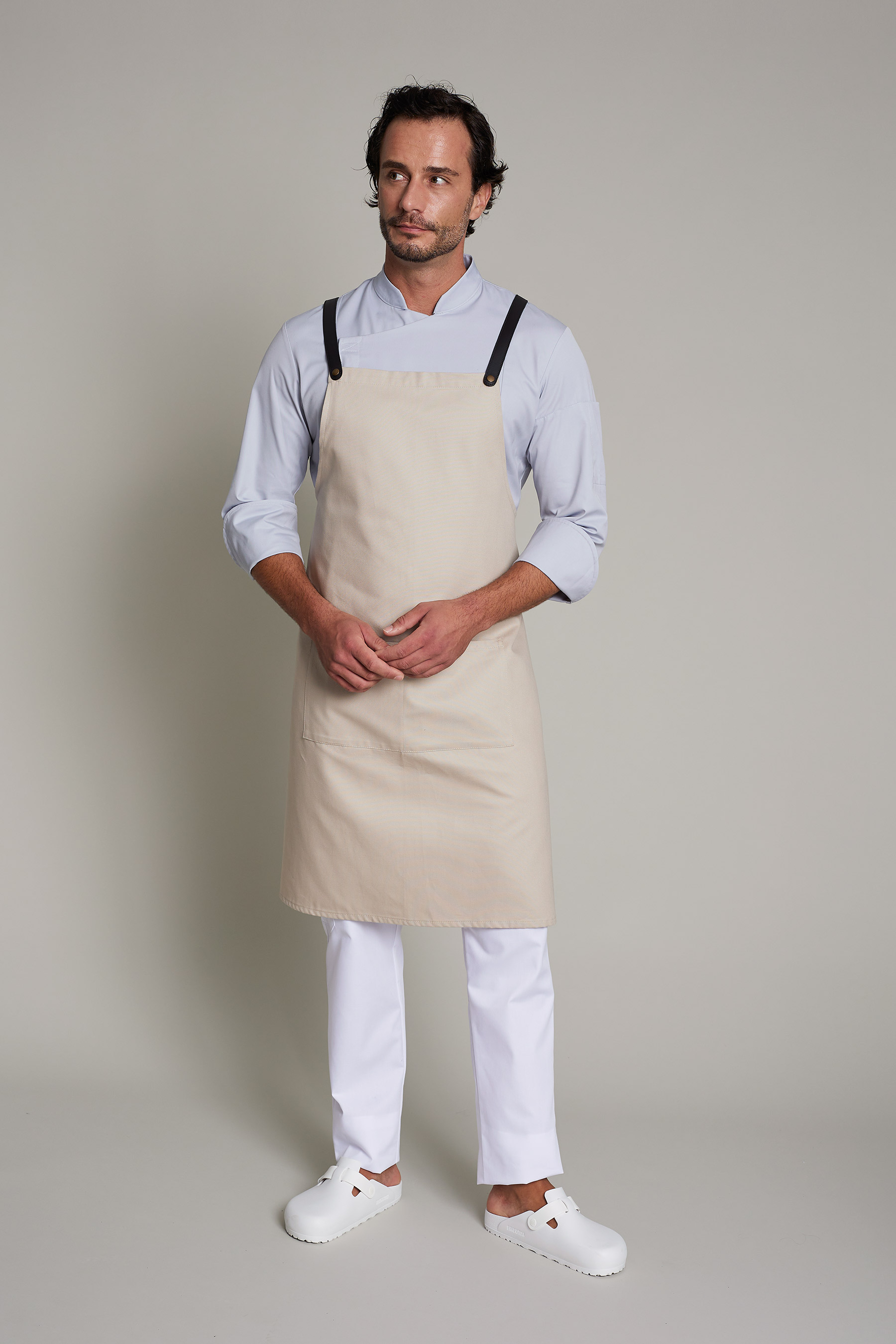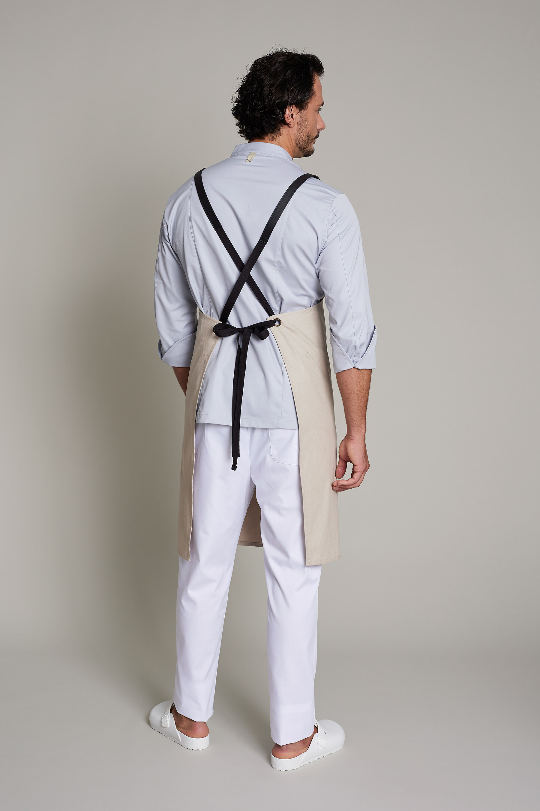 El delantal cruzado en color lino-piedra es ideal para profesionales que buscan una prenda funcional, elegante y responsable. Confeccionado con tejido de 100% algodón orgánico, su diseño incorpora un amplio bolsillo central tipo plastrón, ideal para mantener accesorios siempre a mano. Apto para entornos de cocina. Esta prenda forma parte de la Colección Delantales con Propósito, producida éticamente en talleres sociales Km 0 en colaboración con la Fundación Roure. Al adquirir este producto, apoyas la inserción laboral de personas en situación vulnerable y contribuyes a un impacto social positivo y transformador.Fabricado en tejido de 35% algodón orgánico y 65% poliéster reciclado, con un gramaje de 245 g/m², ofrece durabilidad y rendimiento. Sus tiras desmontables de piel y cinta beta negra facilitan un ajuste cómodo y personalizable, mientras que el diseño cruzado en la espalda reduce la presión cervical, ideal para largas jornadas. Este delantal forma parte de la Colección Delantales con Propósito, elaborada en talleres sociales Km 0 en colaboración con la Fundación Roure, promoviendo la inclusión laboral y generando un impacto social significativo. Además, no requiere plancha, lo que simplifica su cuidado diario