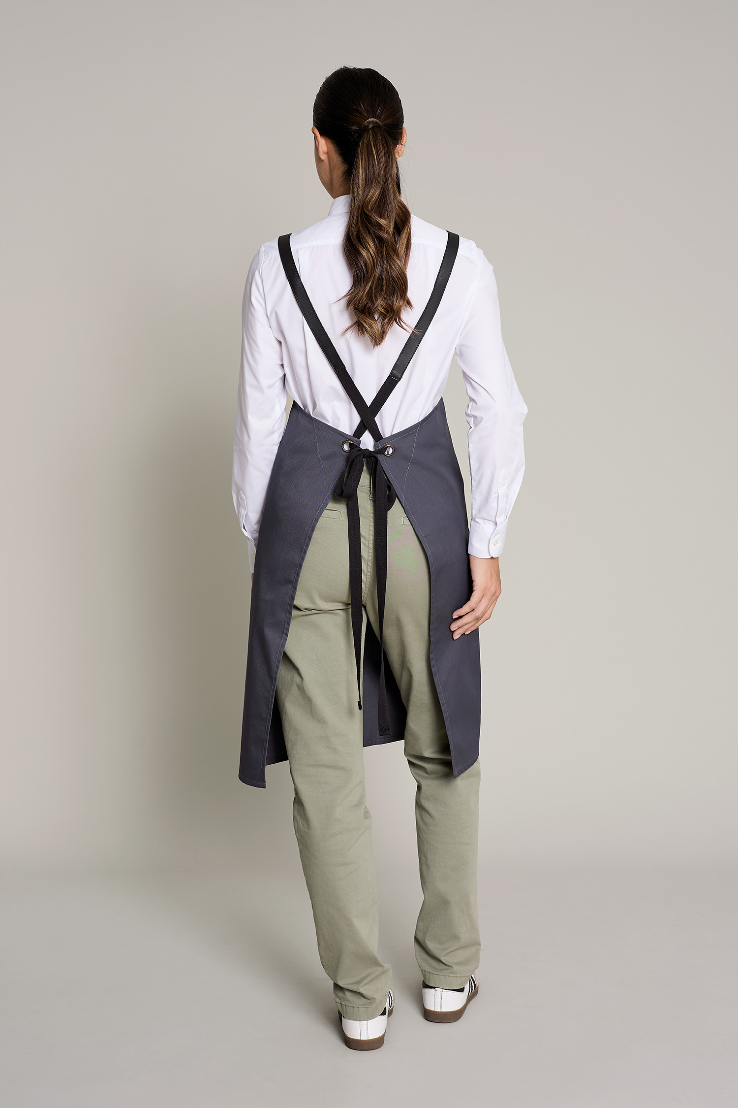 Delantal cruzado espalda color gris con tiras de piel desmontables, doble bolsillo frontal y propósito social. Funcionalidad y estilo