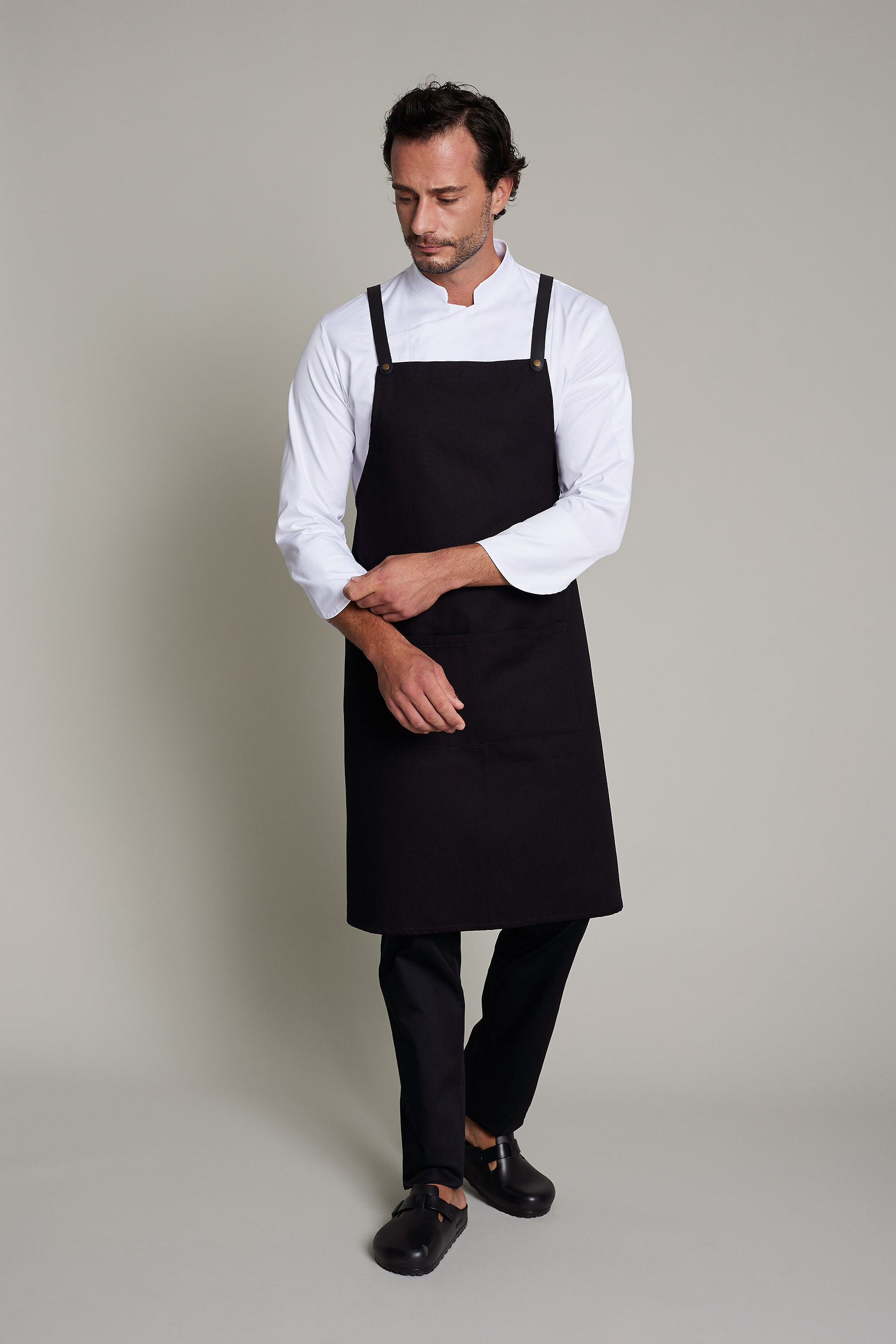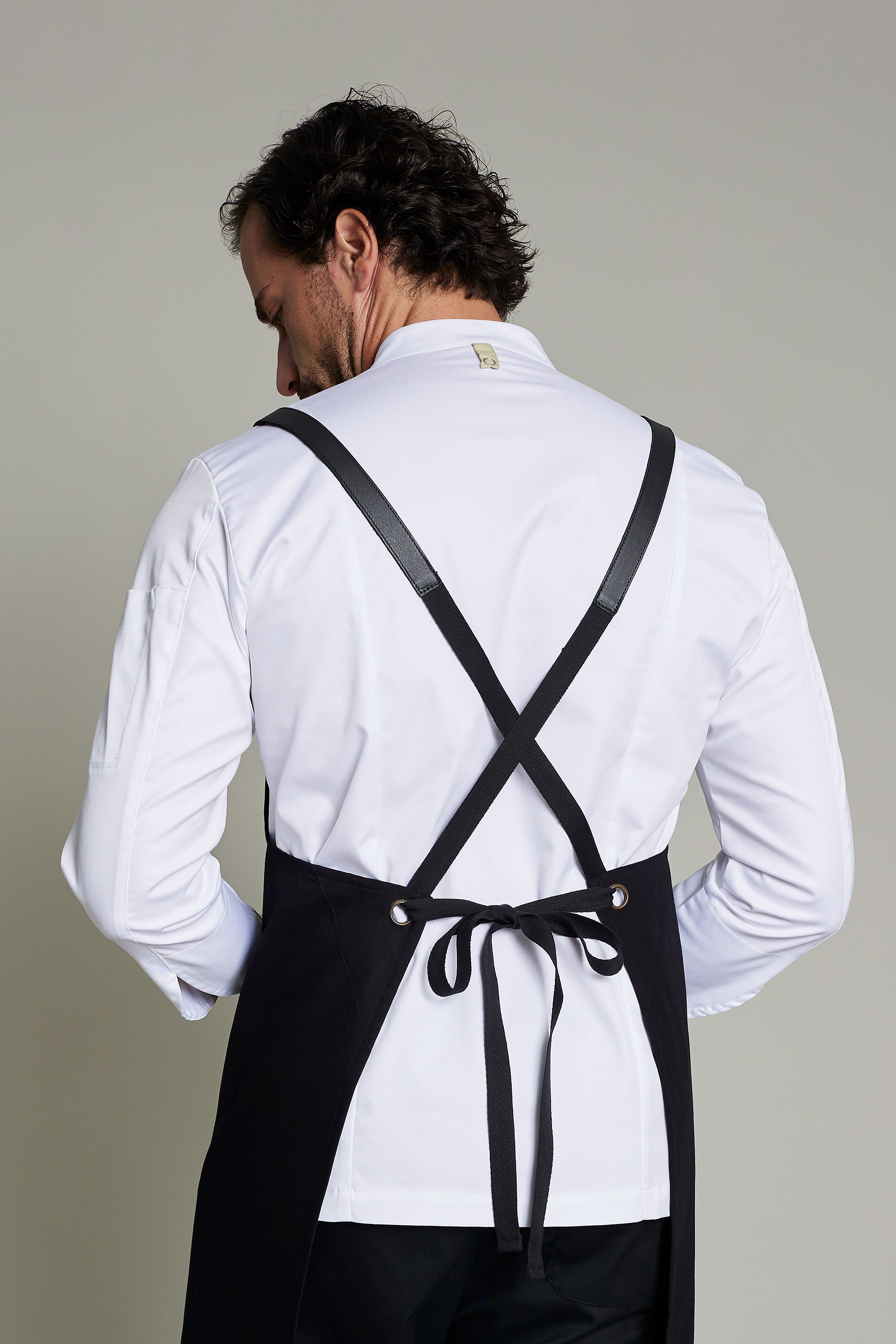 El delantal cruzado en color negro es ideal para profesionales que buscan una prenda funcional, elegante y responsable. Fabricado en tejido de 35% algodón orgánico y 65% poliéster reciclado, con un gramaje de 245 g/m², ofrece durabilidad y rendimiento. Sus tiras desmontables de piel y cinta beta negra facilitan un ajuste cómodo y personalizable, mientras que el diseño cruzado en la espalda reduce la presión cervical, ideal para largas jornadas. Este delantal forma parte de la Colección Delantales con Propósito, elaborada en talleres sociales Km 0 en colaboración con la Fundación Roure, promoviendo la inclusión laboral y generando un impacto social significativo. Además, no requiere plancha, lo que simplifica su cuidado diario