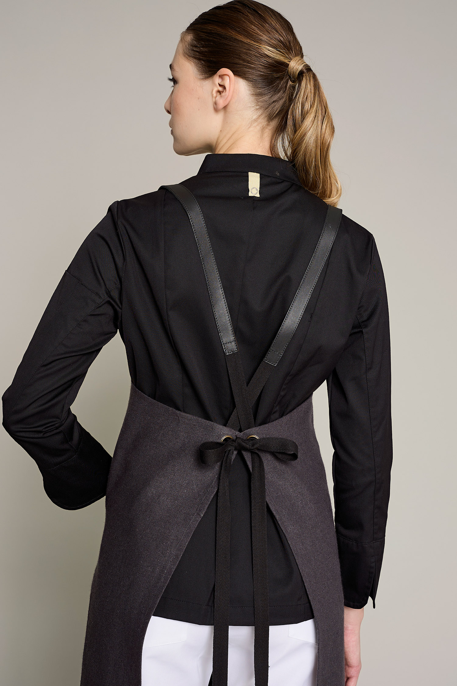 Delantal cruzado negro con tiras desmontables de piel y doble bolsillo. Tejido sostenible y producido con impacto social positivo