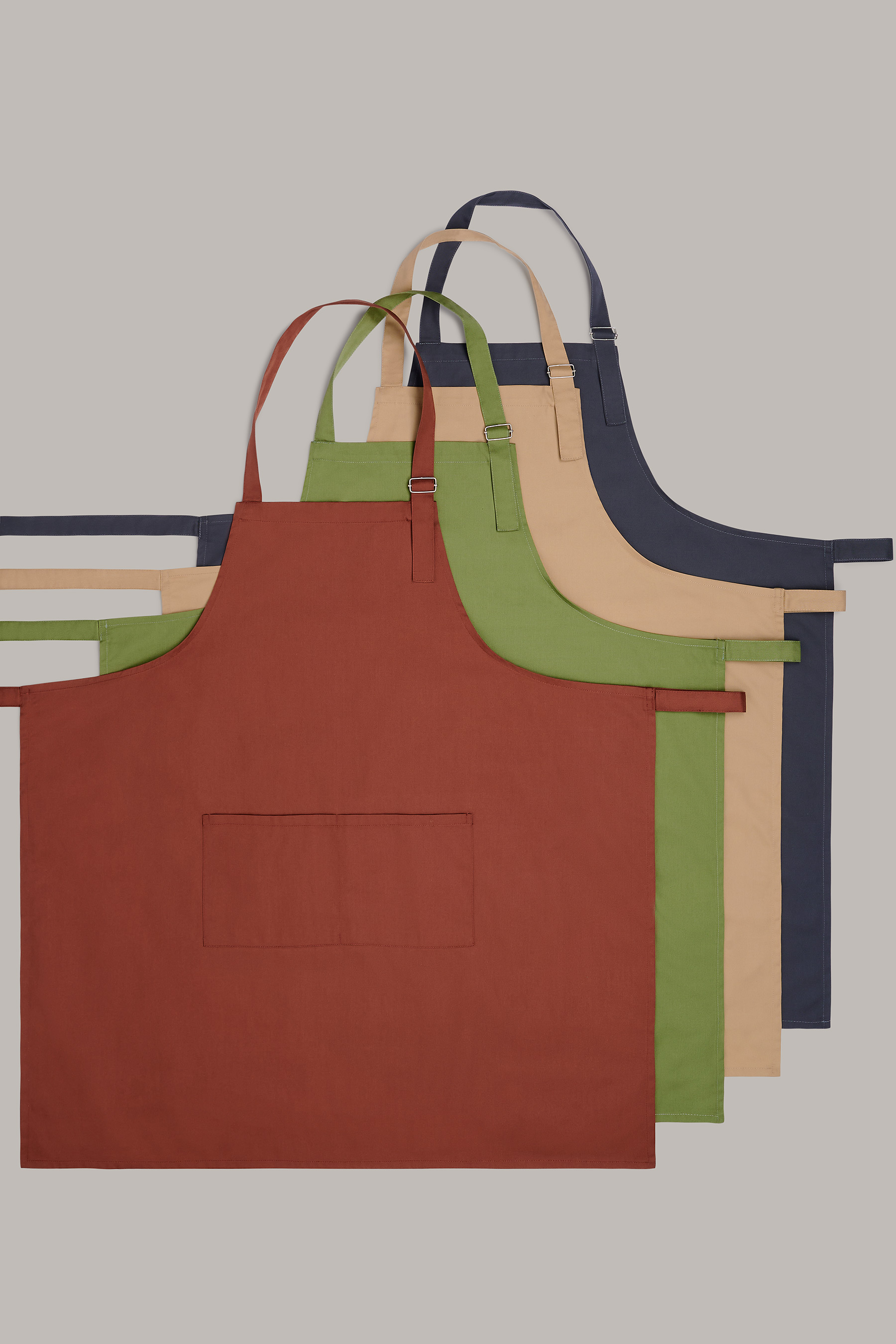 Mandil corto unisex en color caldera con doble bolsillo tipo plastrón. Elaborado en talleres sociales Km 0 para generar impacto positivo