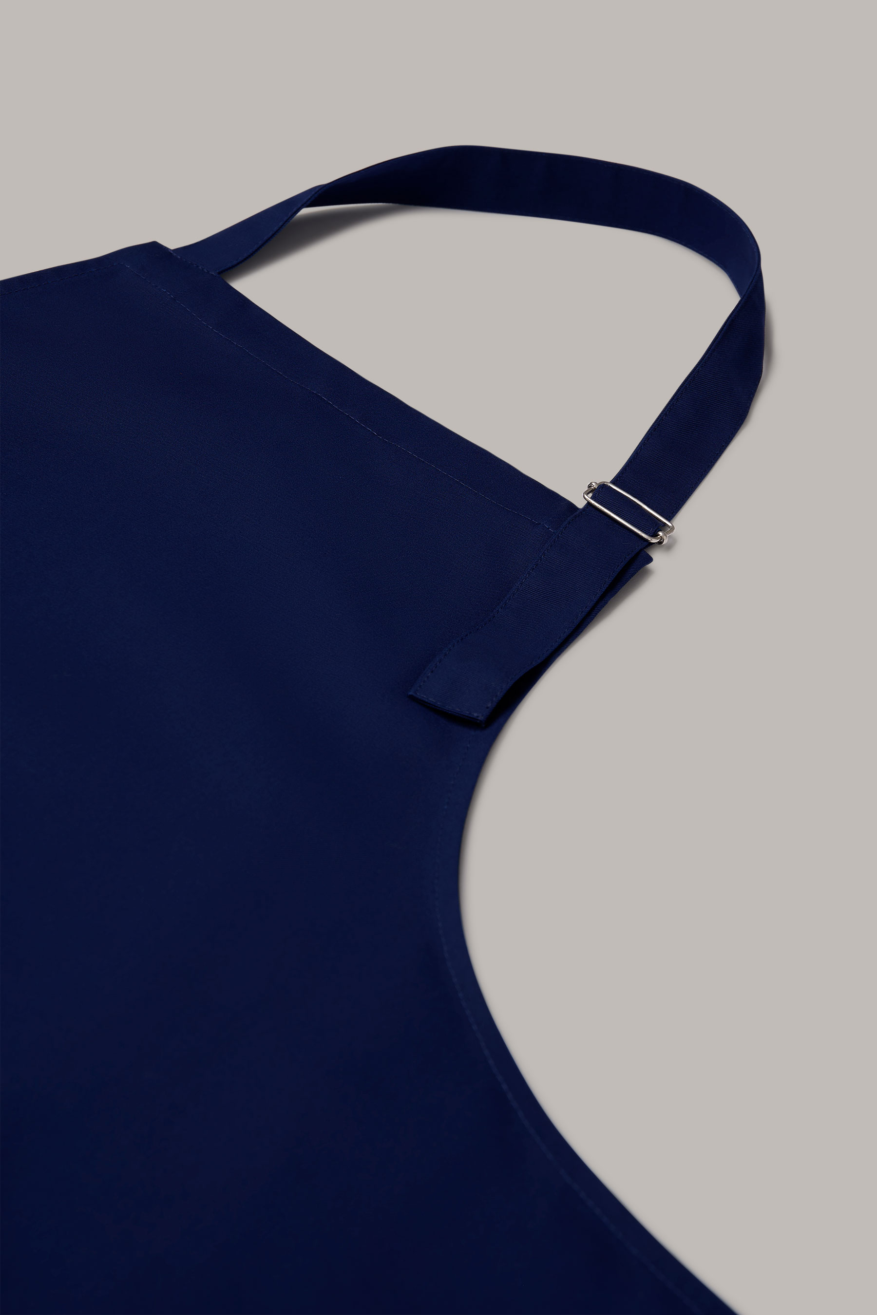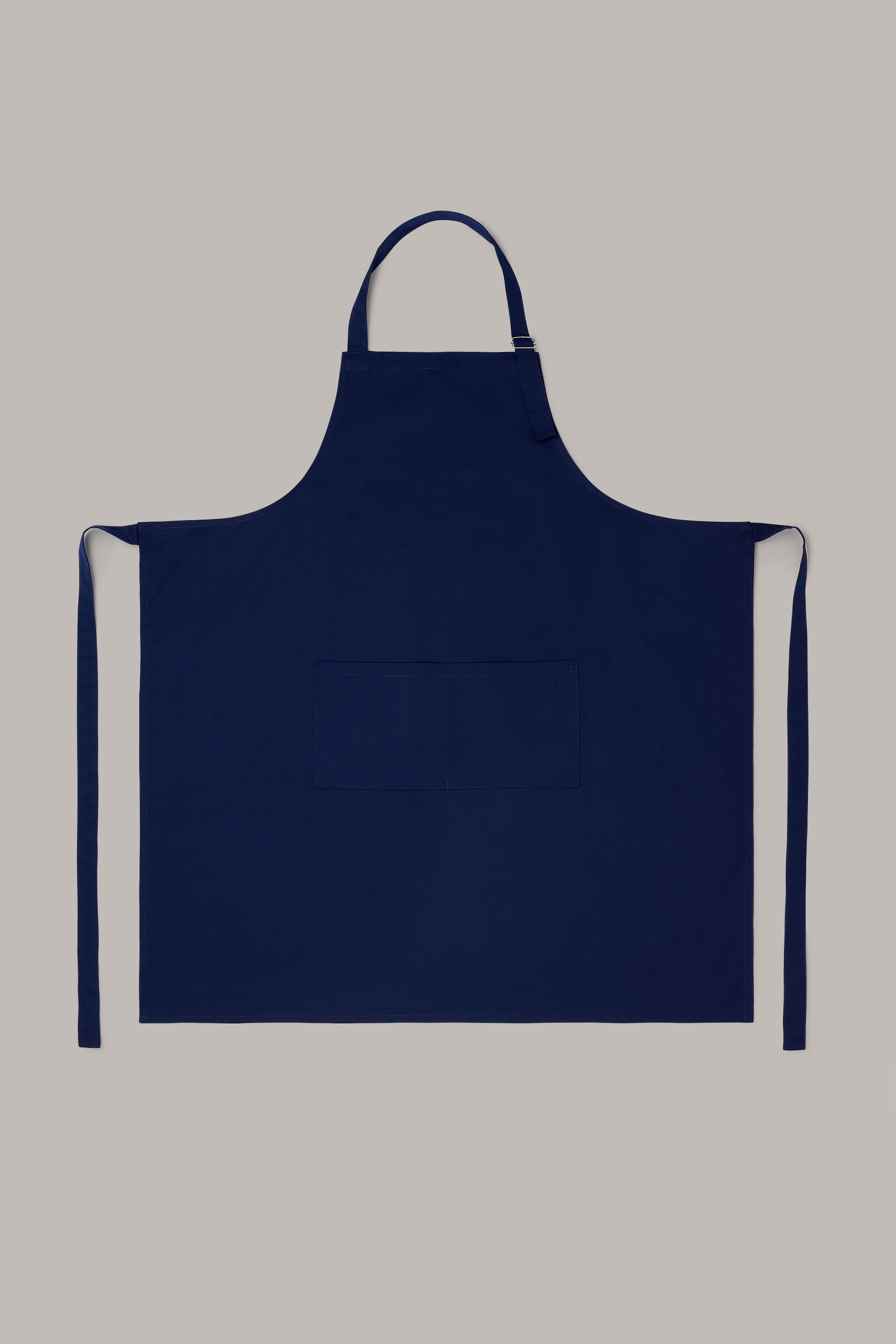 Delantal unisex azul intenso con doble bolsillo, tejido sostenible y sin necesidad de plancha. Confeccionado en talleres sociales Km 0. Impacto social positivo