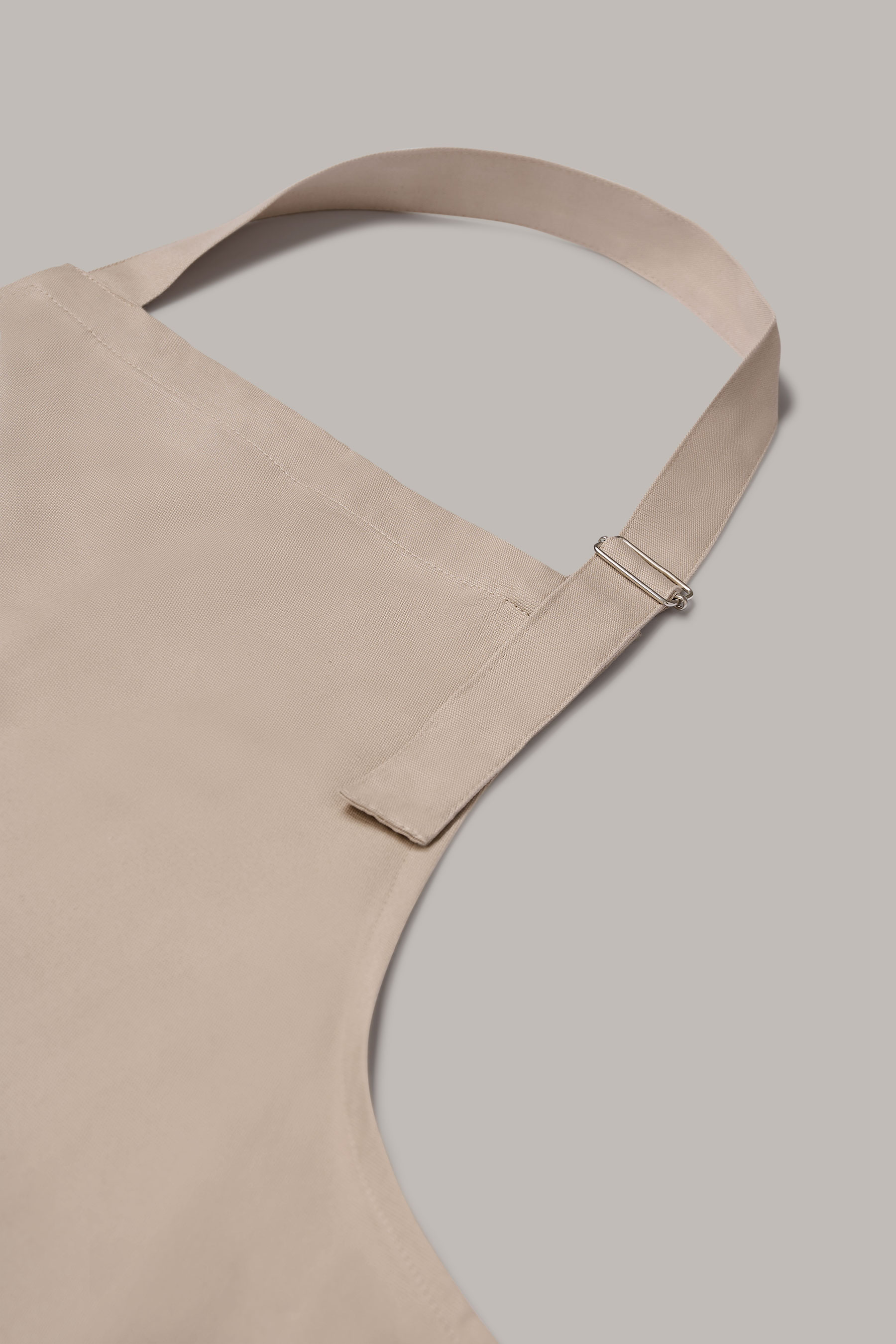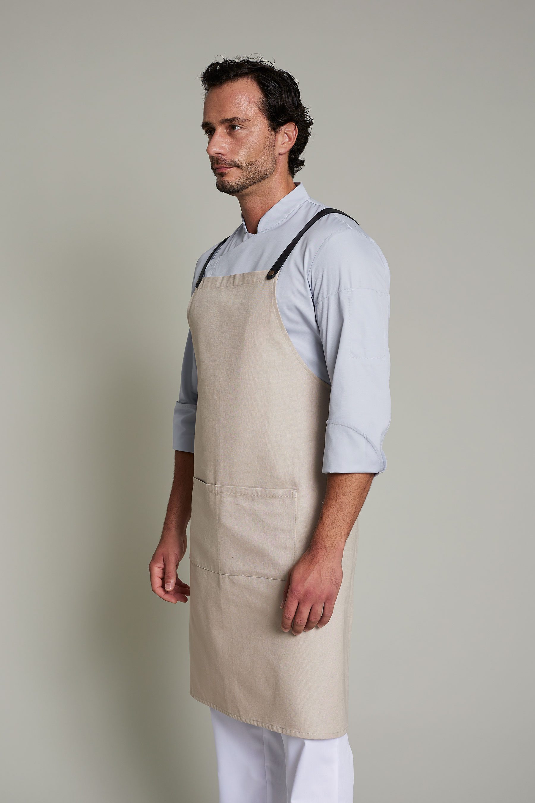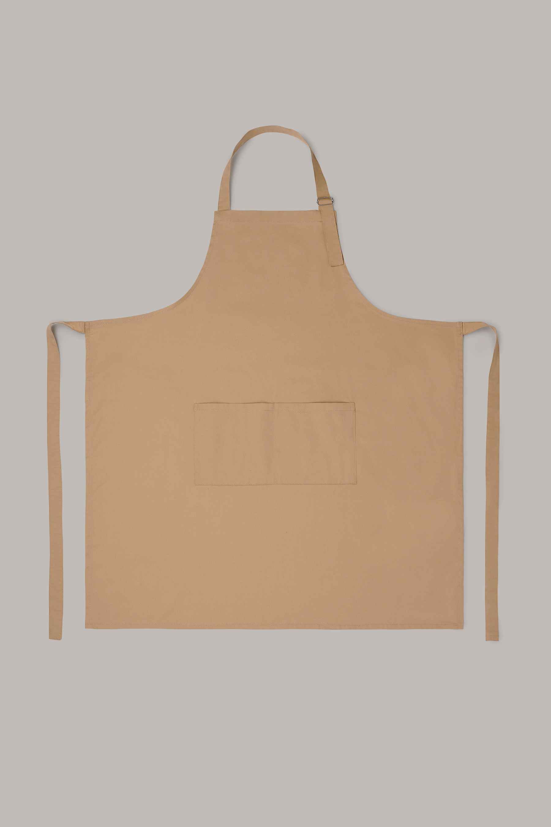 Delantal largo unisex en color lino-piedra, con hebilla ajustable y doble bolsillo tipo plastrón. Fabricado en algodón orgánico en talleres sociales Km 0