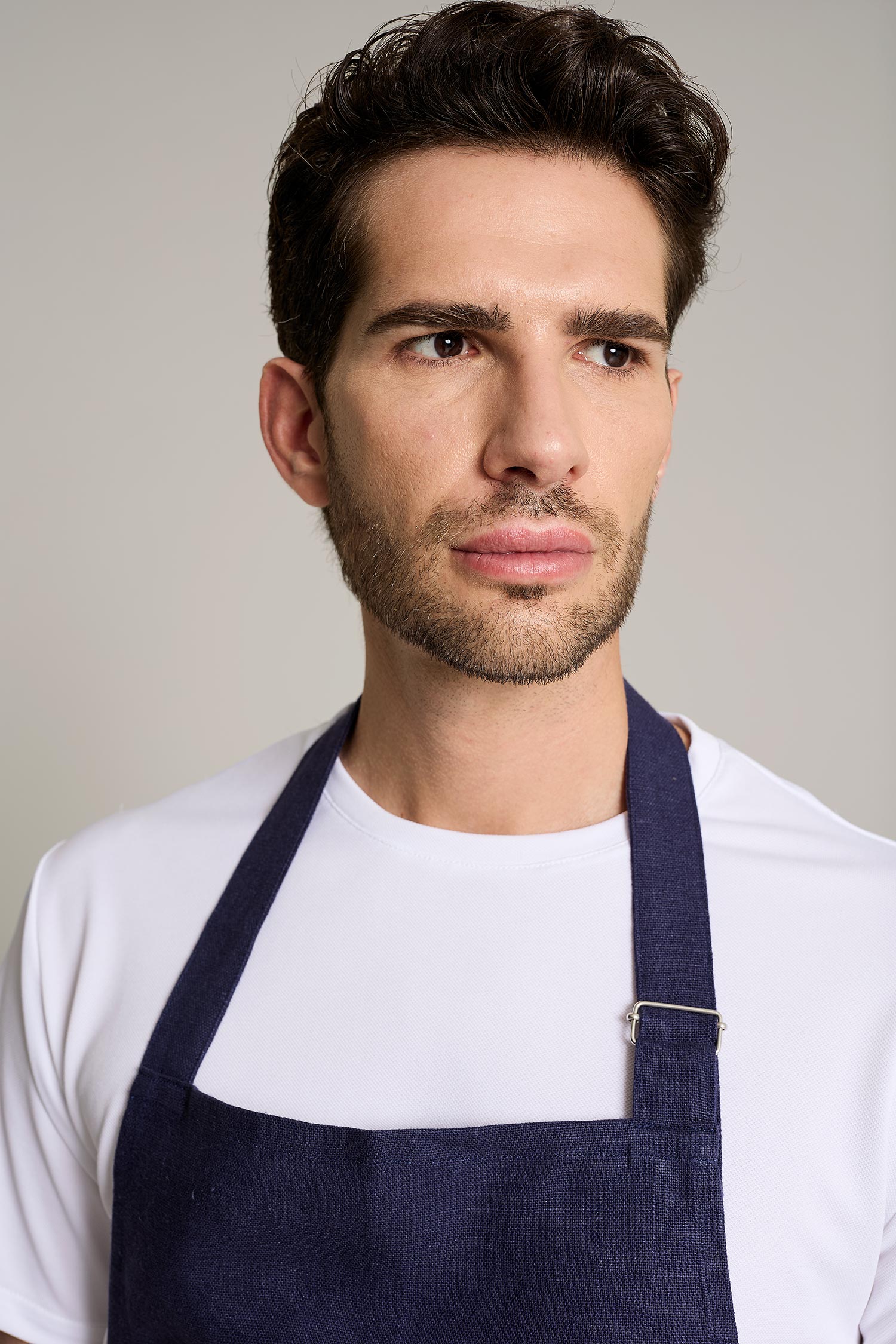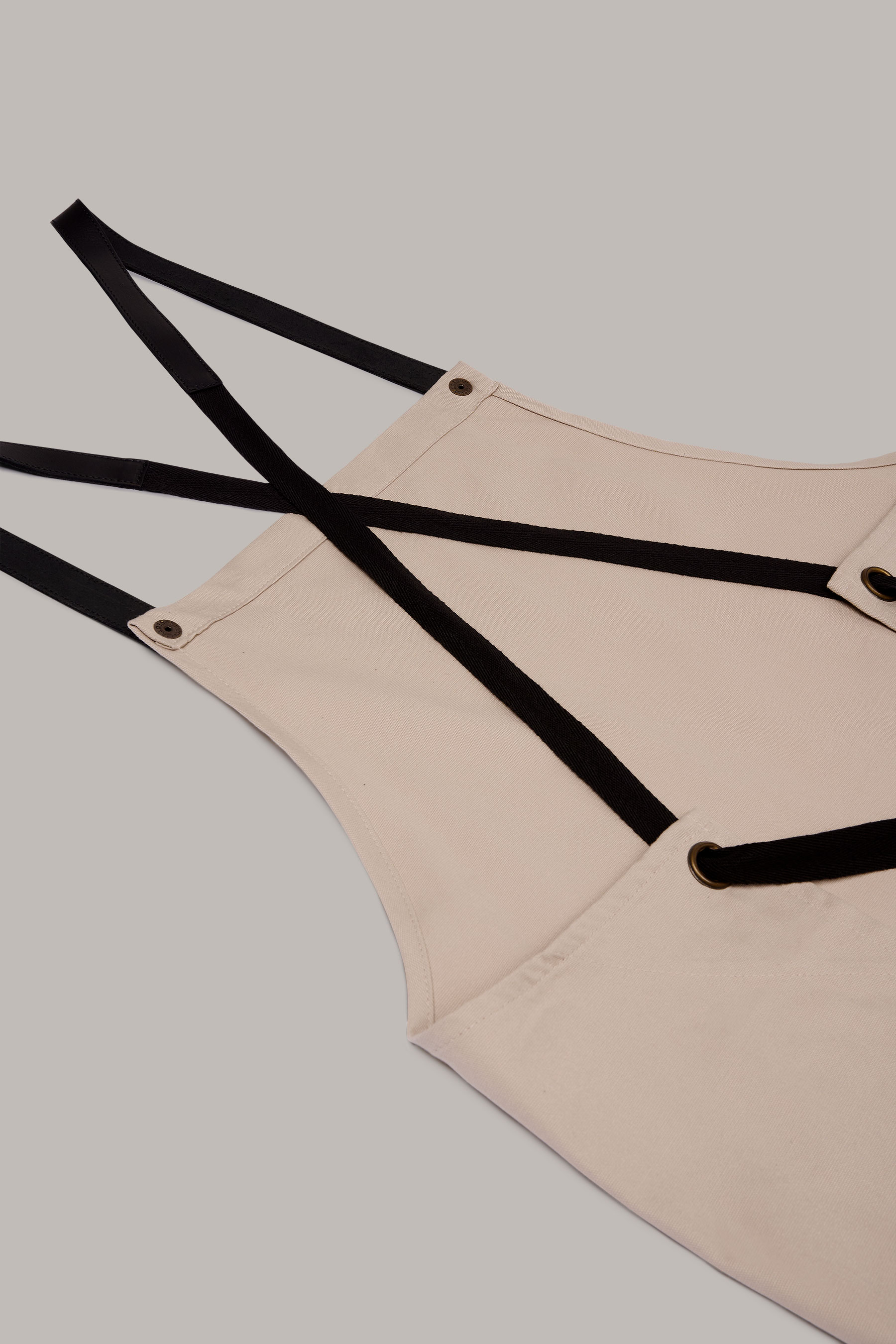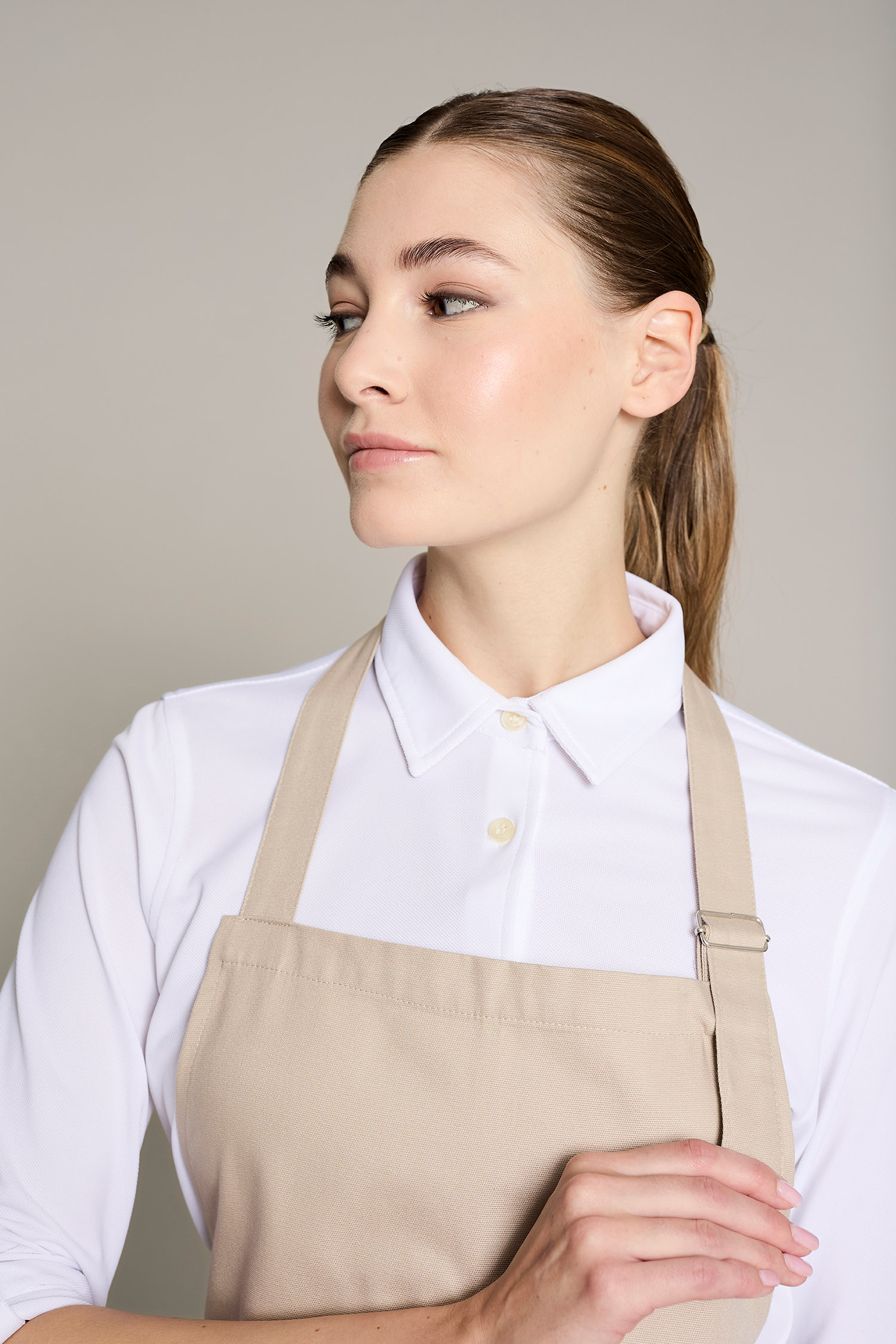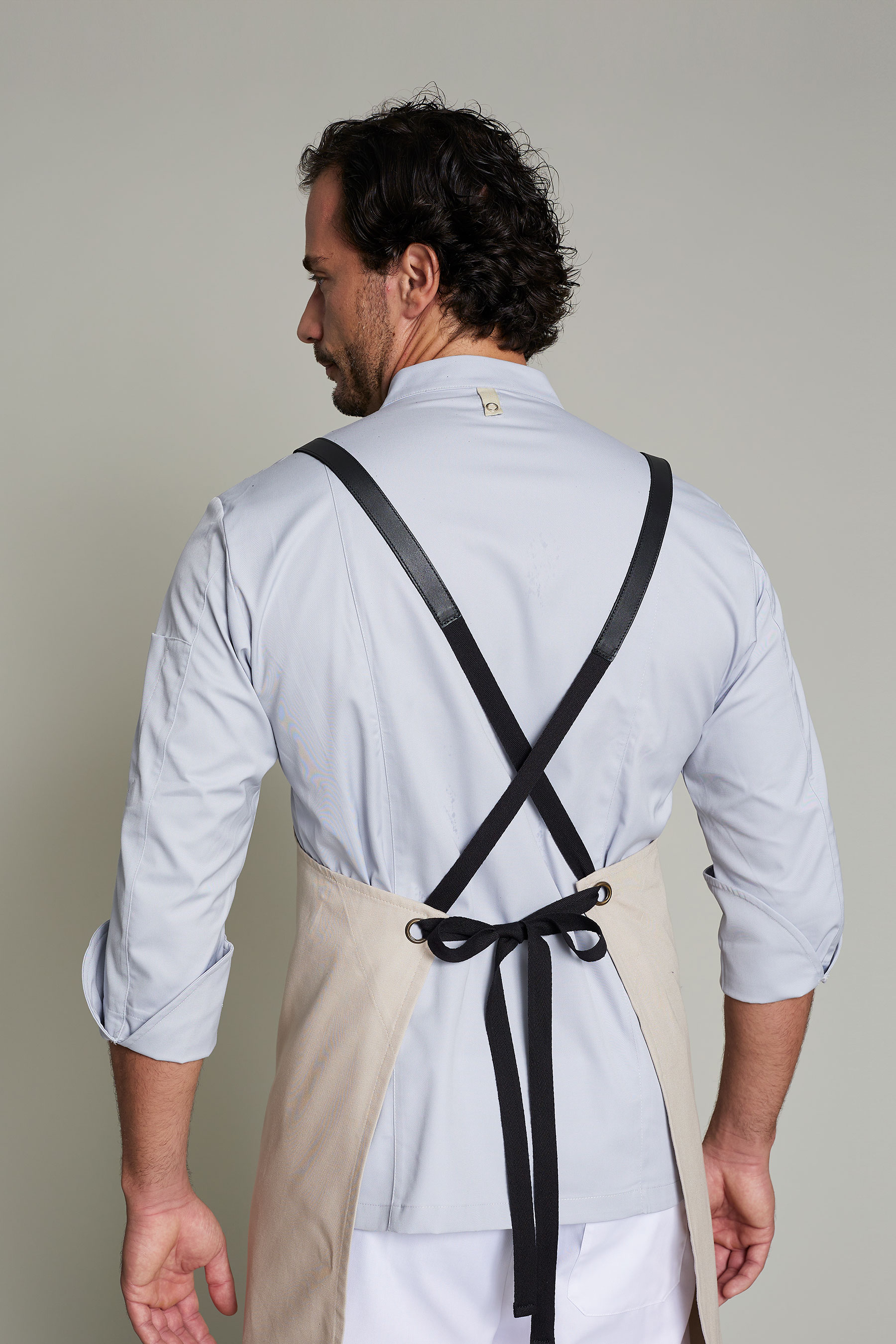 Delantal largo unisex en color lino-piedra, con hebilla ajustable y doble bolsillo tipo plastrón. Fabricado en algodón orgánico en talleres sociales Km 0