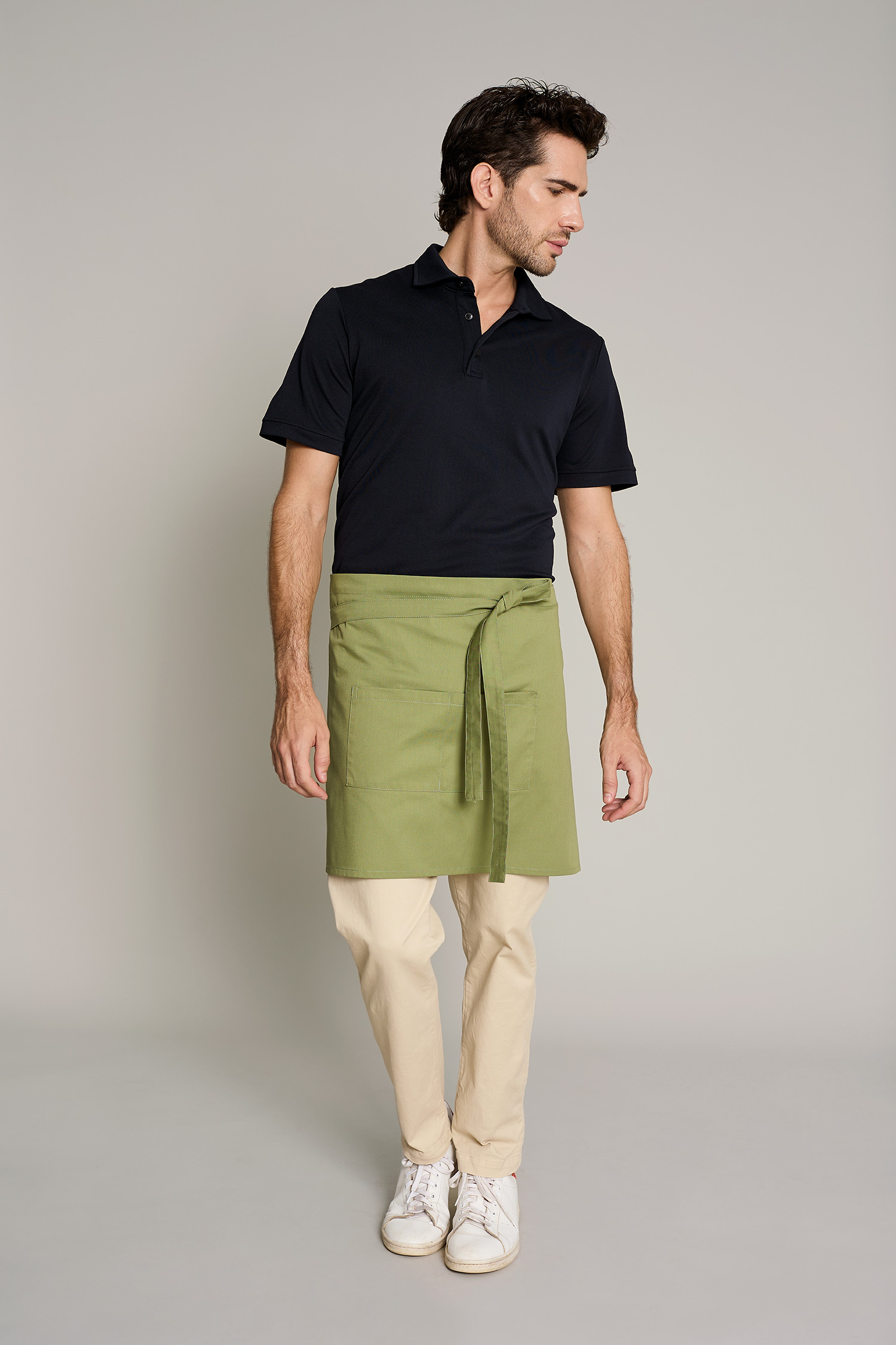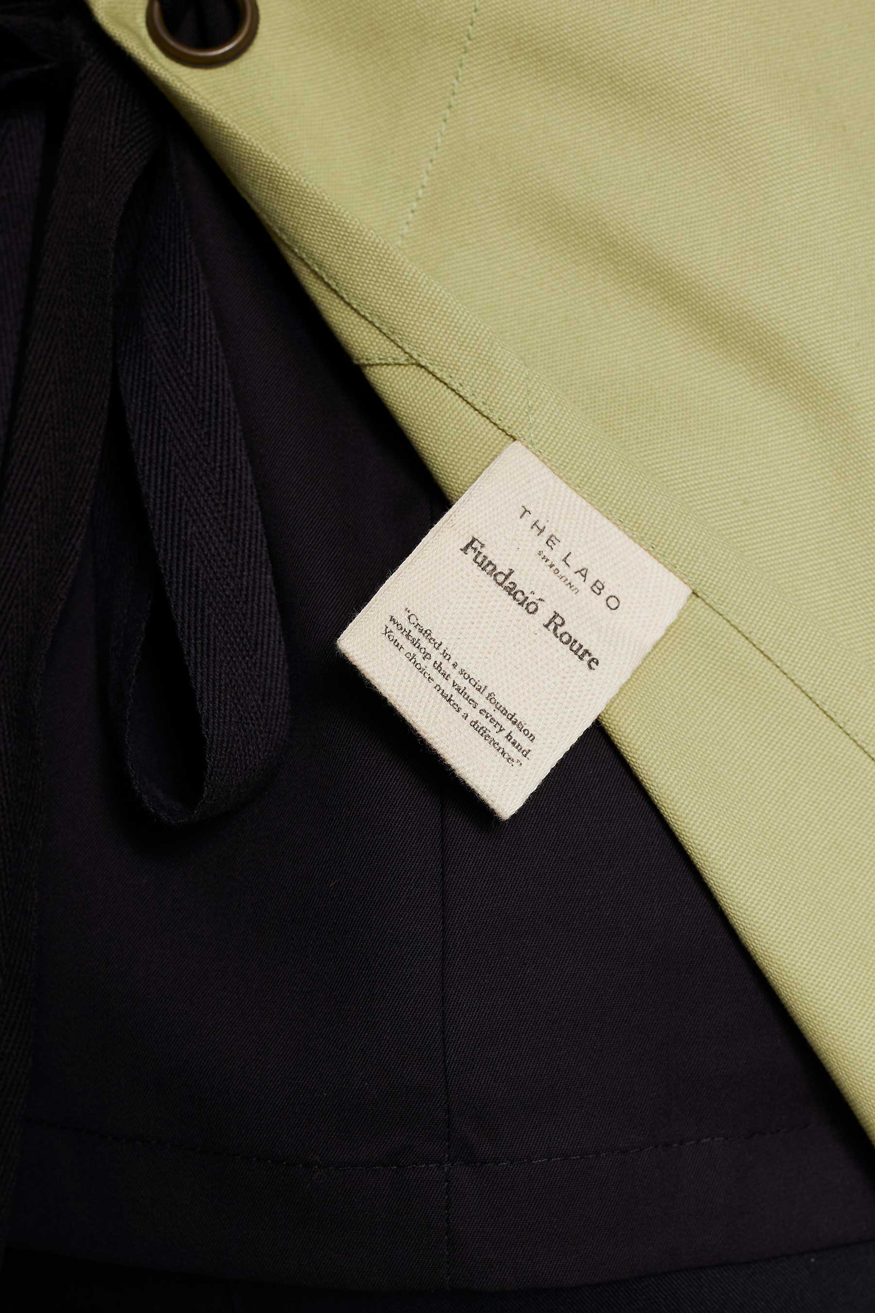 Este delantal en color verde está diseñado para entornos laborales que requieren resistencia y estilo. Fabricado en tejido de mezcla de 35% algodón y 65% poliéster, garantiza durabilidad y fácil mantenimiento. Su hebilla ajustable permite un ajuste cómodo y cuenta también con un espacioso y práctico doble bolsillo central. Como parte de nuestra Colección Delantales con Propósito, este producto es confeccionado en talleres sociales Km 0 en colaboración con la Fundación Roure, fomentando la inclusión laboral y un impacto social positivo
