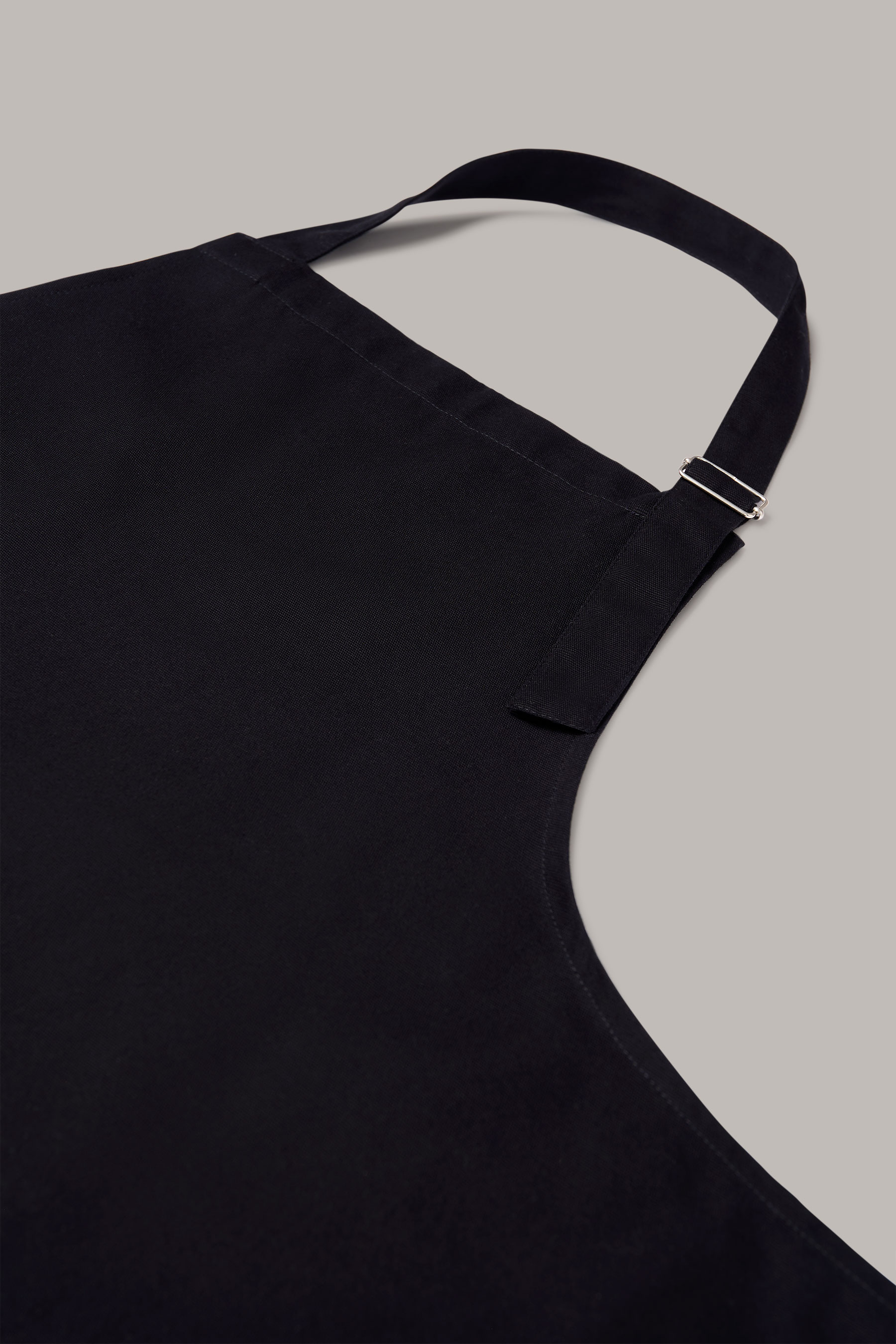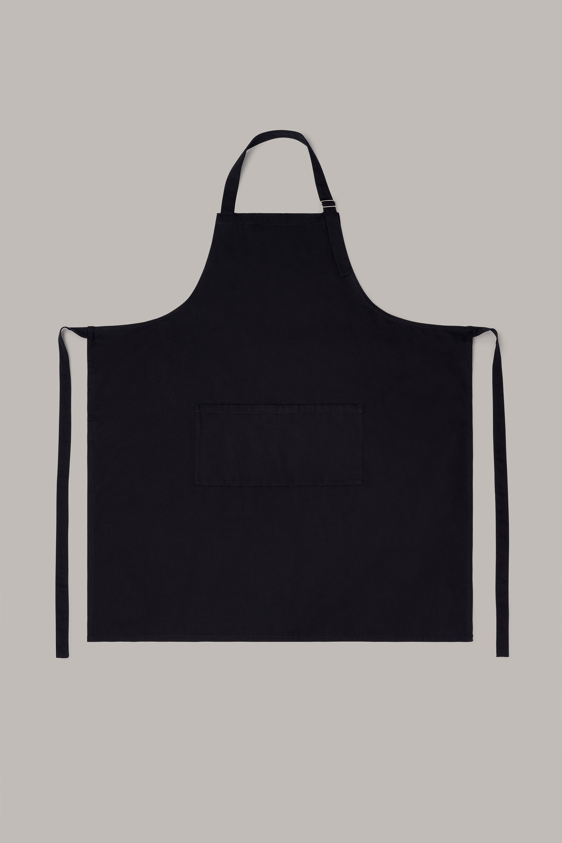 Delantal largo unisex en color negro, con hebilla ajustable y doble bolsillo tipo plastrón. Fabricado en algodón orgánico en talleres sociales Km 0