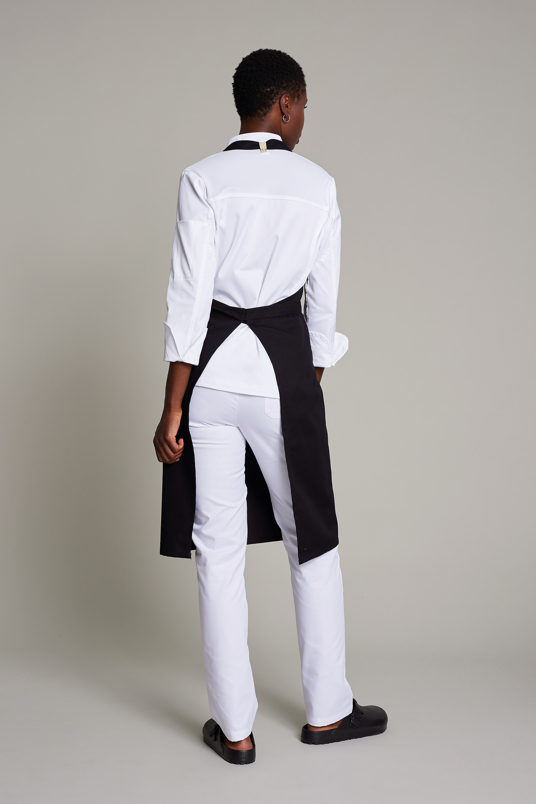 Delantal cruzado negro con tiras desmontables de piel y doble bolsillo. Tejido sostenible y producido con impacto social positivo