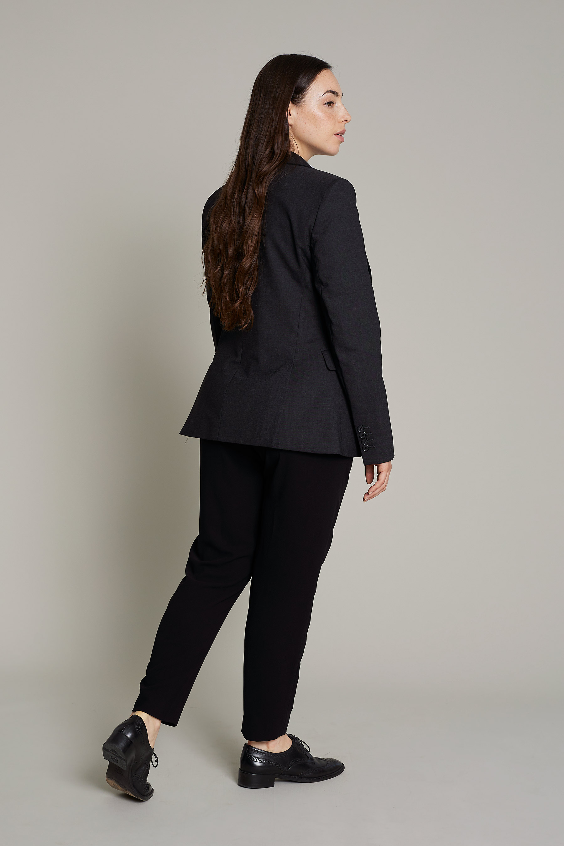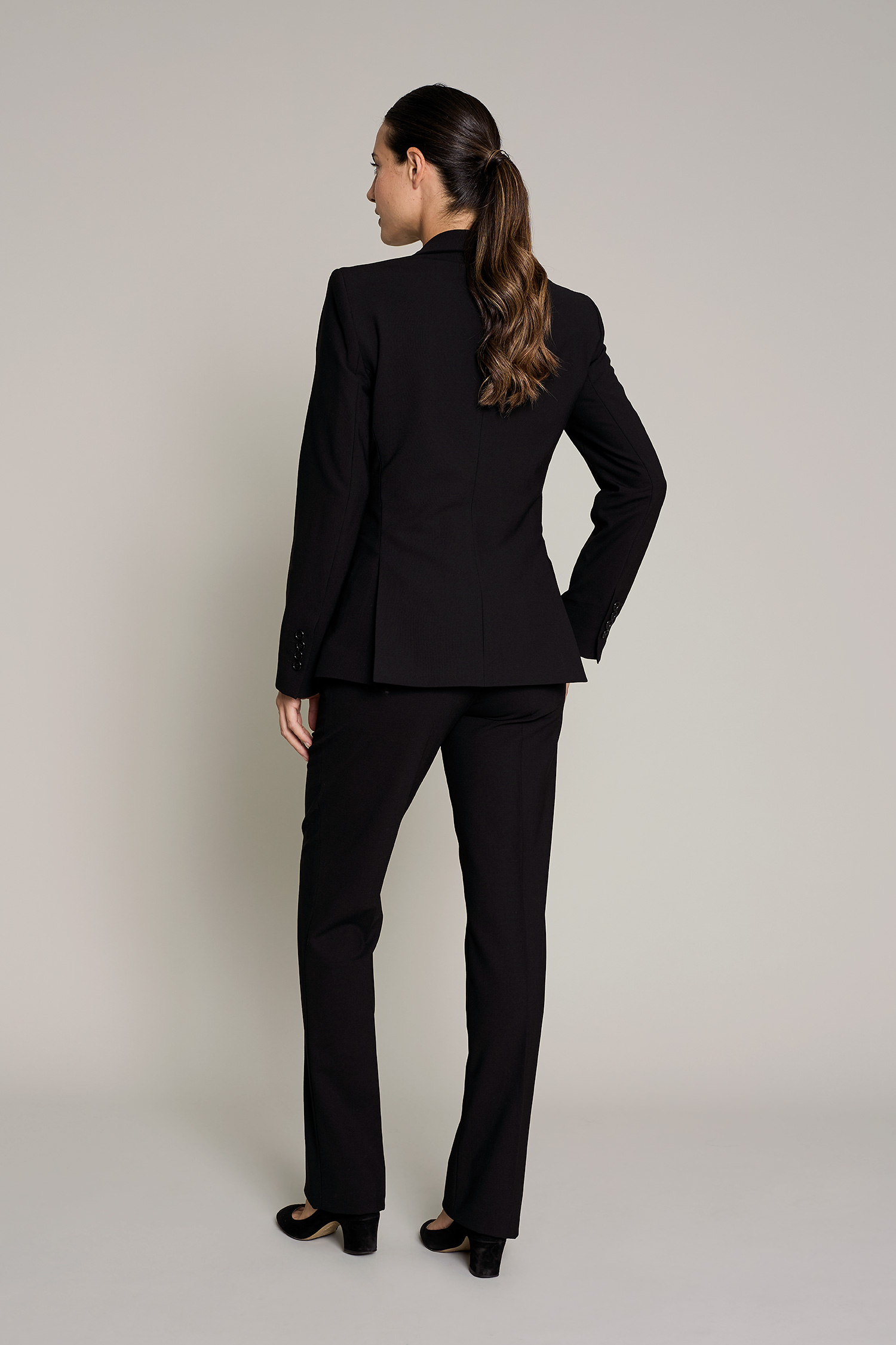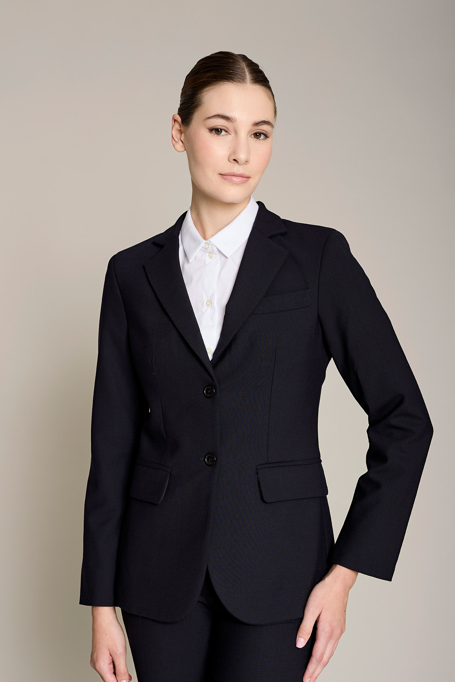La americana sastre de mujer en color negro, tiene cuello mao y es una prenda diseñada para profesionales que buscan estilo y confort sin comprometer la funcionalidad. Su diseño moderno y tejido técnico permiten una gran libertad de movimiento, adaptándose perfectamente a cualquier entorno de trabajo. Con una composición de 42% lana 54% poliéster 4% elastán, esta prenda garantiza transpirabilidad y resistencia al desgaste