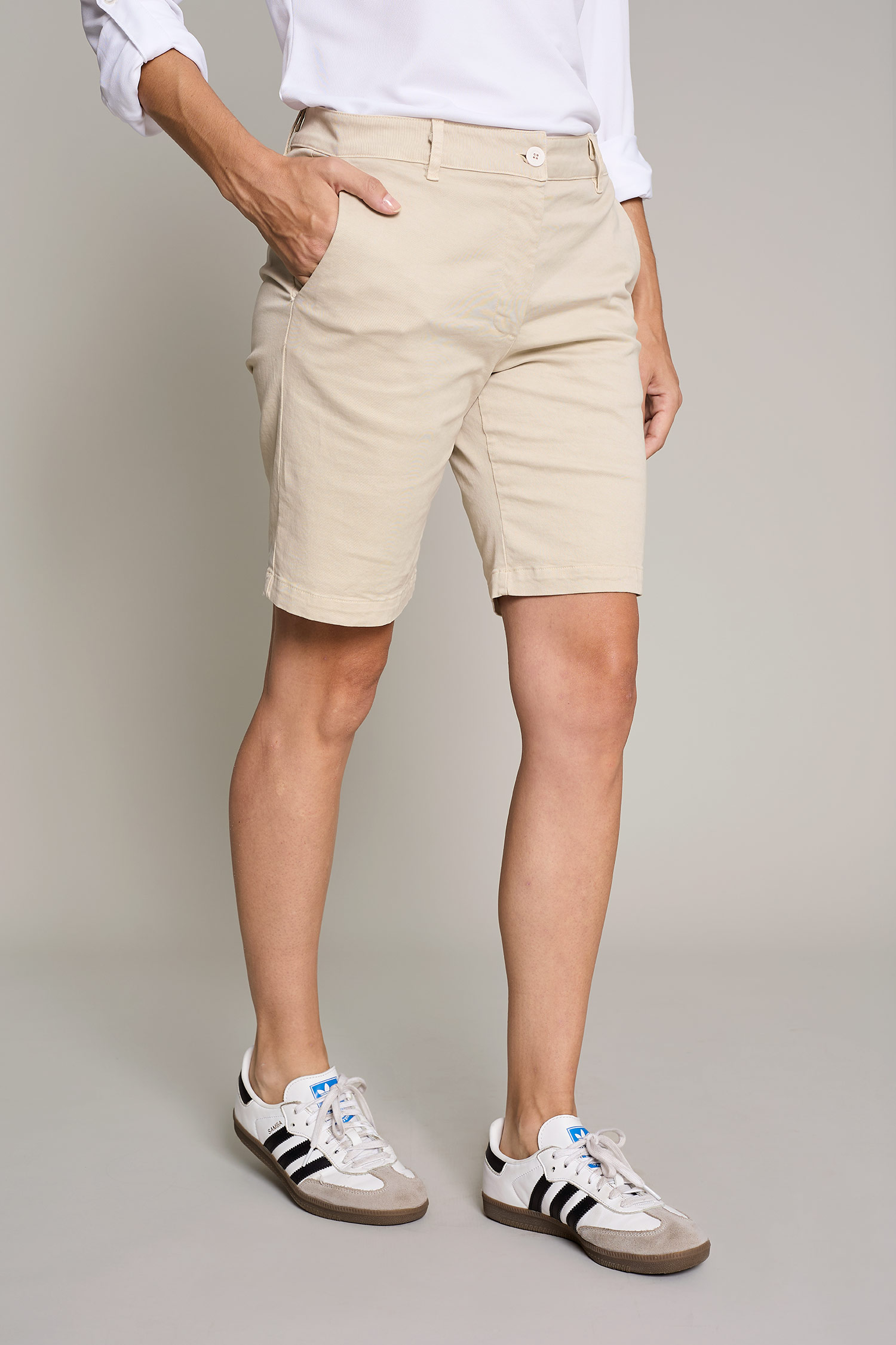 Pantalón chino de mujer en color beige lavado de algodón para un máximo confort y estilo para el trabajo
