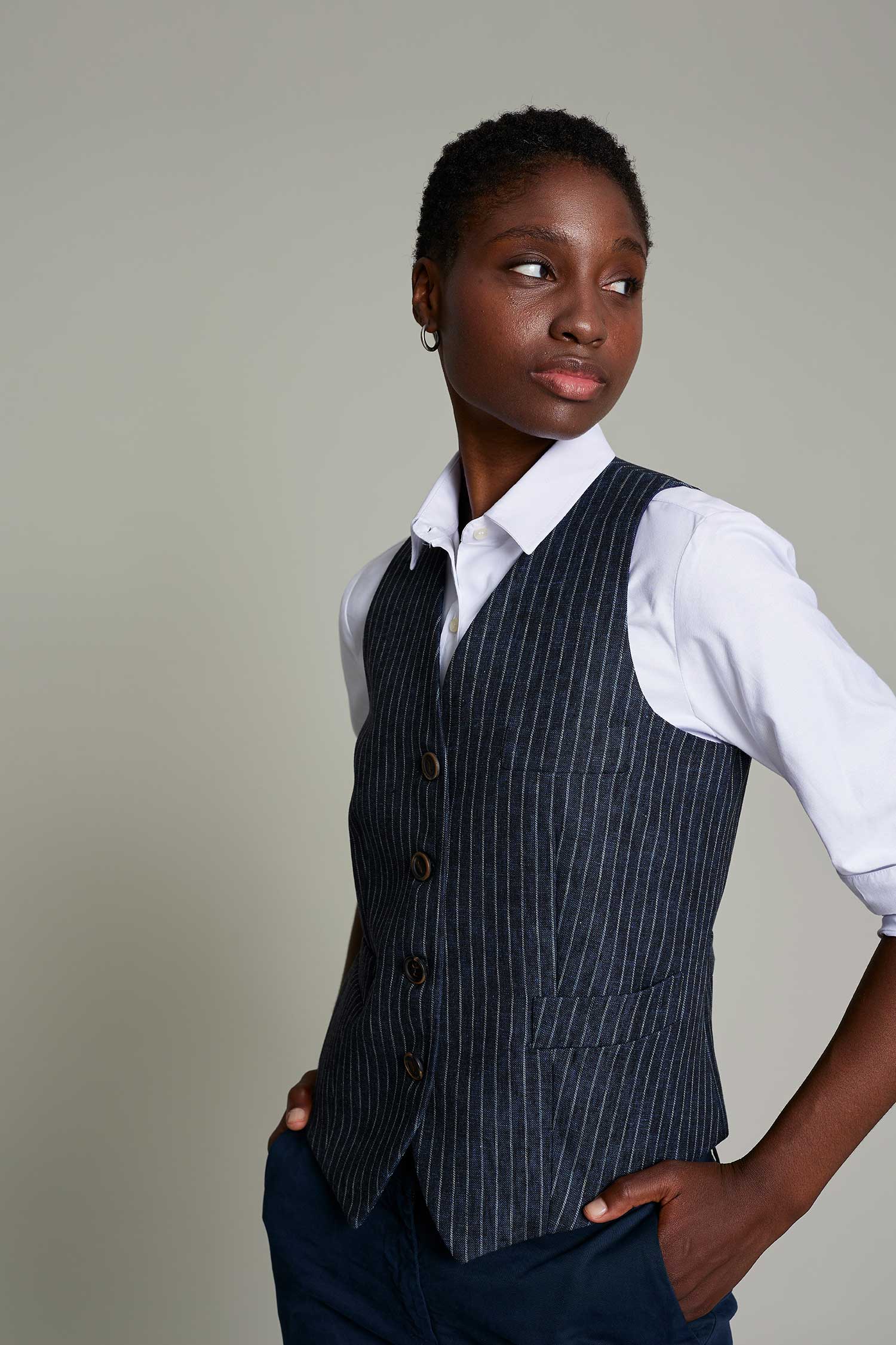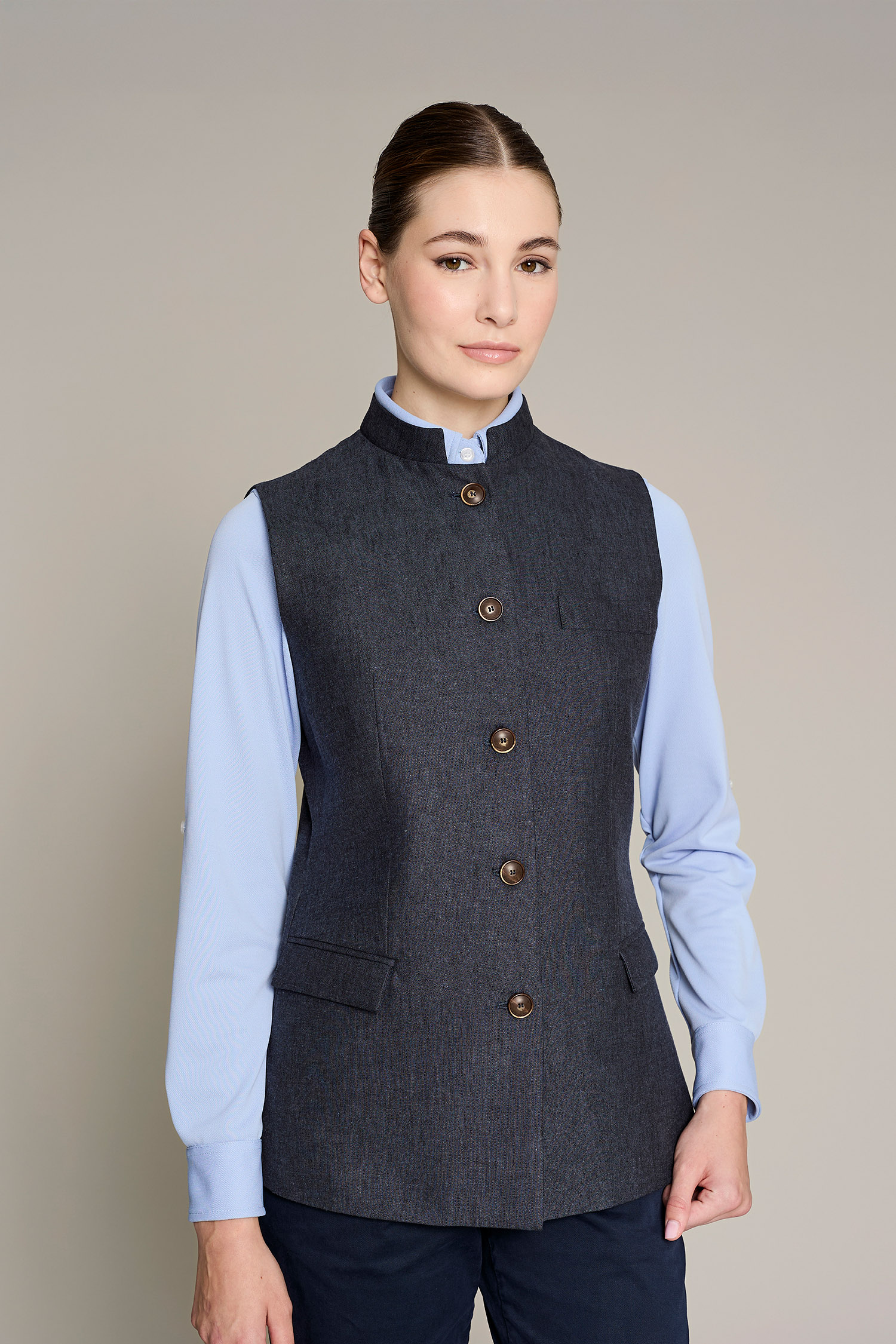 Americana sastre de mujer en color gris con tejido de lino, que ofrece confort y estilo para el trabajo. No requiere plancha