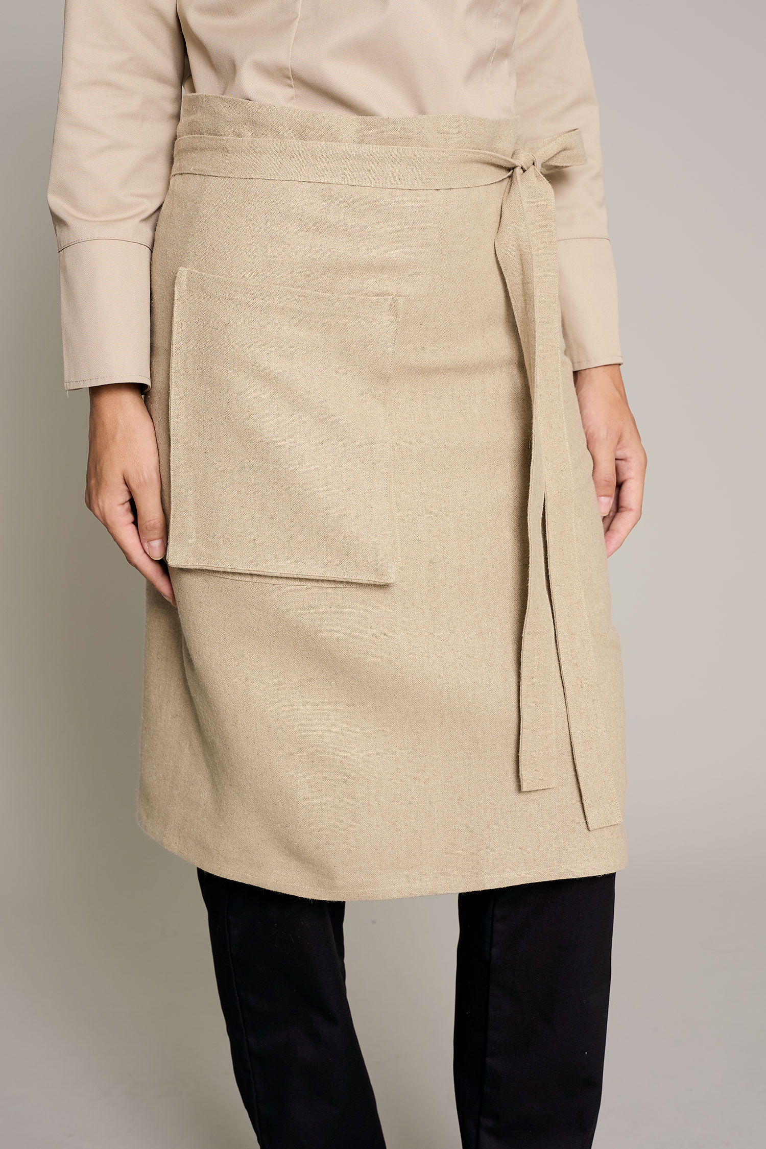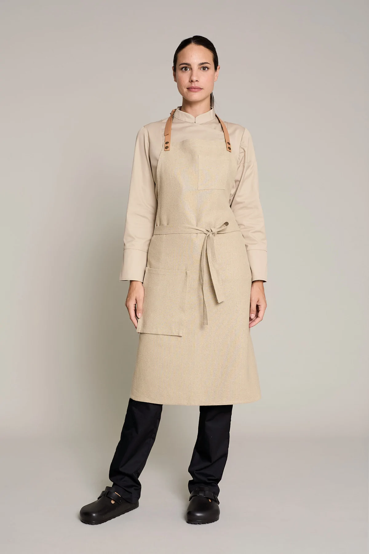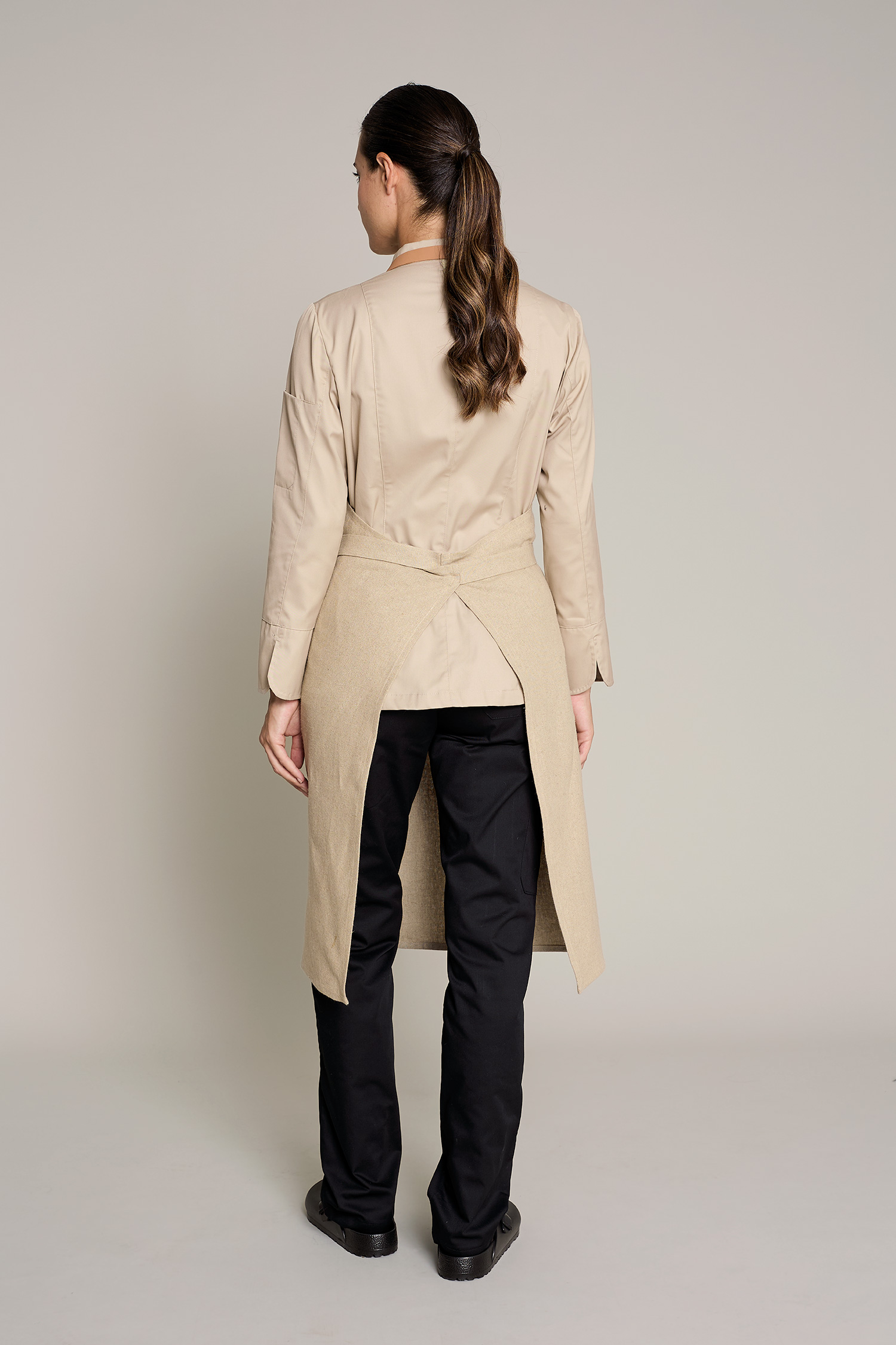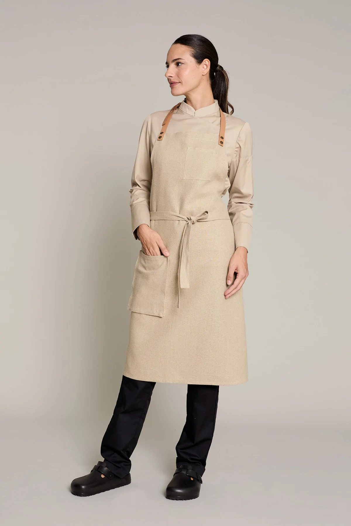 Mandil unisex en color lino natural, que ofrece comodidad y estilo en entornos laborales