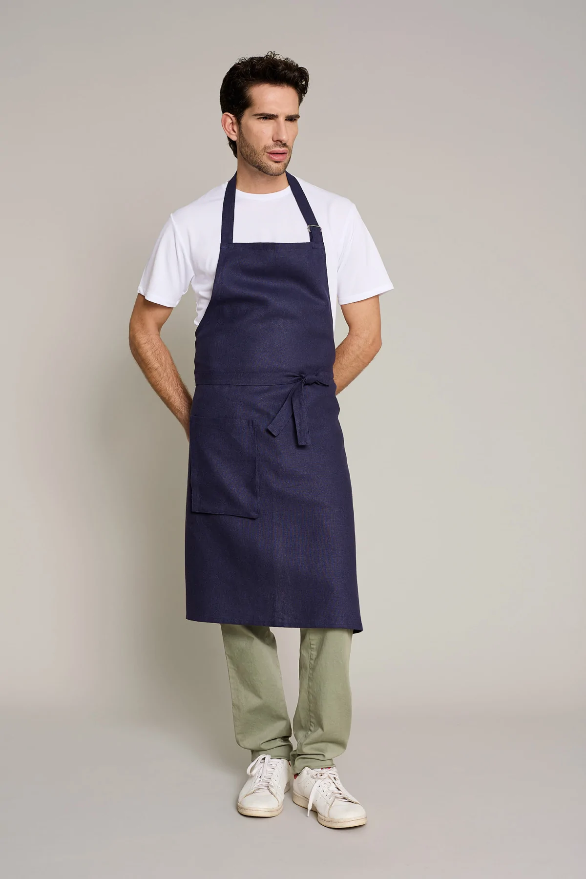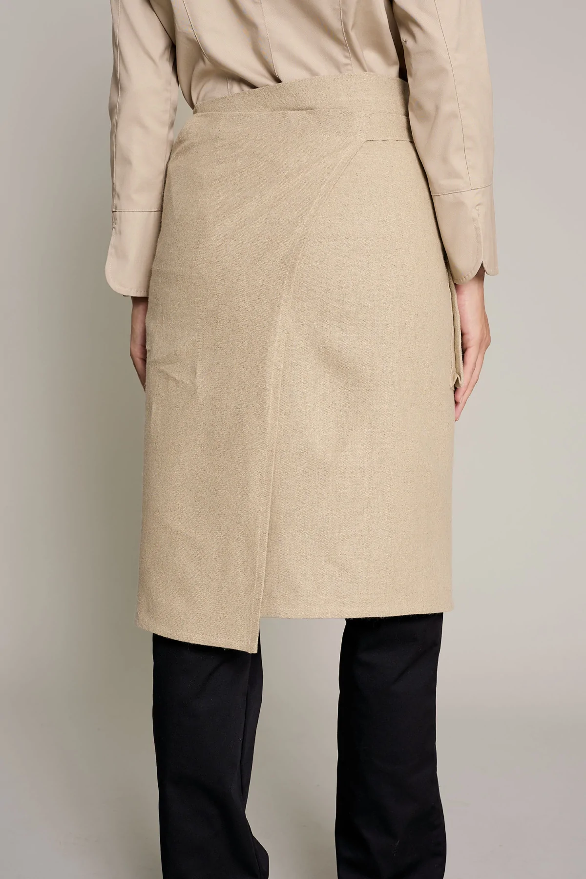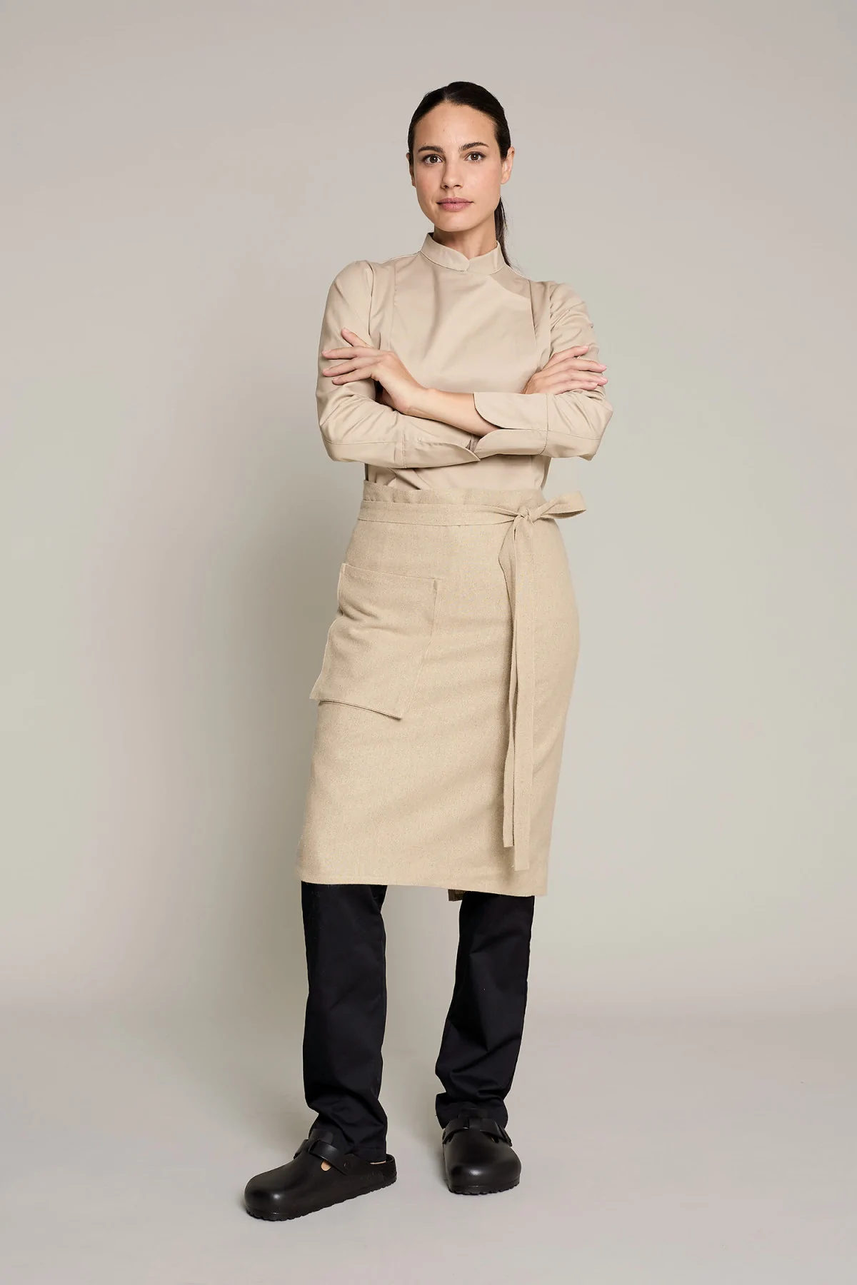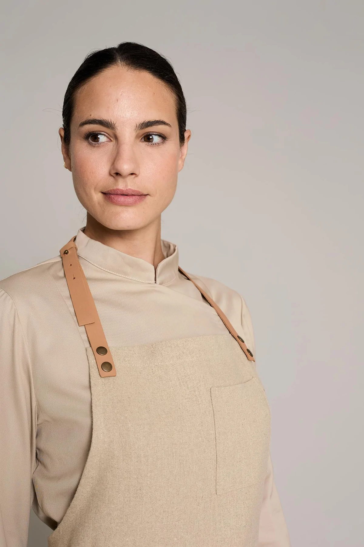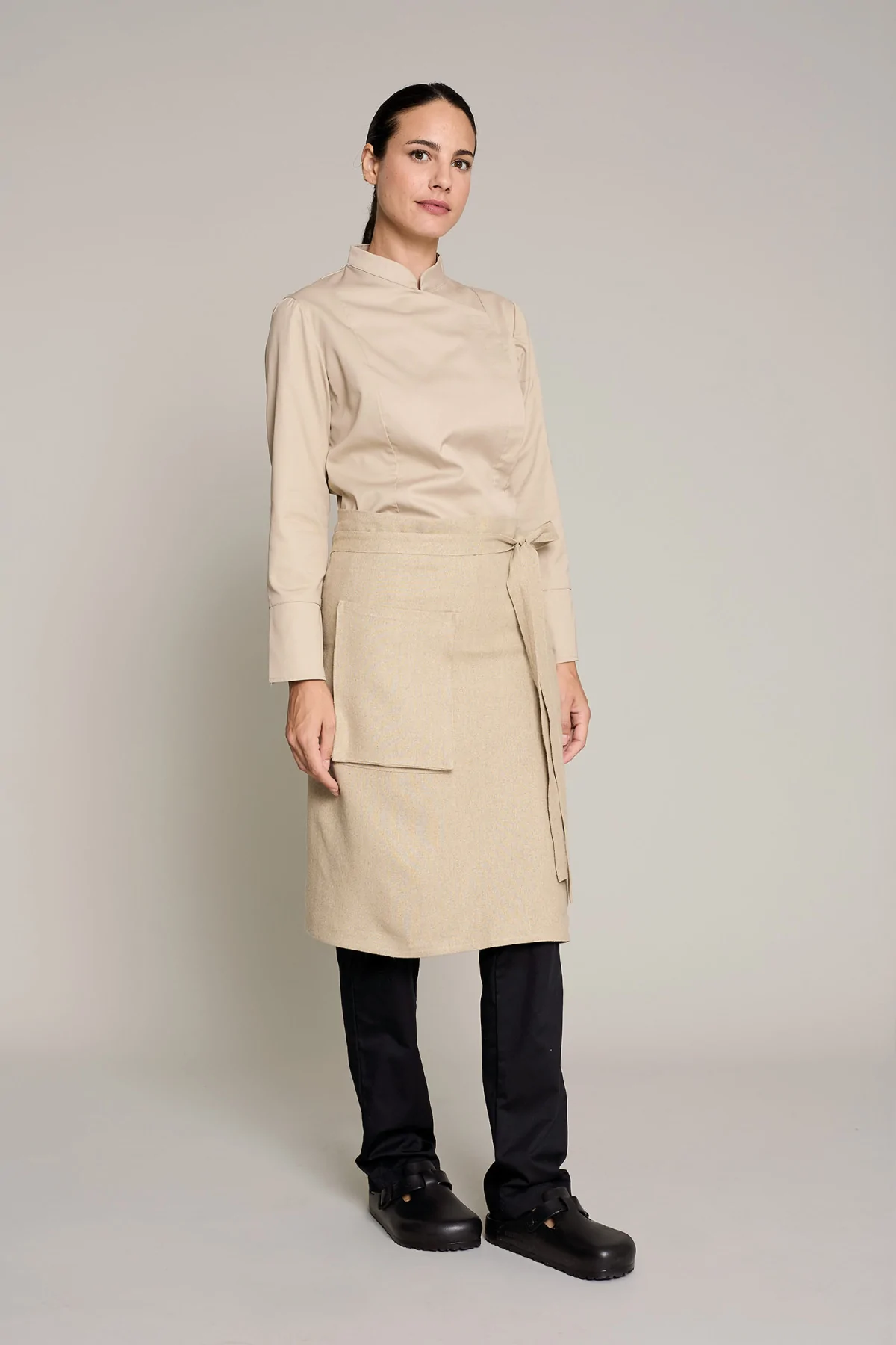 Mandil unisex en color lino natural, que ofrece comodidad y estilo en entornos laborales
