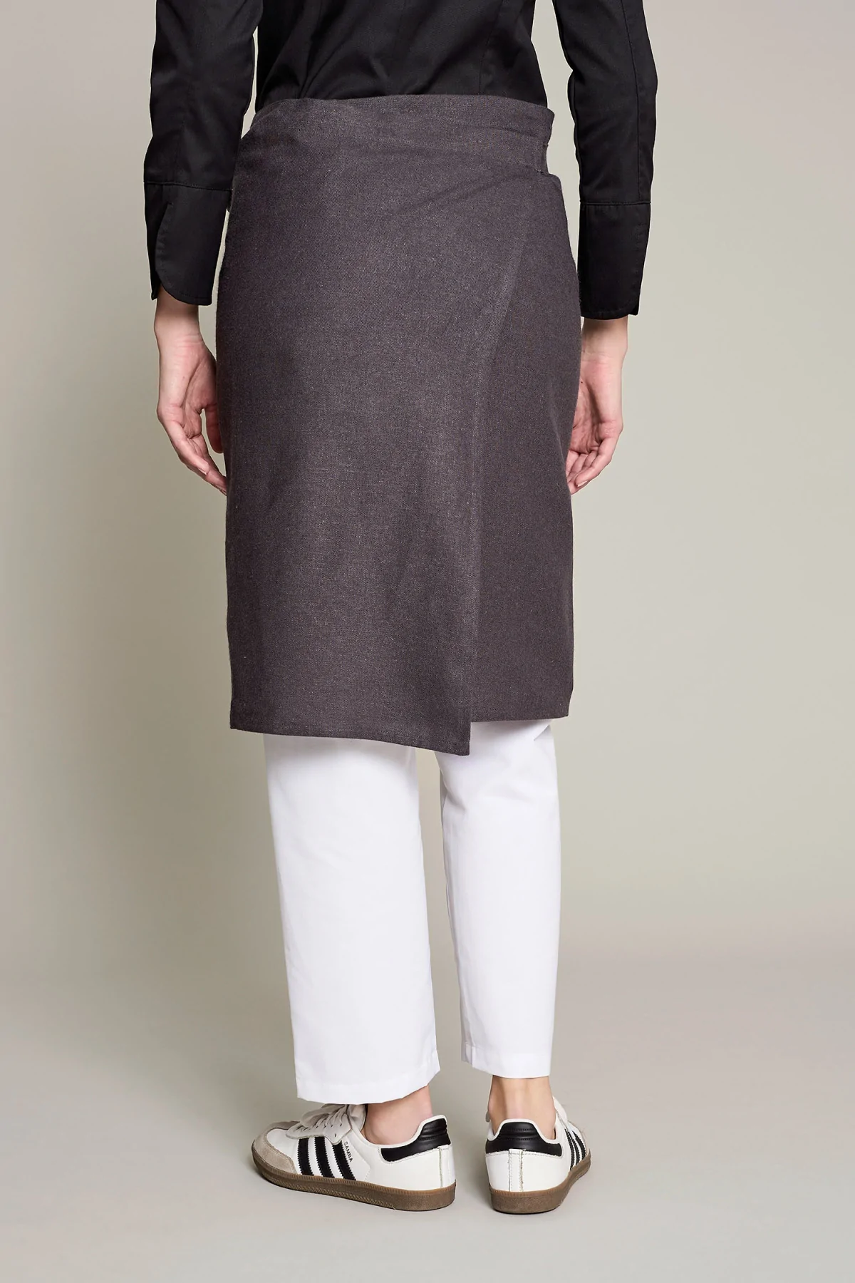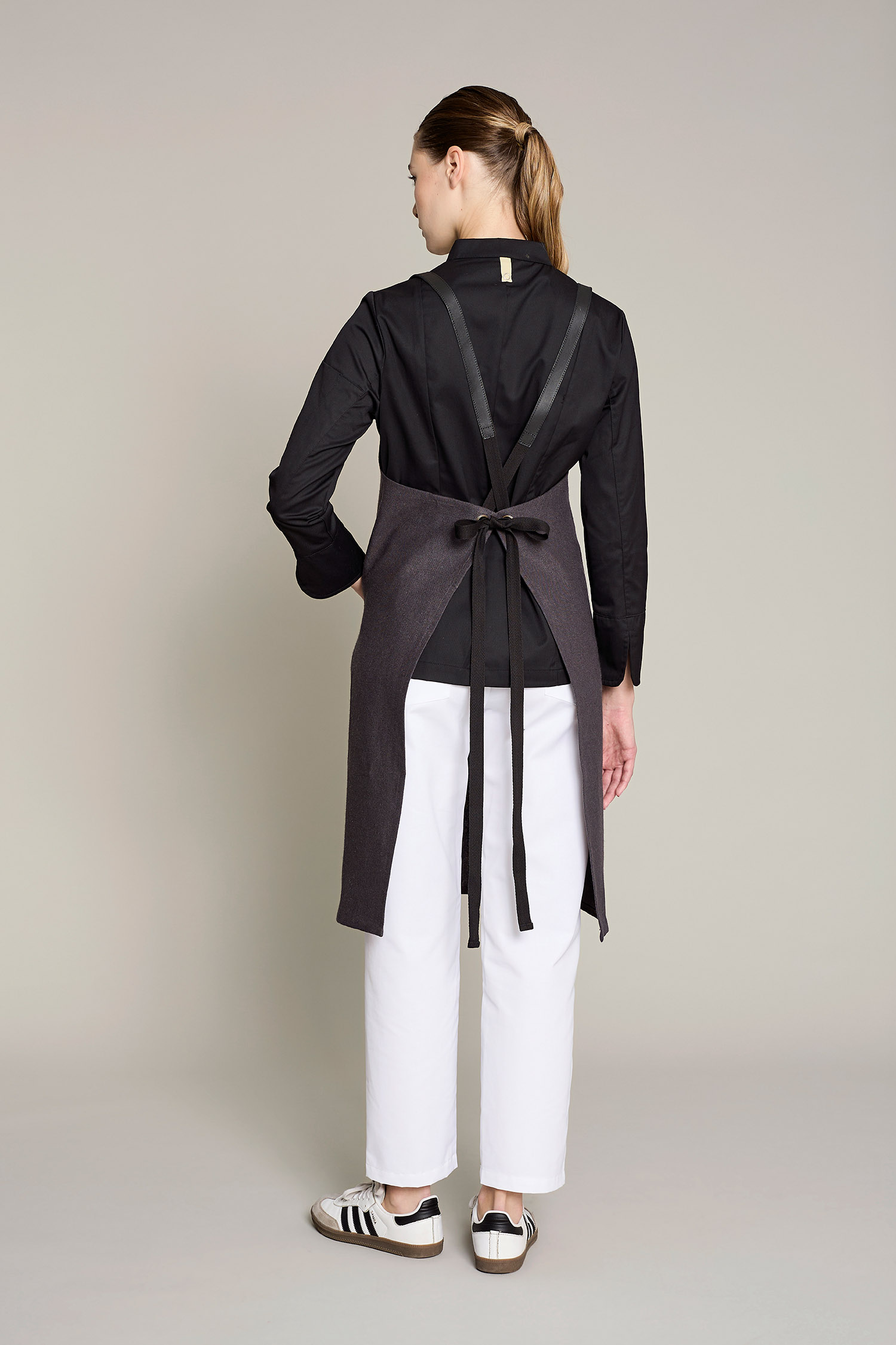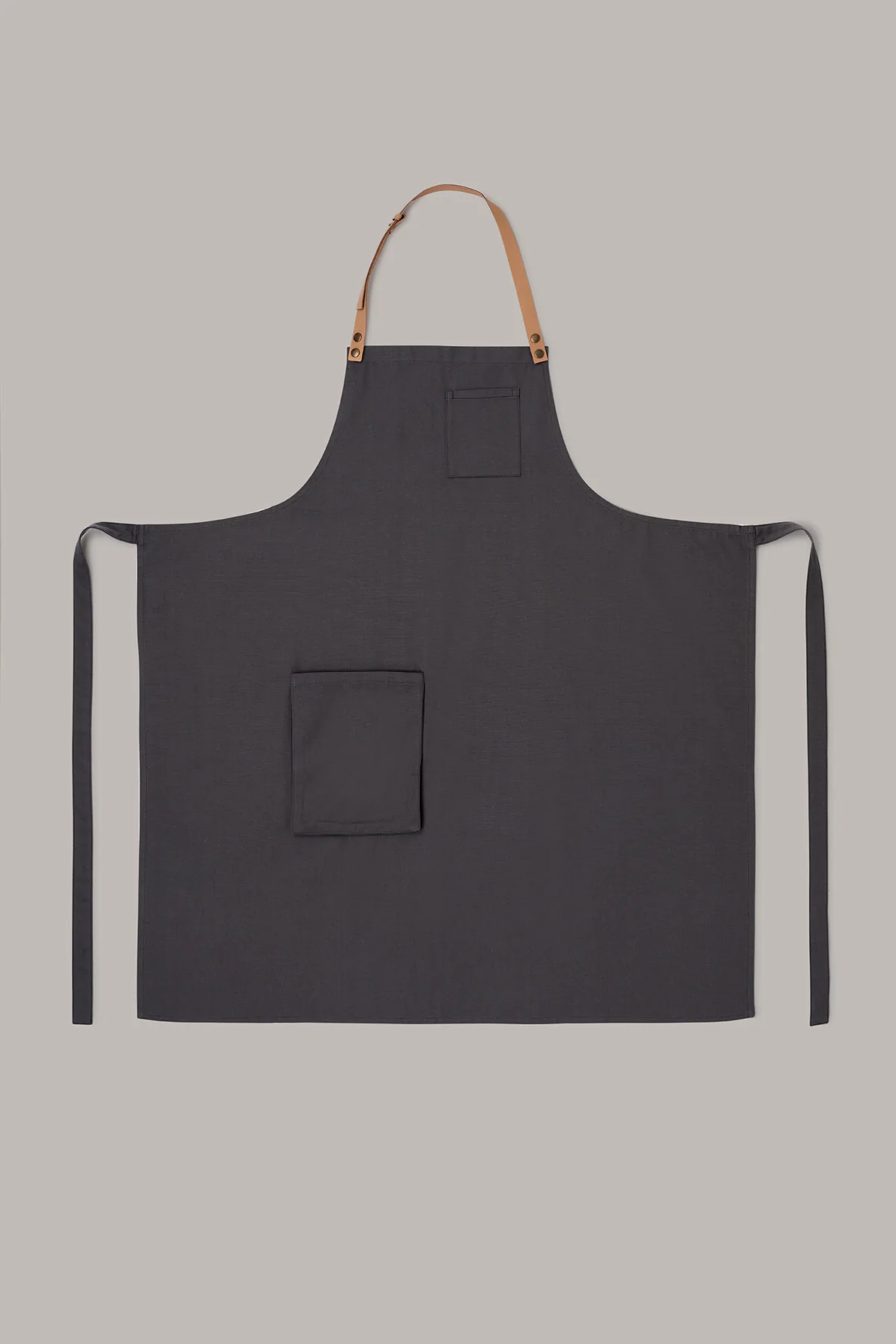 Delantal unisex en color gris con tira ajustable, en tejido orgánico, que ofrece comodidad y sostenibilidad