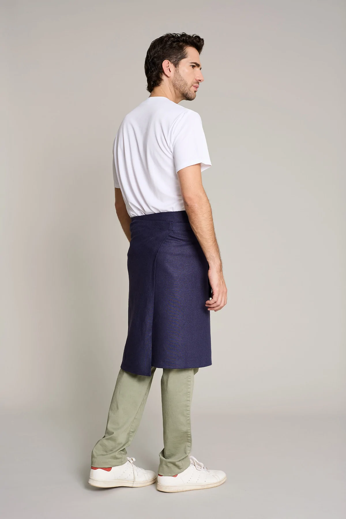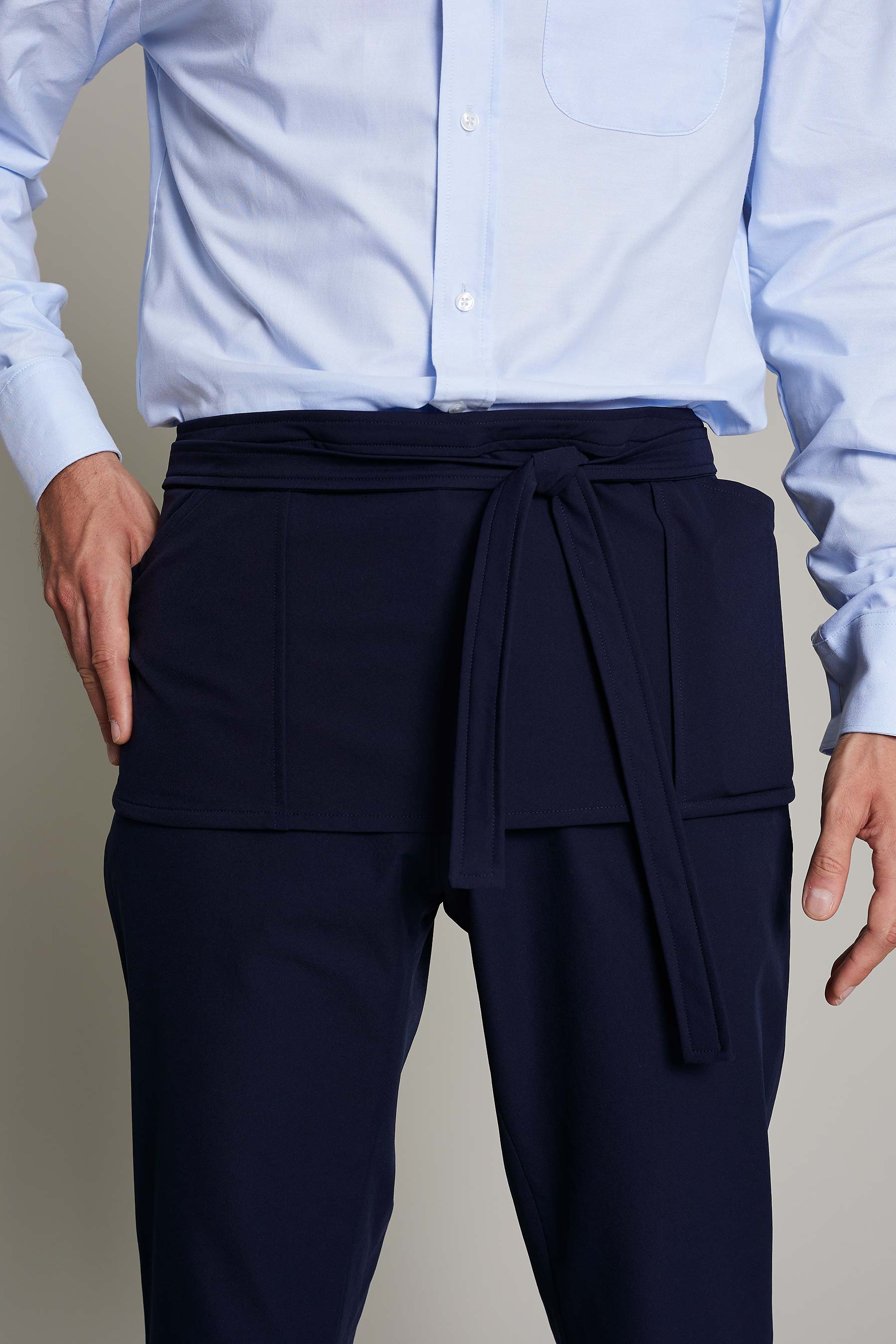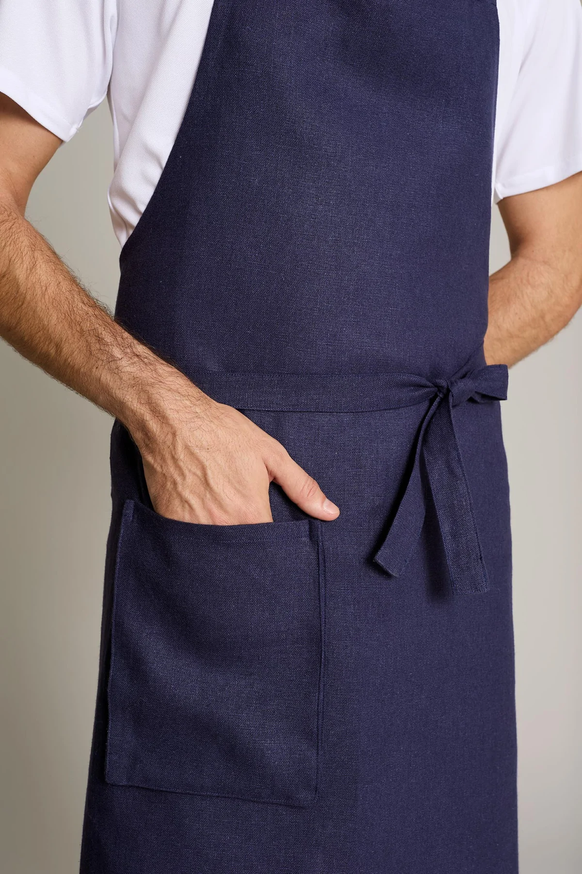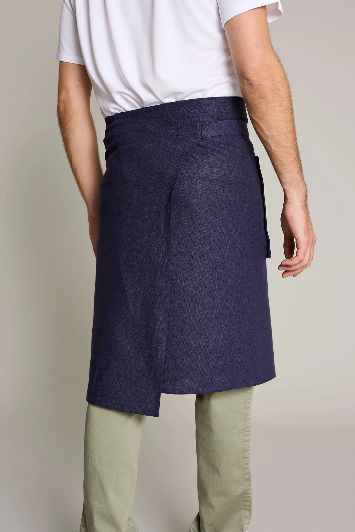 Delantal unisex en color lino azul con hebilla ajustable, ofrece comodidad y estilo en entornos laborales