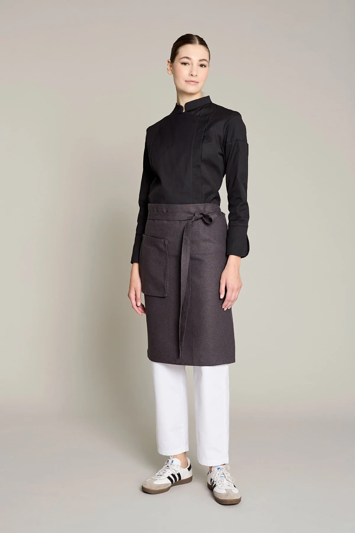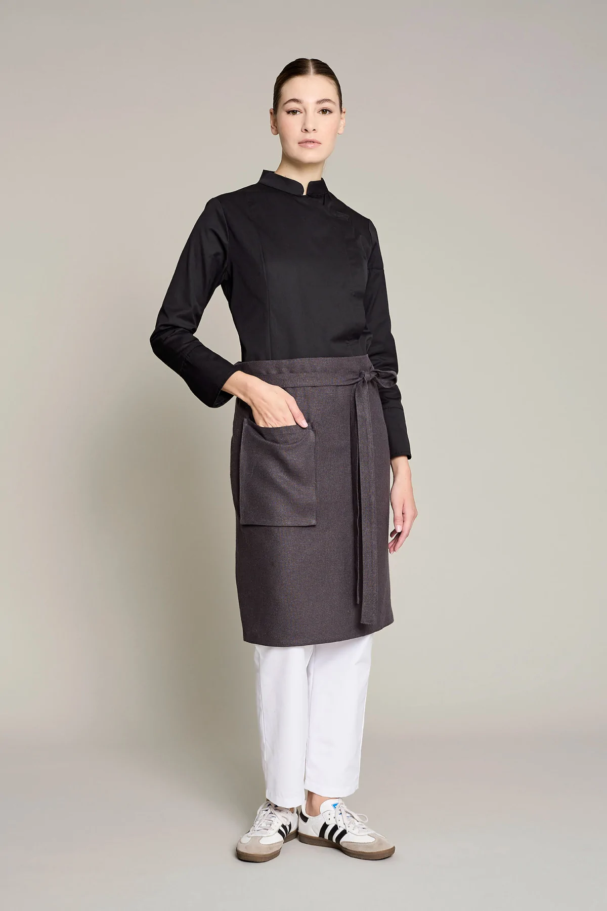 Mandil unisex en color gris, que ofrece comodidad y estilo en entornos laborales