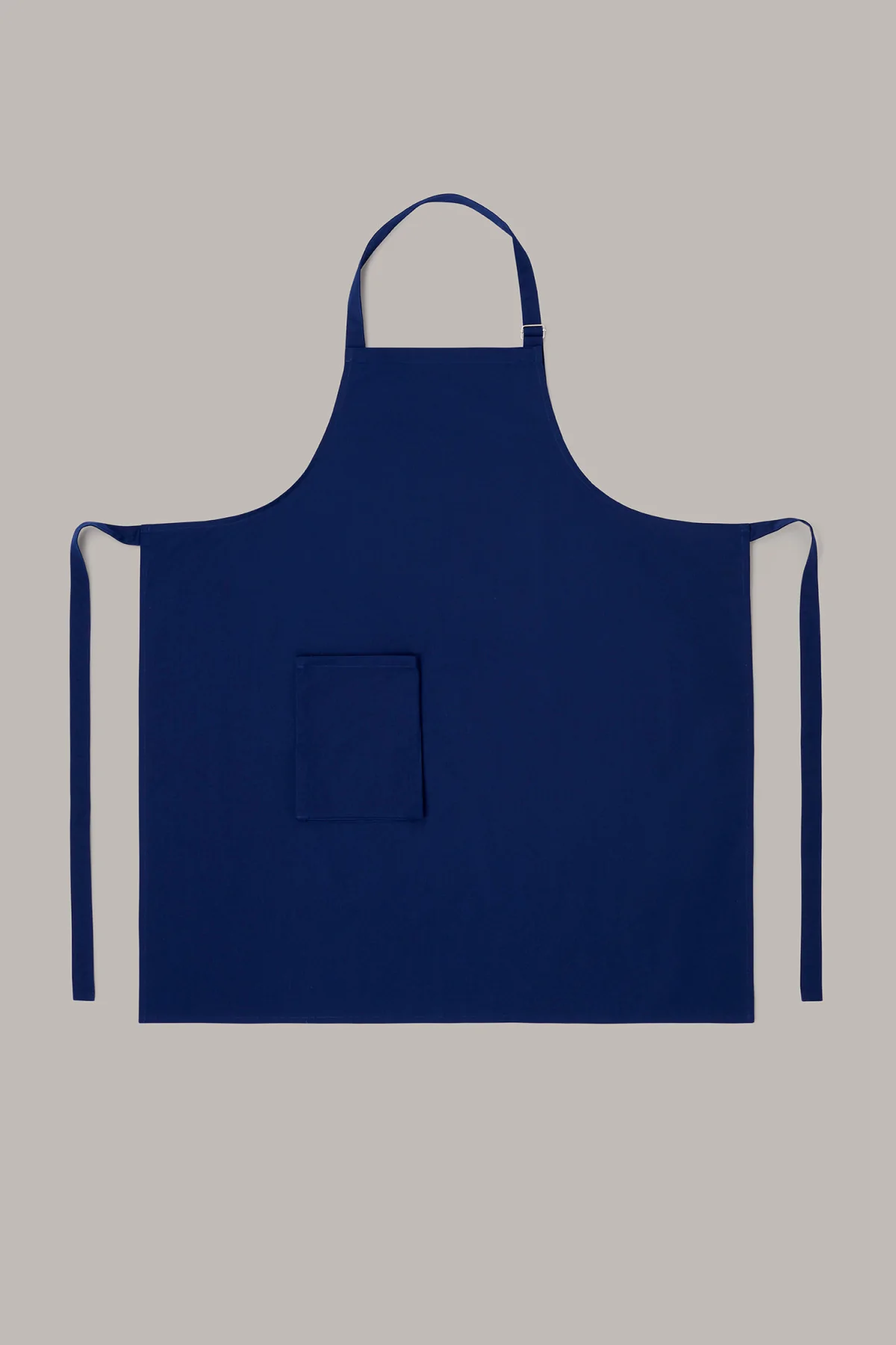 Delantal unisex en color azul con hebilla ajustable, en tejido orgánico y reciclado, que ofrece comodidad y sostenibilidad. No requiere plancha