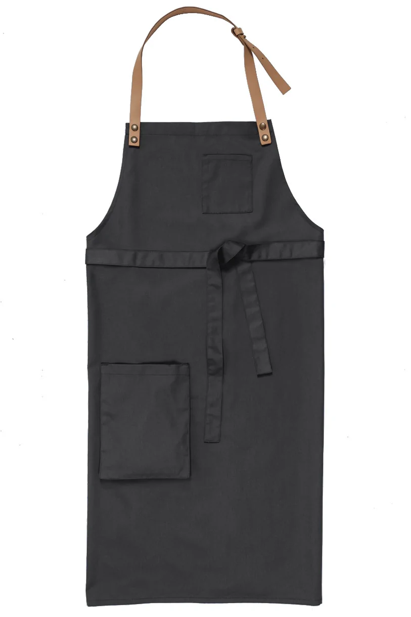 Delantal unisex en color gris con tira ajustable, ofrece comodidad y estilo en entornos laborales