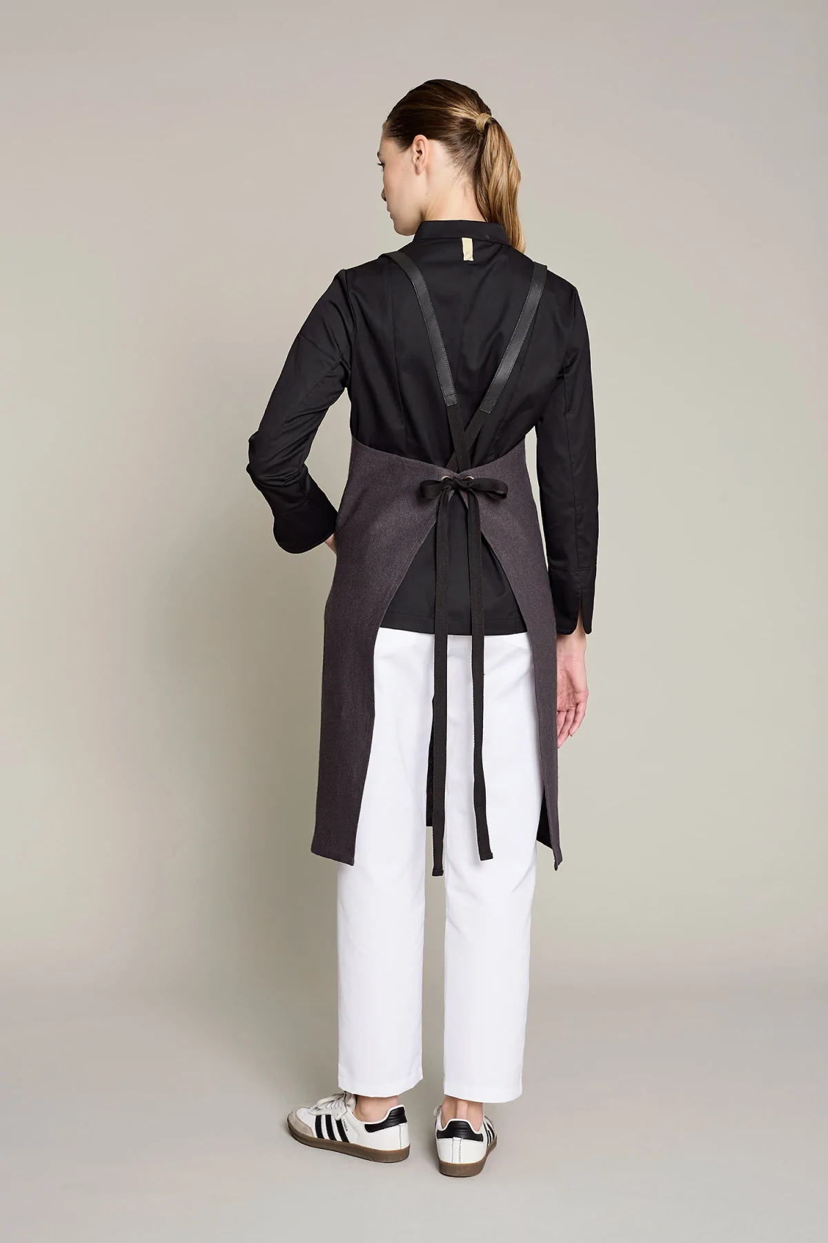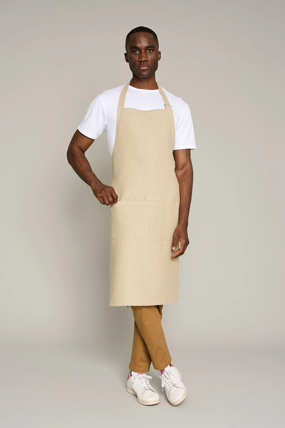 Delantal unisex en color lino natural con hebilla ajustable, ofrece comodidad y estilo en entornos laborales