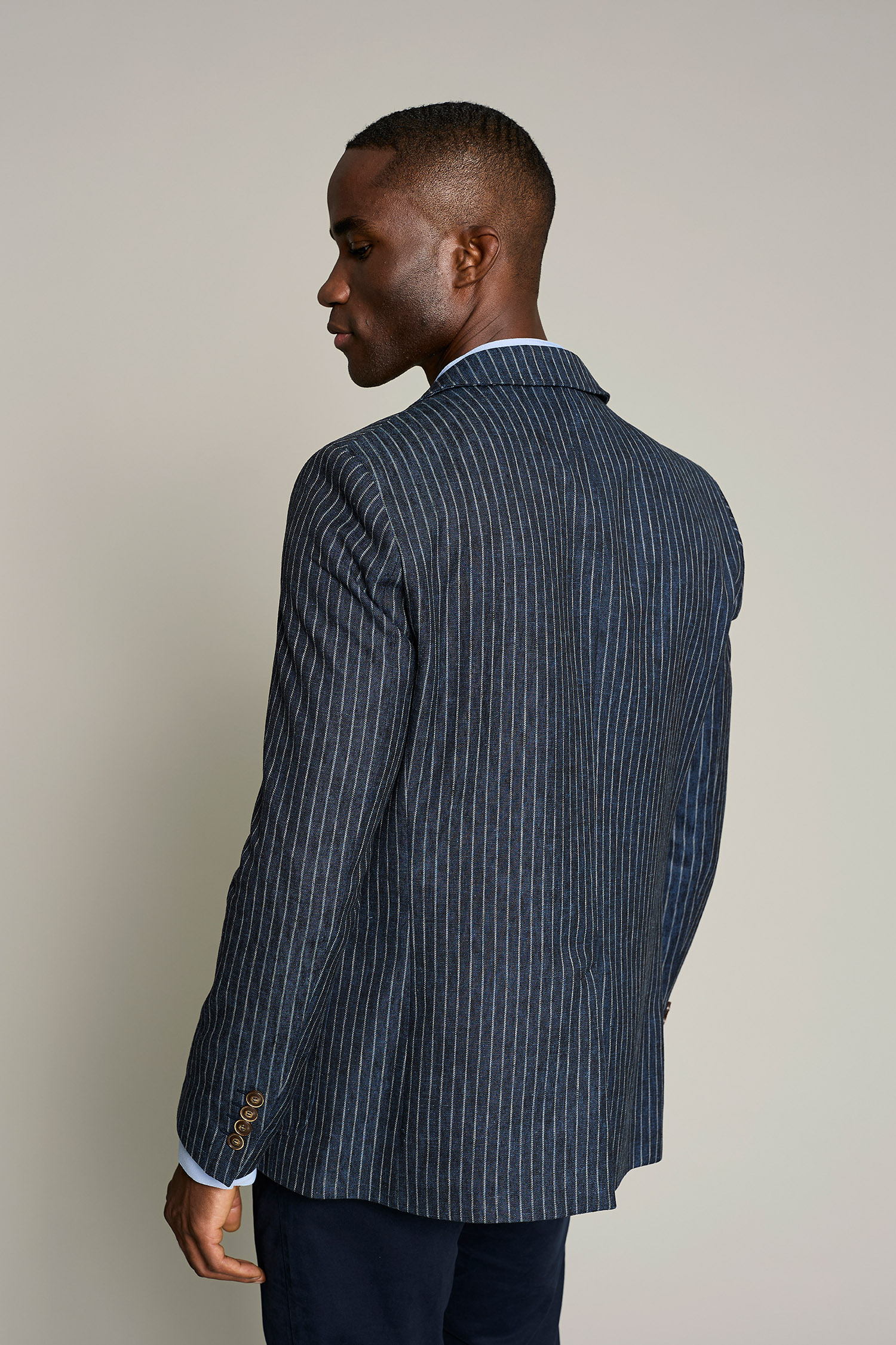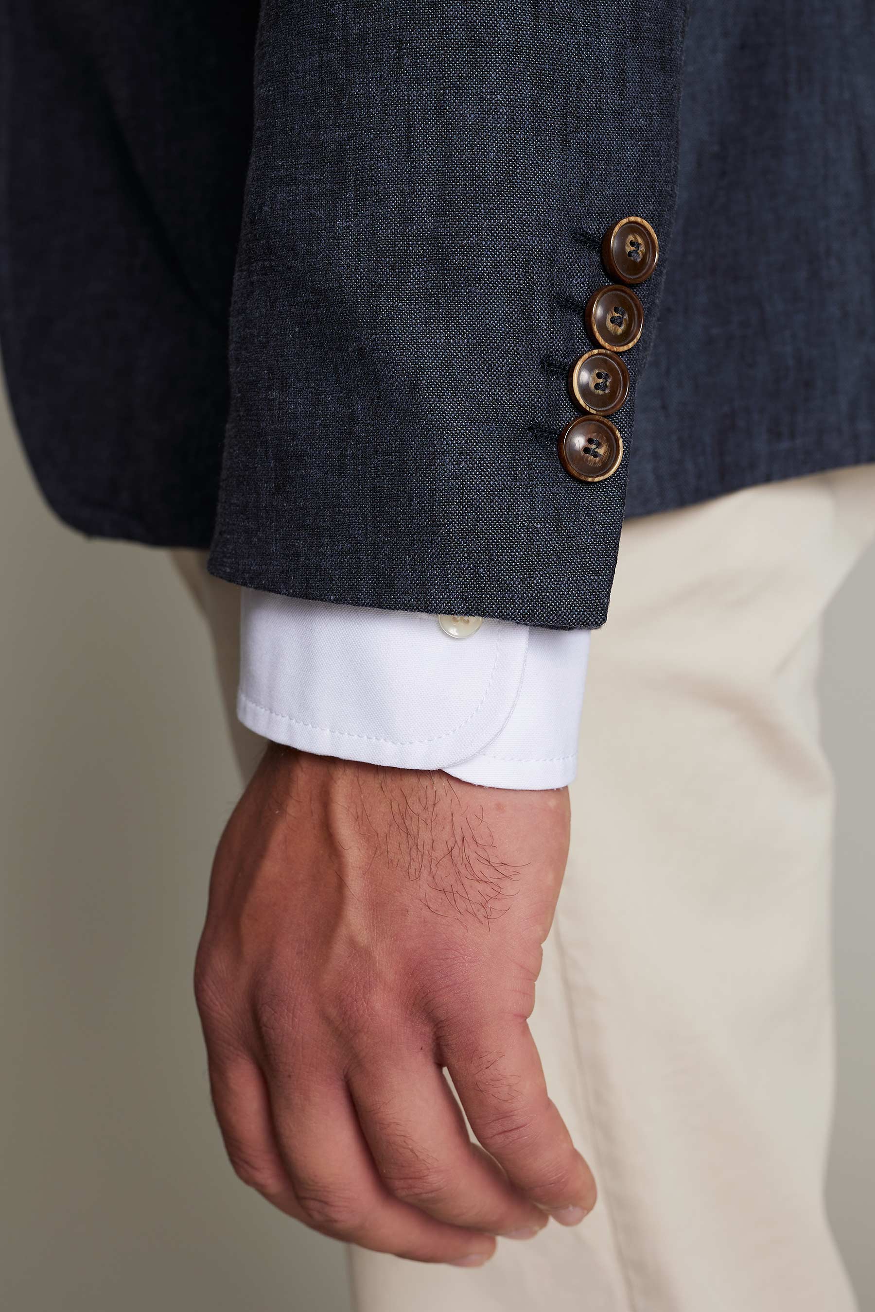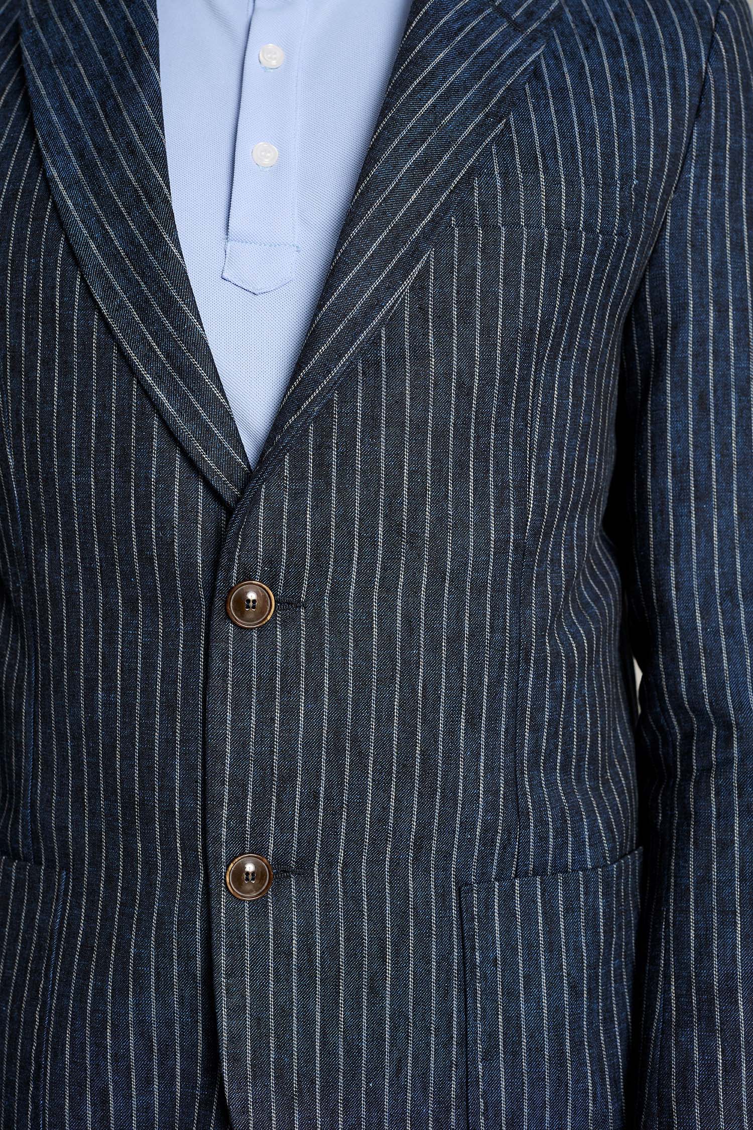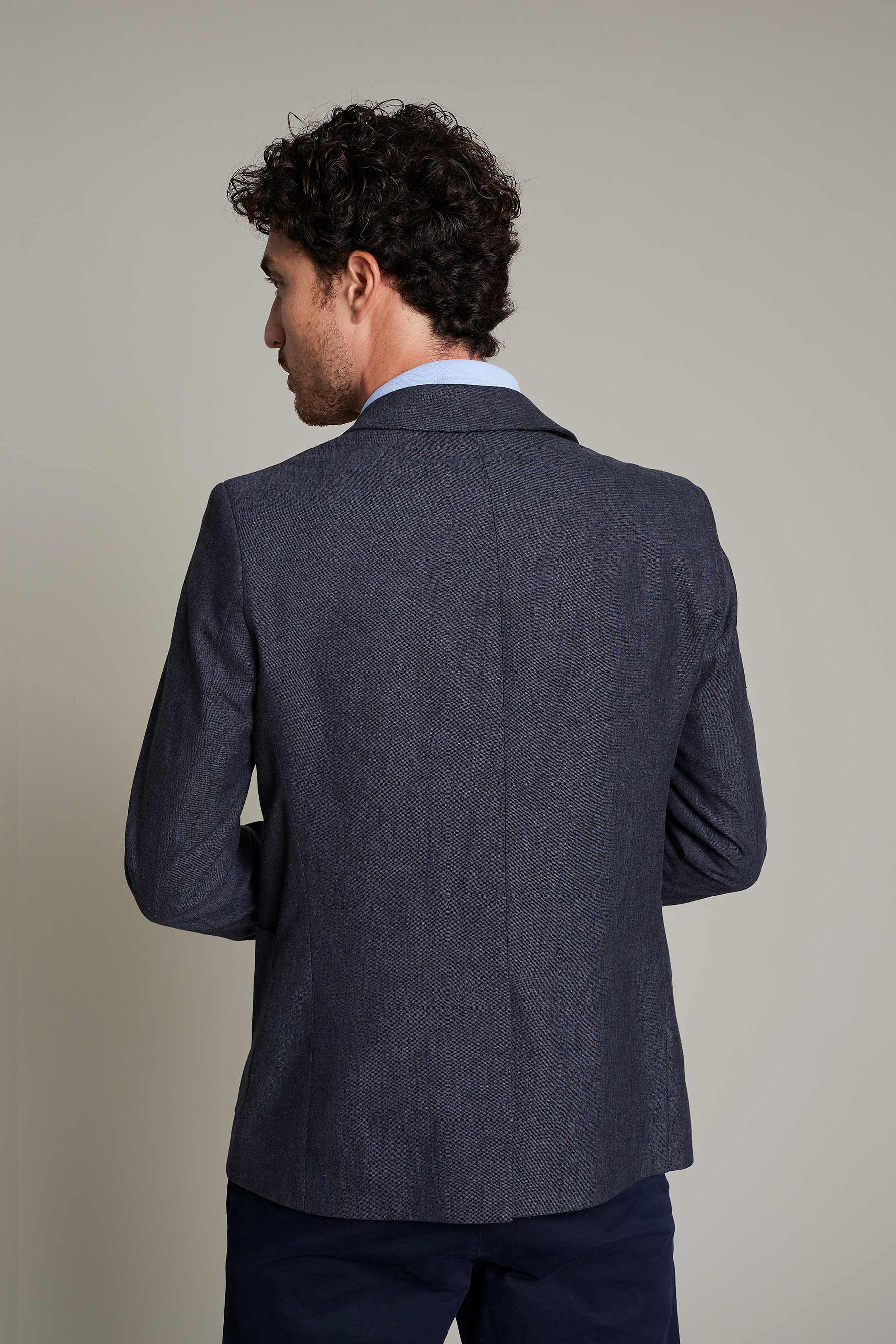 Americana sastre de hombre en color azul con tejido de lino, que ofrece confort y estilo para el trabajo. No requiere plancha
